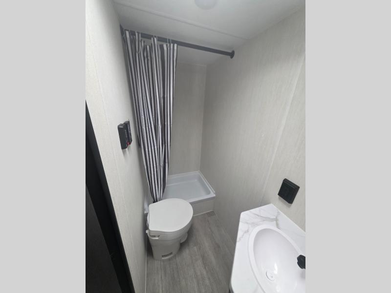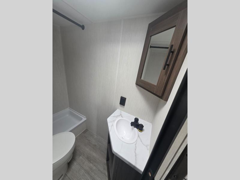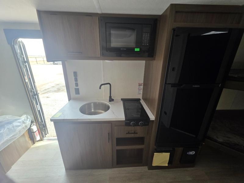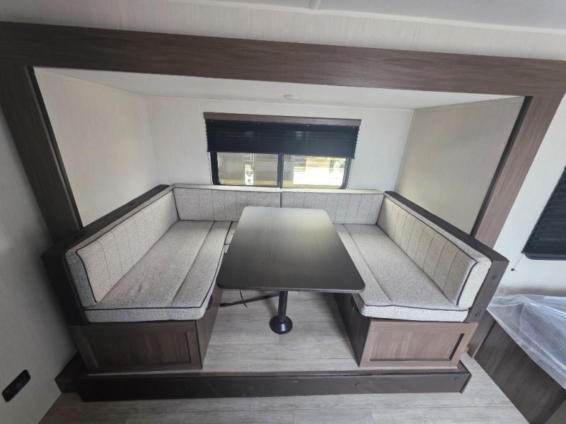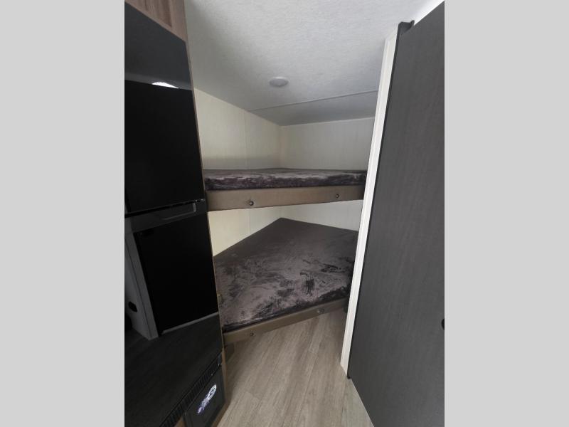Go hiking, biking or exploring for new places when you have this trailer at the campgrounds! You will find sleeping for the family between the rear corner bunk beds, and the front bed with a with a shelf for your belongings and such. And even more can sleep on the dinette slide. You'll be delighted to cook in the kitchen on the two-burner stove, and there is a farmhouse sink for easy clean-up. The power awning provides a protected outdoor living area as you visit or make s'mores around the campfire.