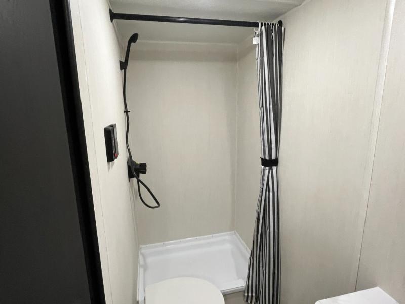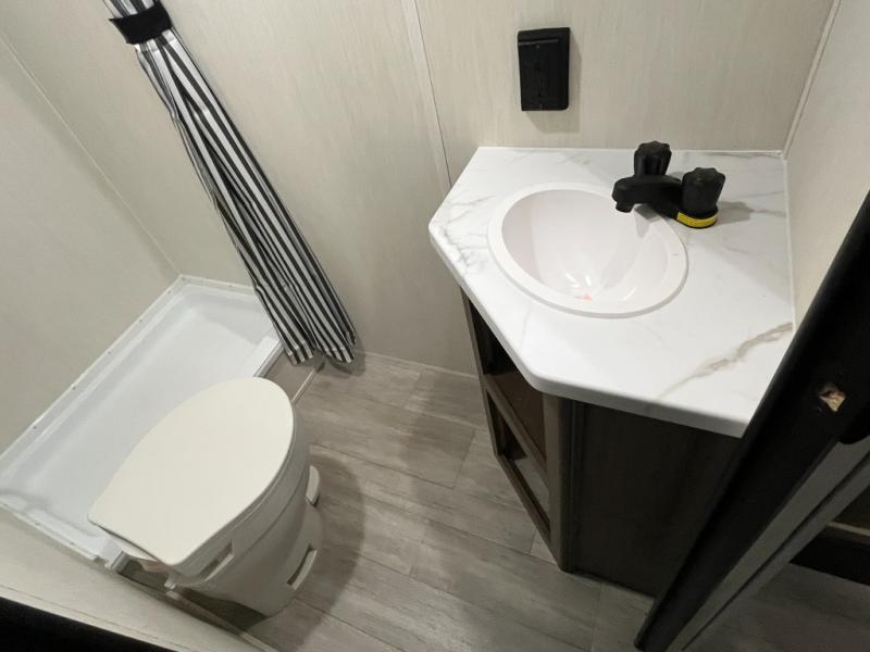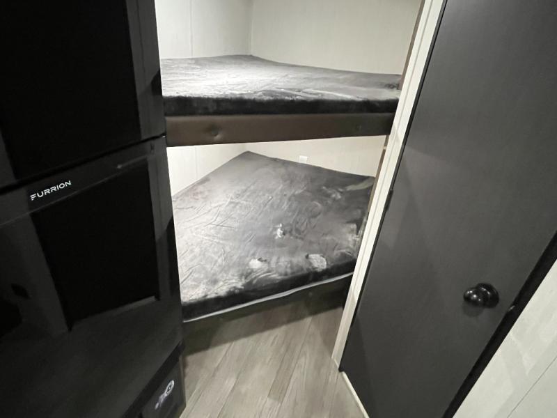 Go hiking, biking or exploring for new places when you have this trailer at the campgrounds! You will find sleeping for the family between the rear corner bunk beds, and the front bed with a with a shelf for your belongings and such. And even more can sleep on the dinette slide. You'll be delighted to cook in the kitchen on the two-burner stove, and there is a farmhouse sink for easy clean-up. The power awning provides a protected outdoor living area as you visit or make s'mores around the campfire.