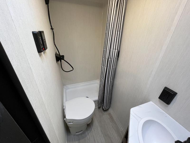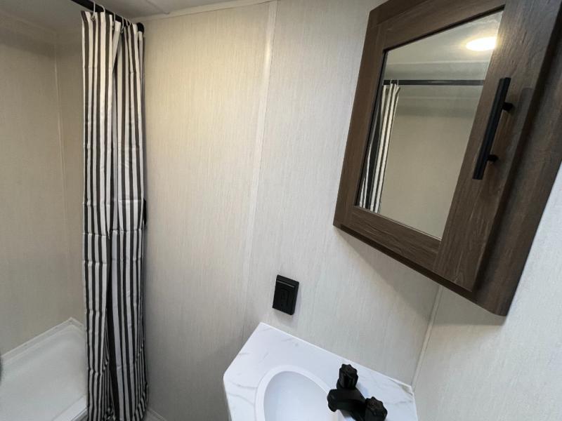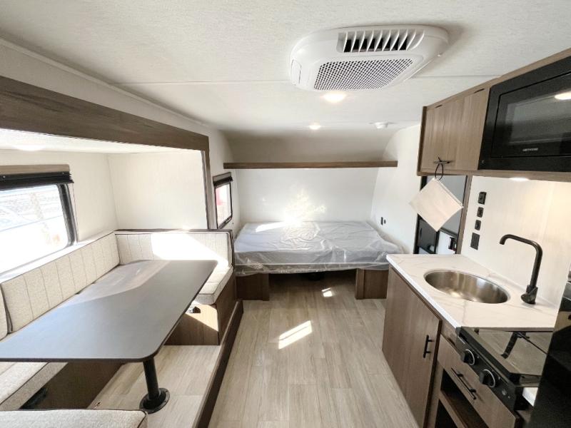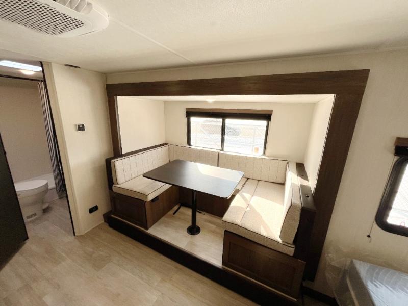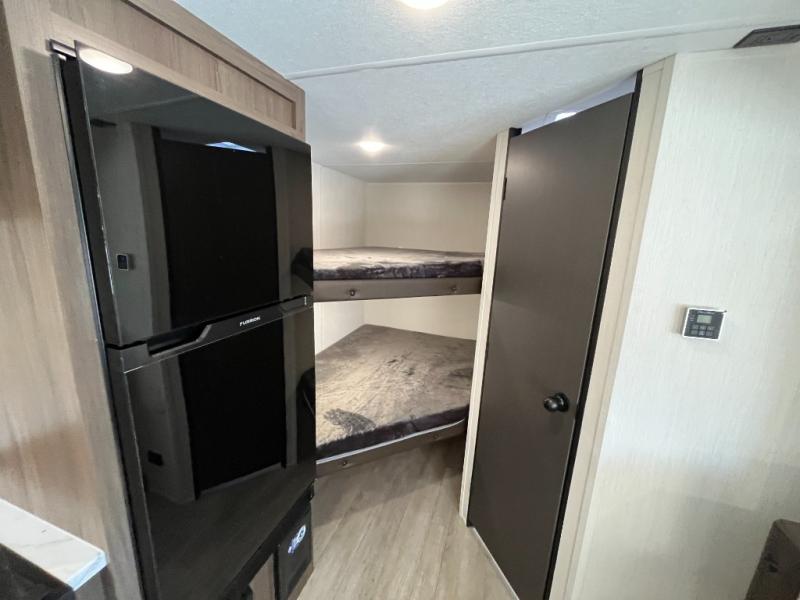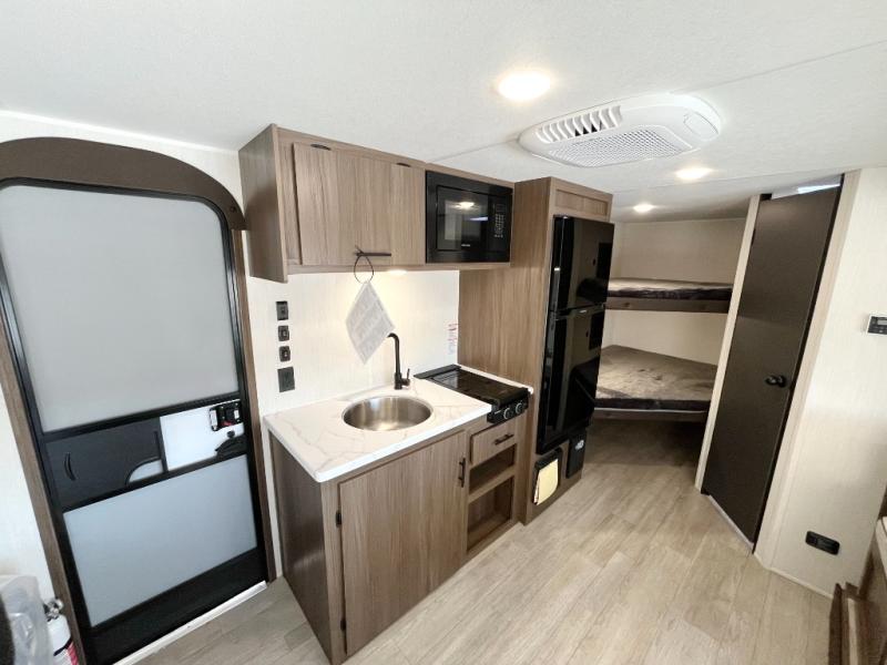 Go hiking, biking or exploring for new places when you have this trailer at the campgrounds! You will find sleeping for the family between the rear corner bunk beds, and the front bed with a with a shelf for your belongings and such. And even more can sleep on the dinette slide. You'll be delighted to cook in the kitchen on the two-burner stove, and there is a farmhouse sink for easy clean-up. The power awning provides a protected outdoor living area as you visit or make s'mores around the campfire.
