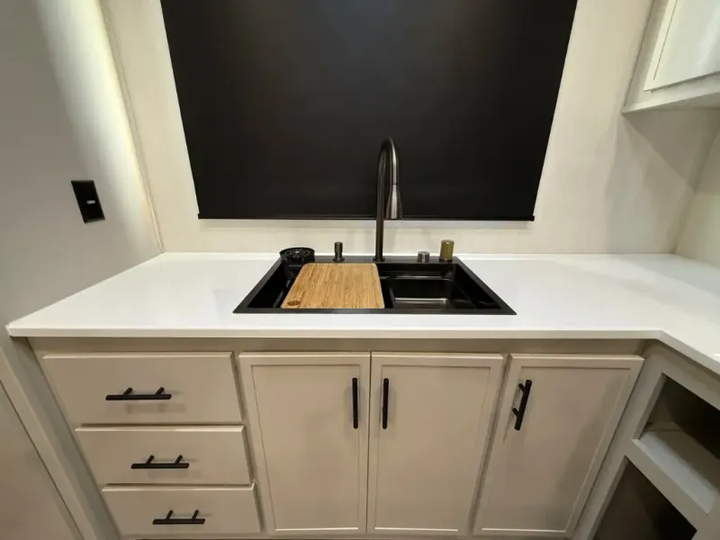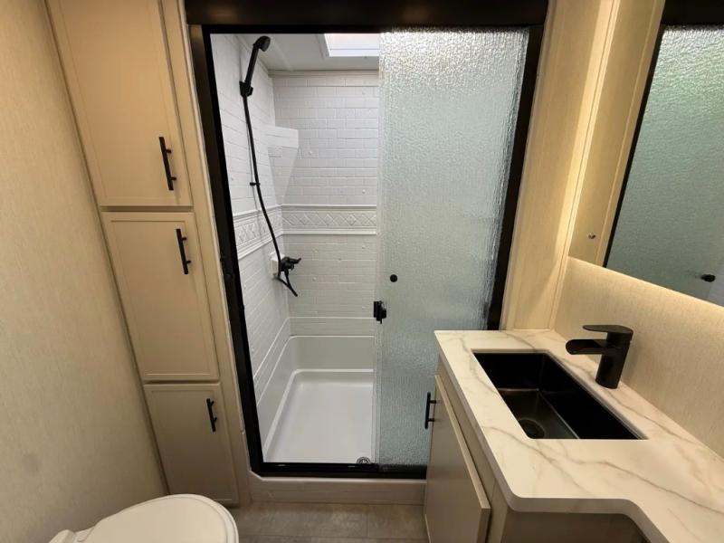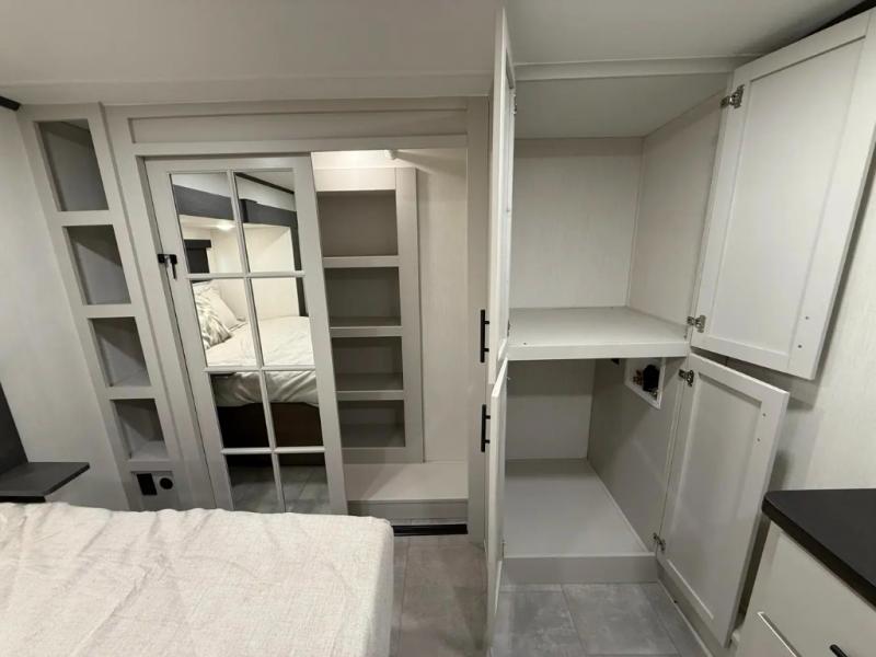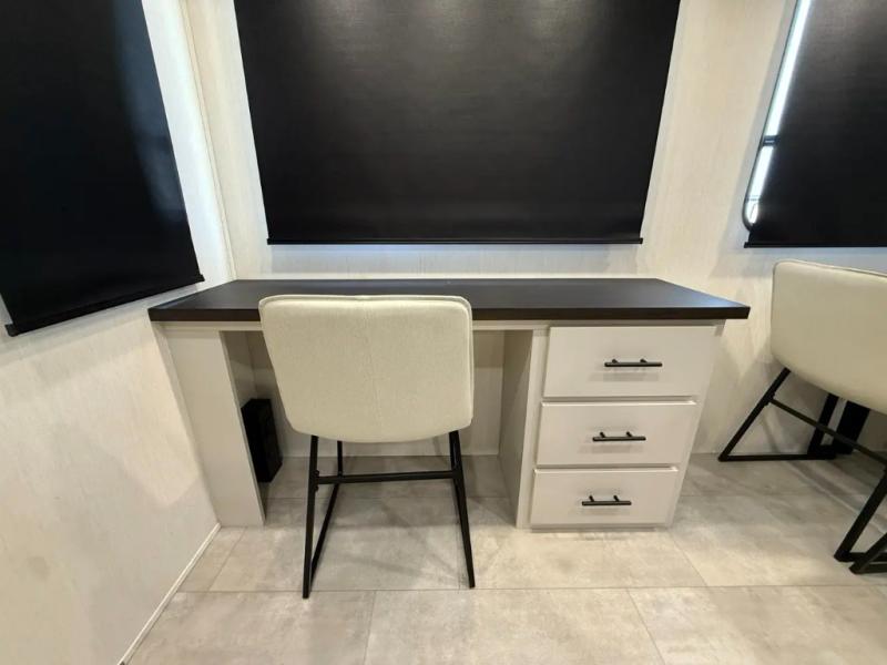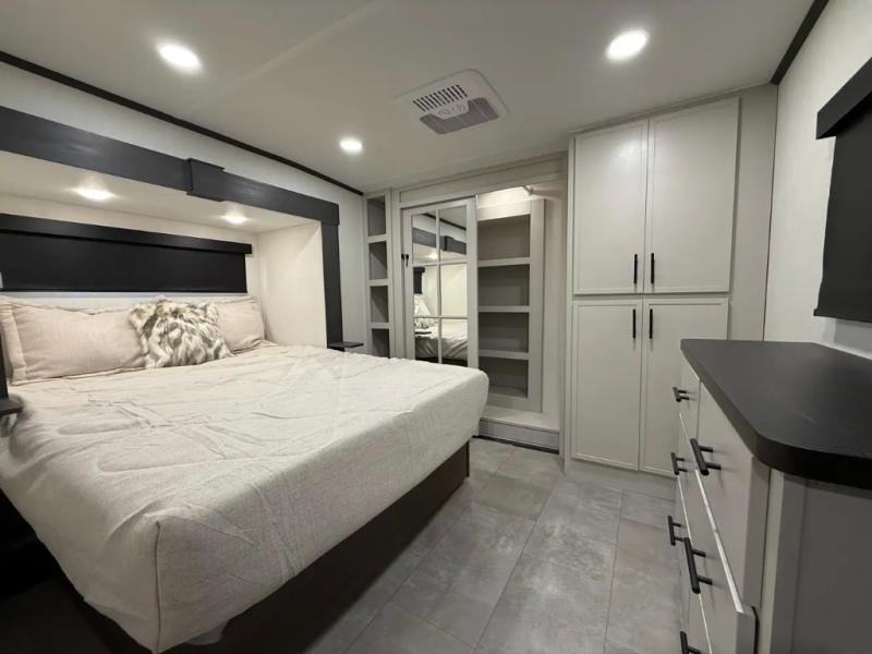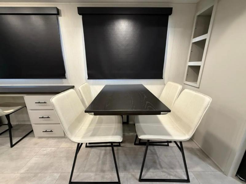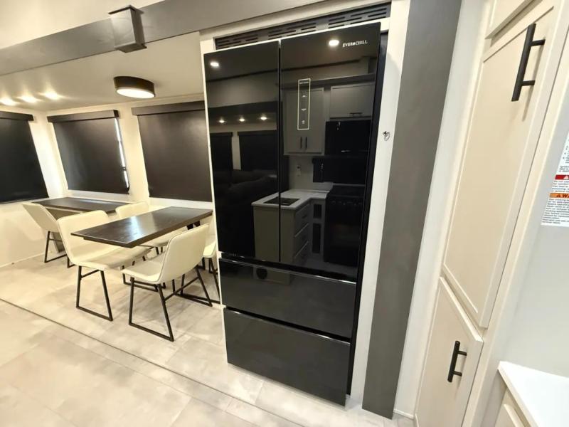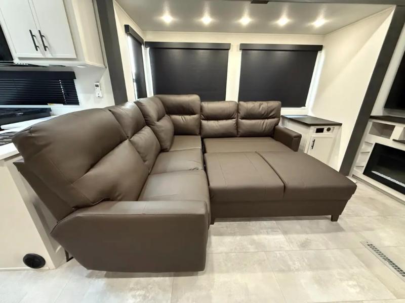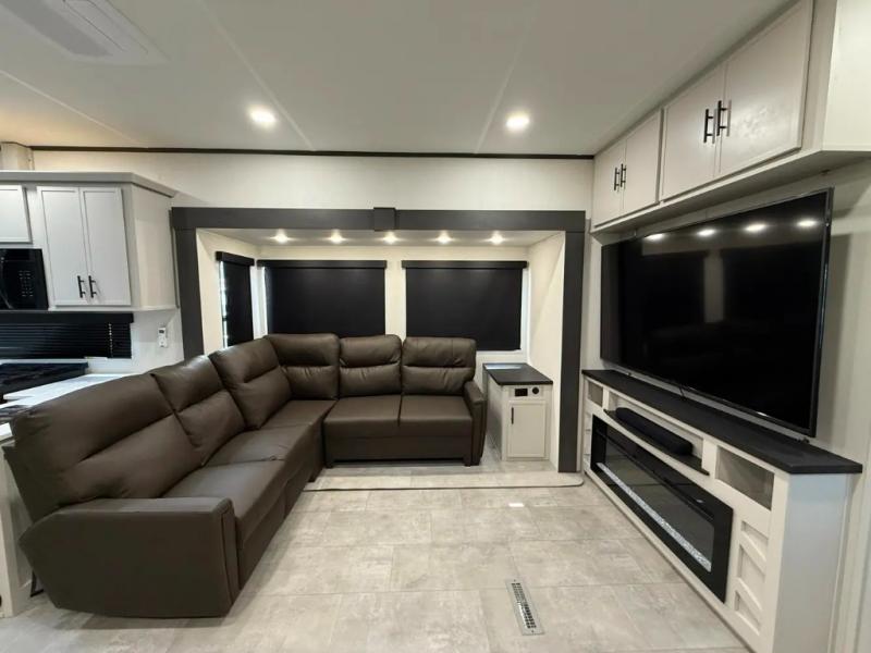 If you enjoy camping with family or friends, this fifth wheel is sure to meet all of your needs! The front bedroom includes a queen bed slide out for more space and comfort, plus a front wardrobe with washer and dryer prep. And the full bath is right next door for easy nighttime use. Your guests can utilize the middle bonus room that includes an E-Z glide sofa slide out, a private loft, and a half bath! The living room is made spacious thanks to the dual opposing slides, and you'll find a sectional sleeper sofa here, as well as desk with a chair and a free-standing table with chairs. And don't overlook the rear kitchen with ample counter space, a four burner range, an accessory sink and a French door 12V refrigerator!