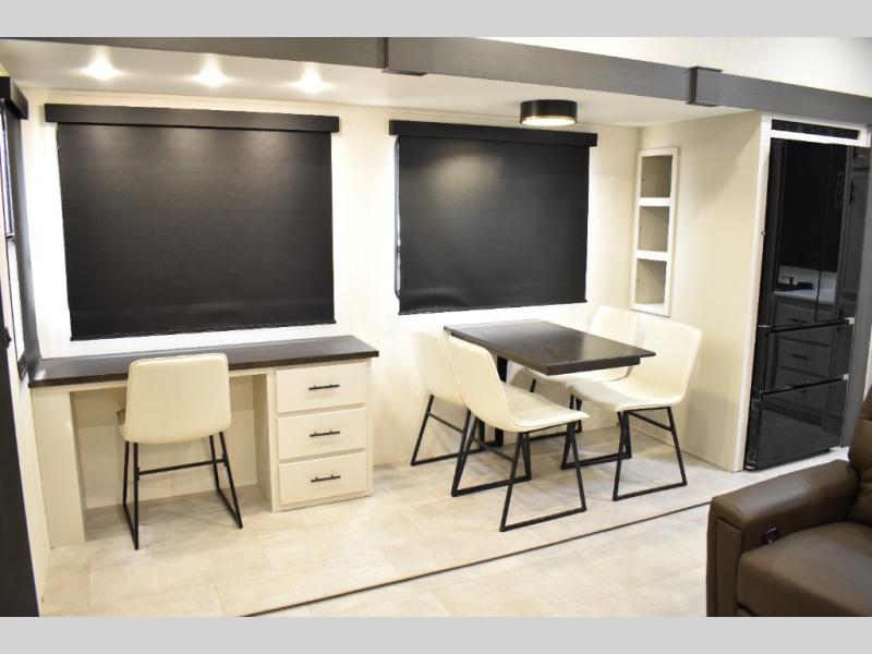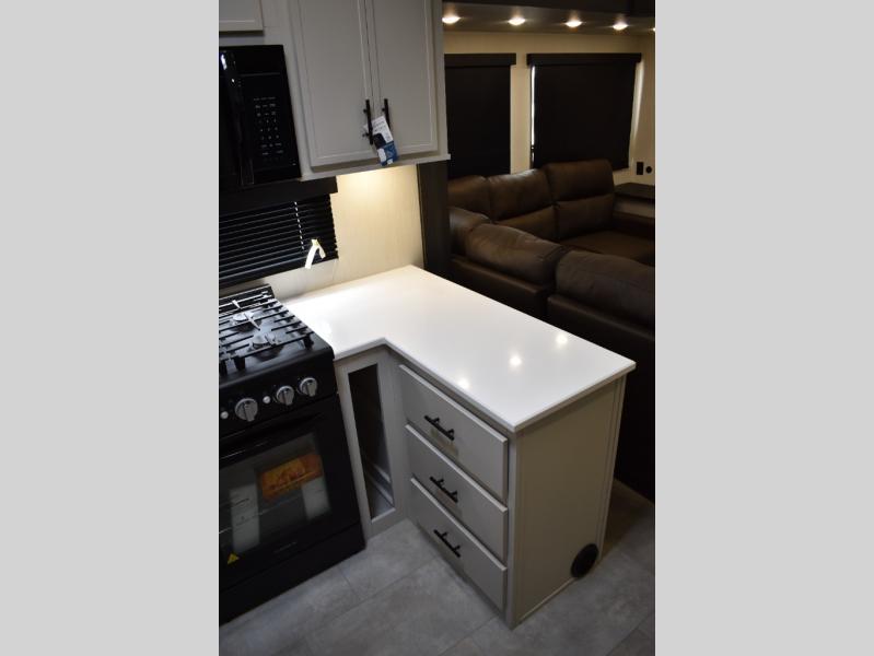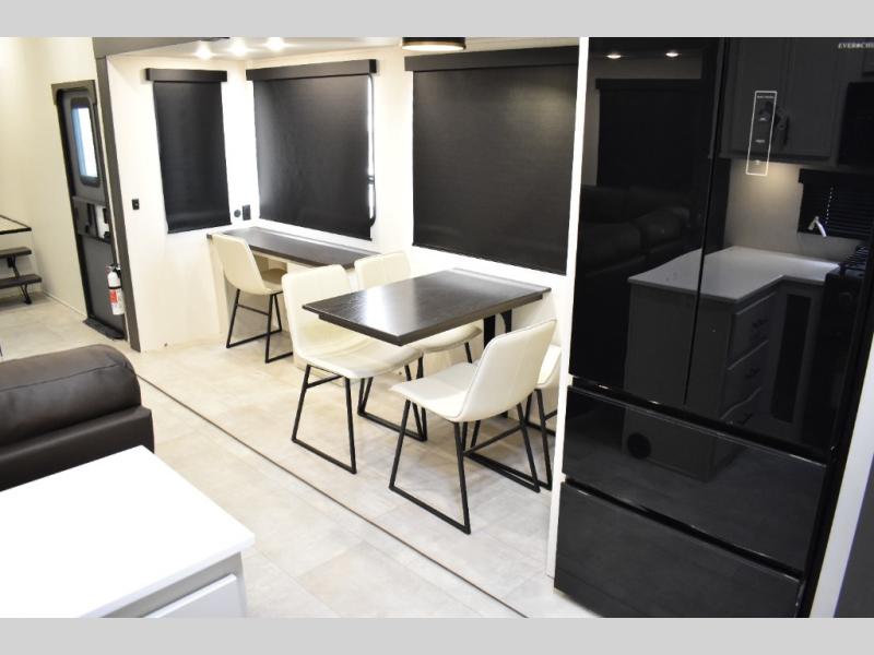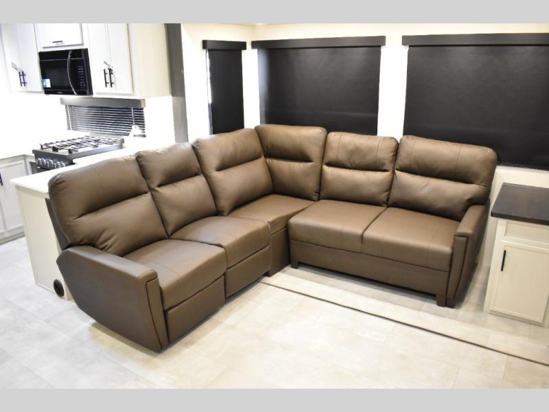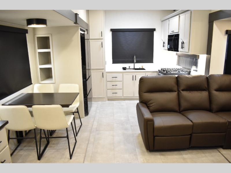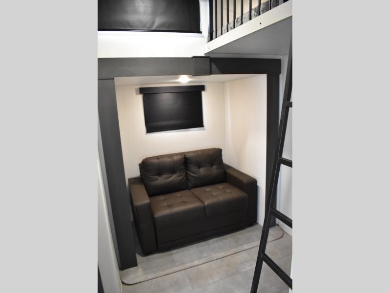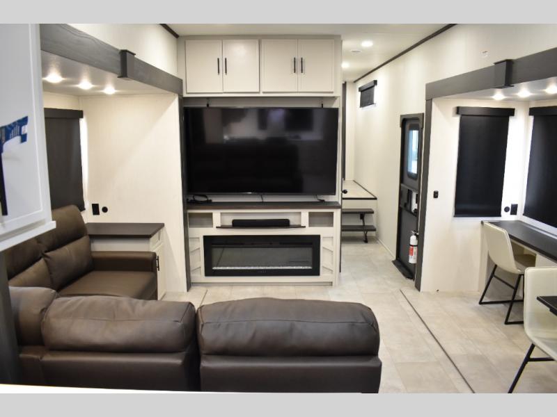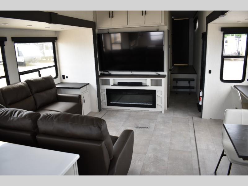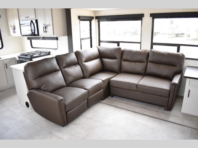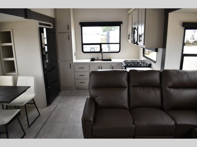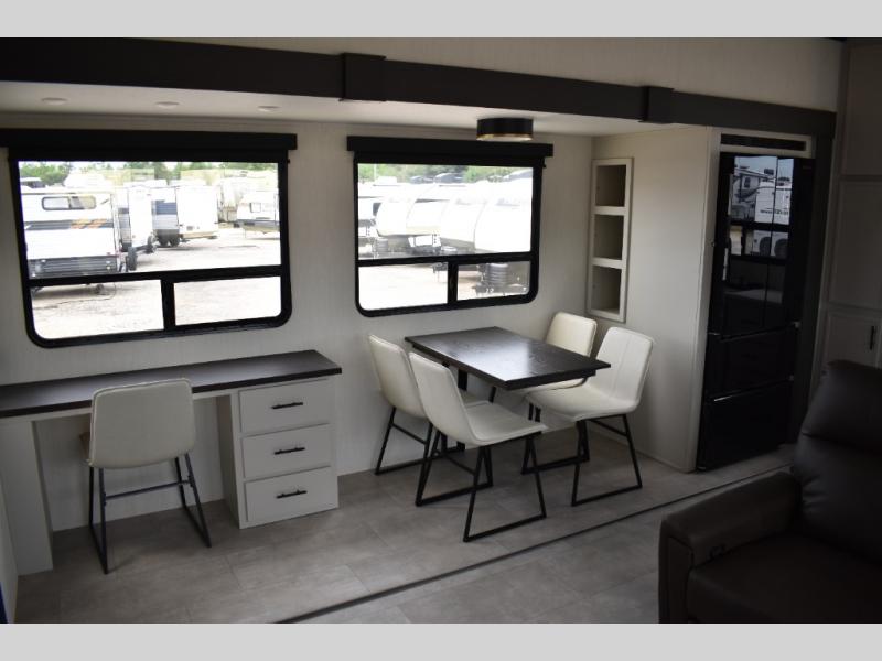If you enjoy camping with family or friends, this fifth wheel is sure to meet all of your needs! The front bedroom includes a queen bed slide out for more space and comfort, plus a front wardrobe with washer and dryer prep. And the full bath is right next door for easy nighttime use. Your guests can utilize the middle bonus room that includes an E-Z glide sofa slide out, a private loft, and a half bath! The living room is made spacious thanks to the dual opposing slides, and you'll find a sectional sleeper sofa here, as well as desk with a chair and a free-standing table with chairs. And don't overlook the rear kitchen with ample counter space, a four burner range, an accessory sink and a French door 12V refrigerator!