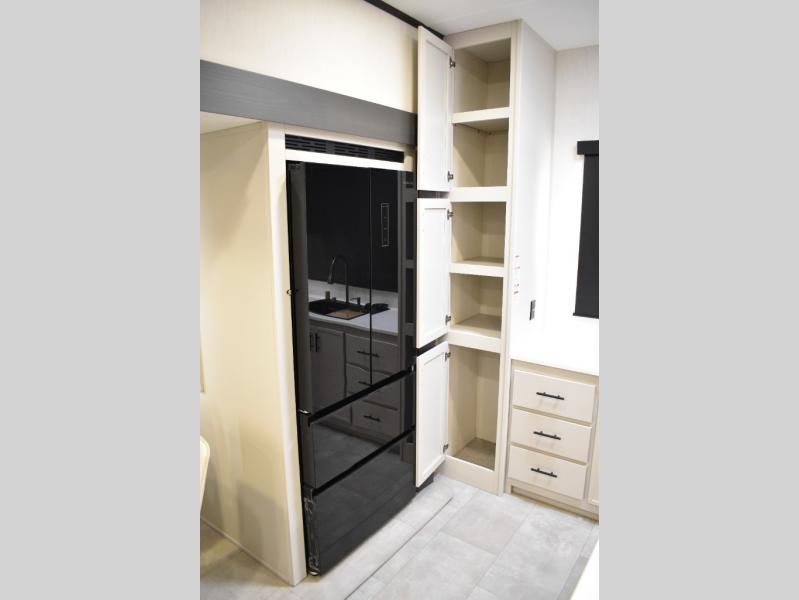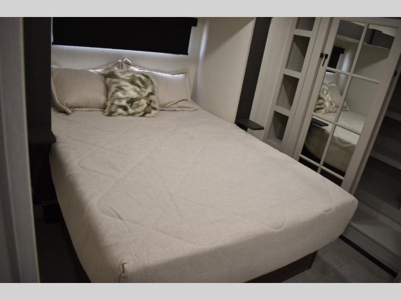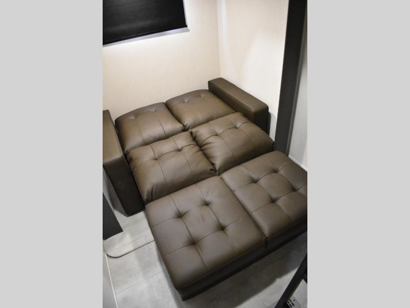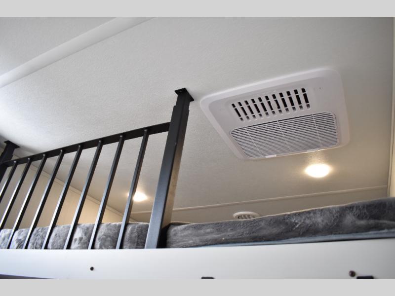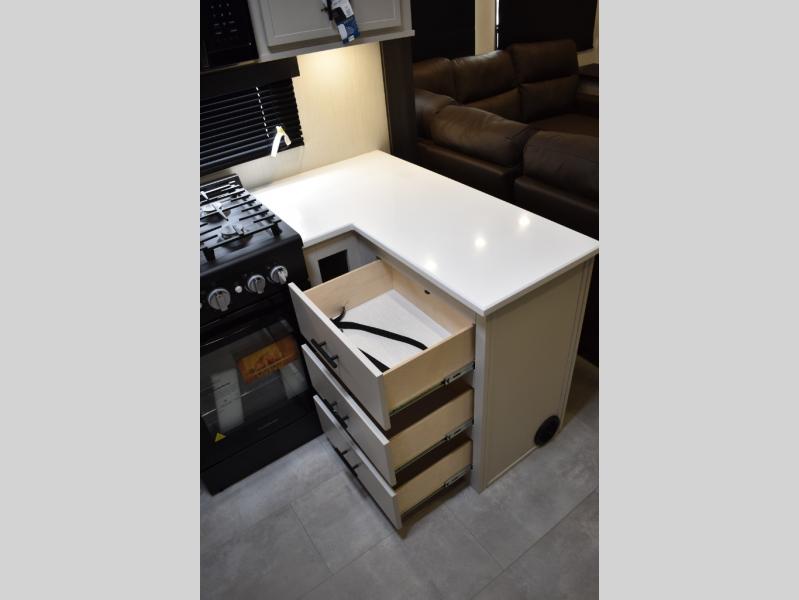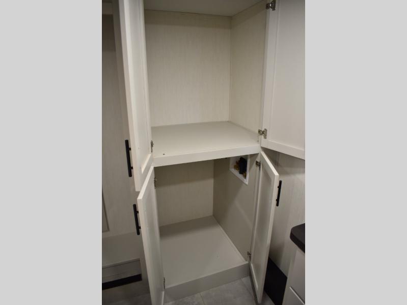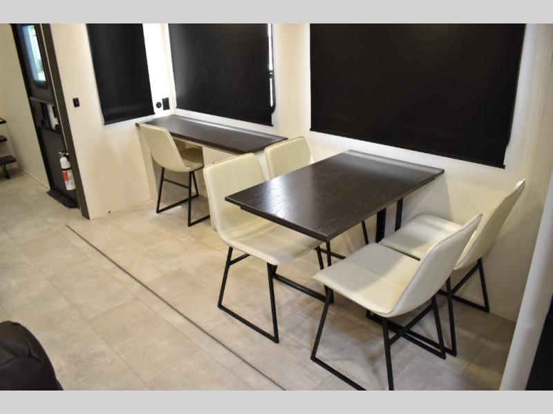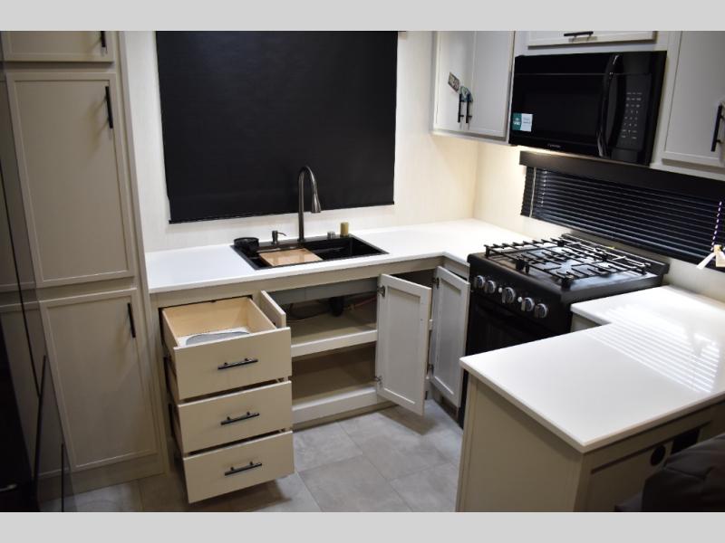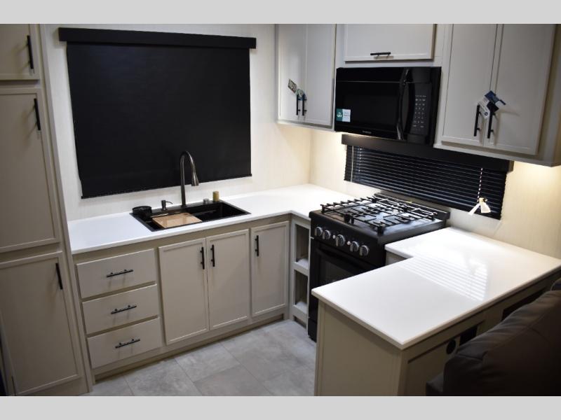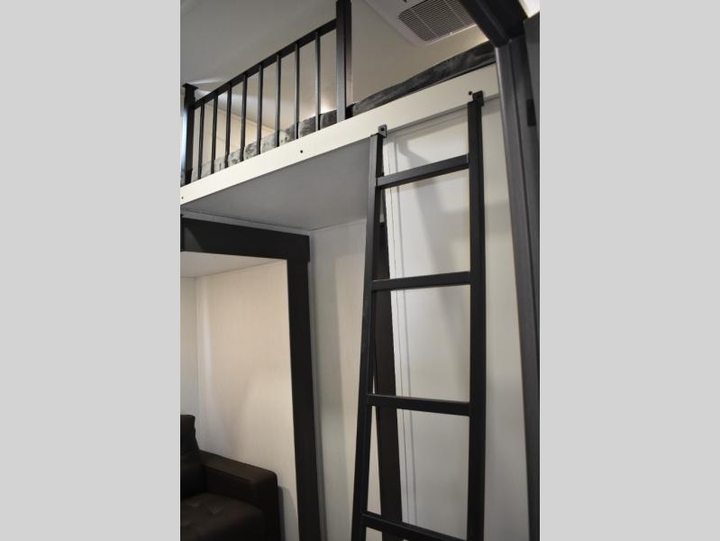 If you enjoy camping with family or friends, this fifth wheel is sure to meet all of your needs! The front bedroom includes a queen bed slide out for more space and comfort, plus a front wardrobe with washer and dryer prep. And the full bath is right next door for easy nighttime use. Your guests can utilize the middle bonus room that includes an E-Z glide sofa slide out, a private loft, and a half bath! The living room is made spacious thanks to the dual opposing slides, and you'll find a sectional sleeper sofa here, as well as desk with a chair and a free-standing table with chairs. And don't overlook the rear kitchen with ample counter space, a four burner range, an accessory sink and a French door 12V refrigerator!
