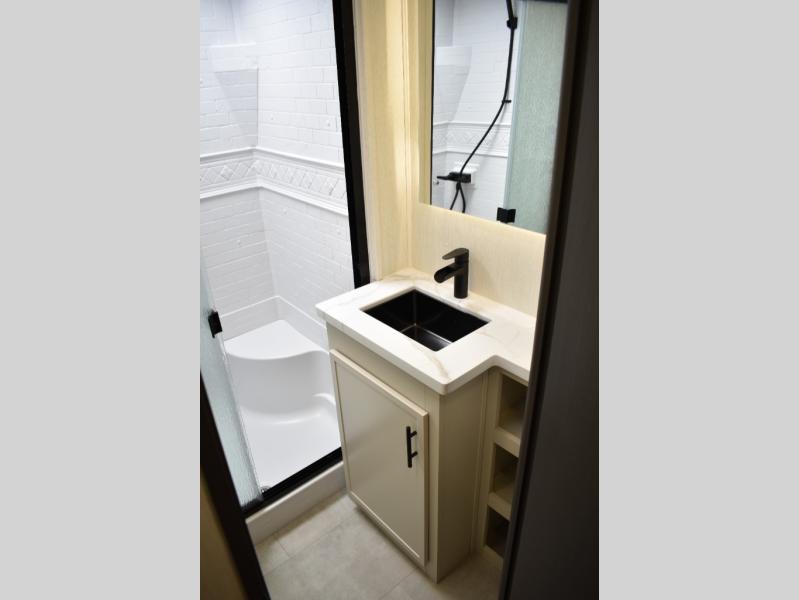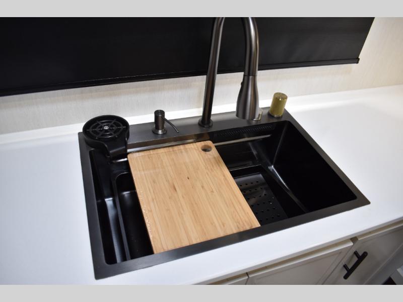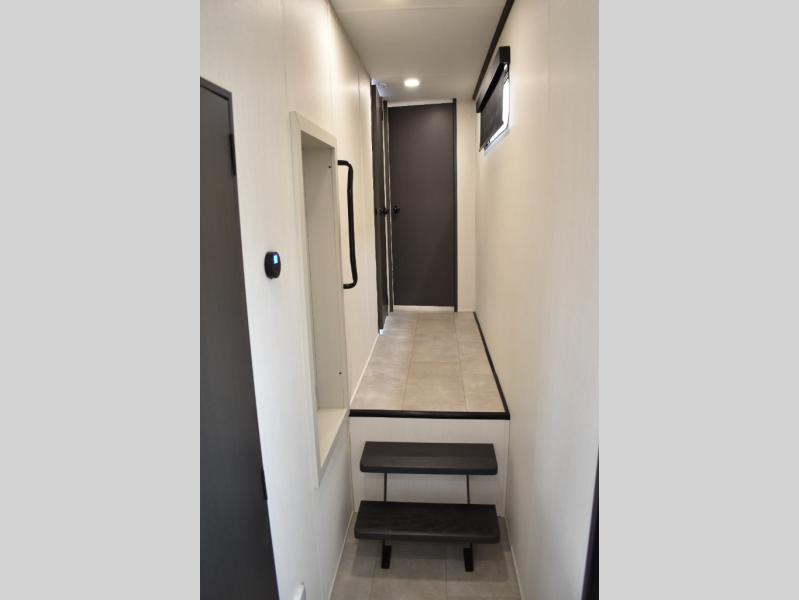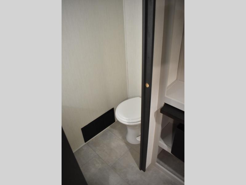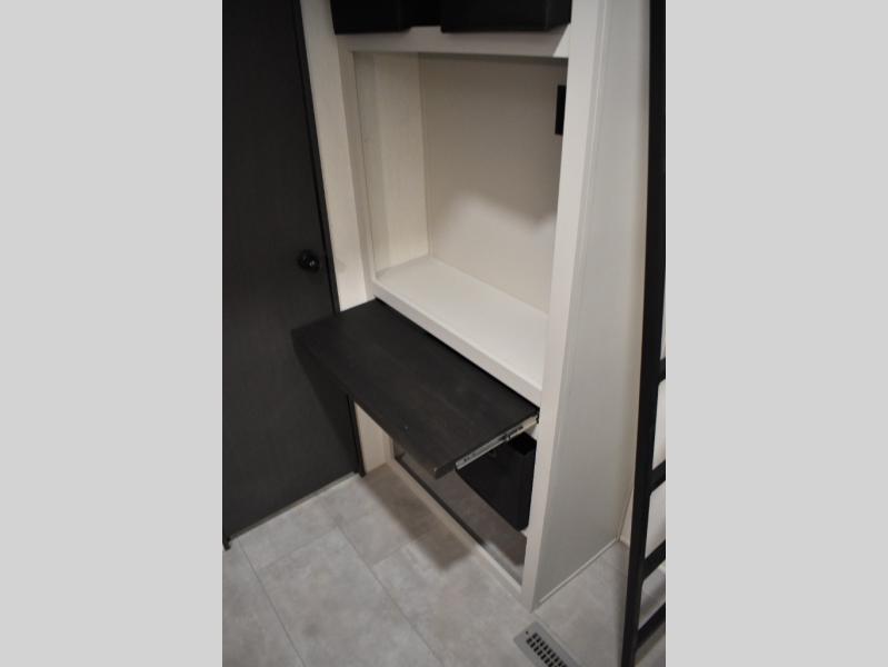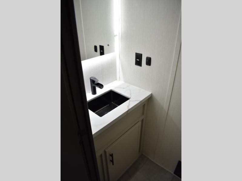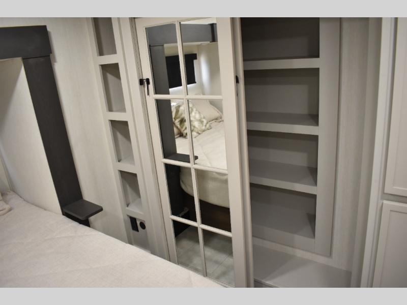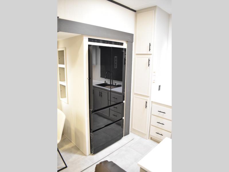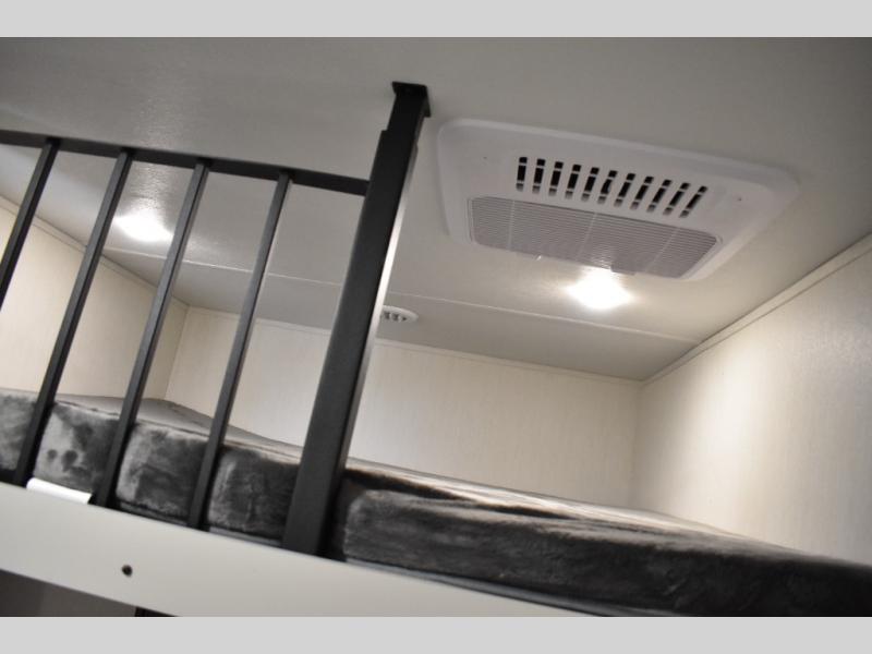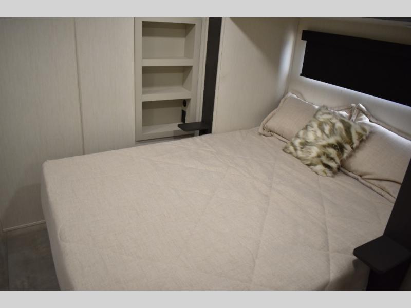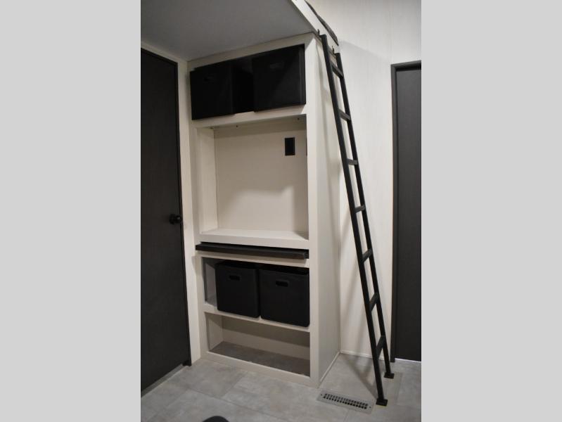 If you enjoy camping with family or friends, this fifth wheel is sure to meet all of your needs! The front bedroom includes a queen bed slide out for more space and comfort, plus a front wardrobe with washer and dryer prep. And the full bath is right next door for easy nighttime use. Your guests can utilize the middle bonus room that includes an E-Z glide sofa slide out, a private loft, and a half bath! The living room is made spacious thanks to the dual opposing slides, and you'll find a sectional sleeper sofa here, as well as desk with a chair and a free-standing table with chairs. And don't overlook the rear kitchen with ample counter space, a four burner range, an accessory sink and a French door 12V refrigerator!