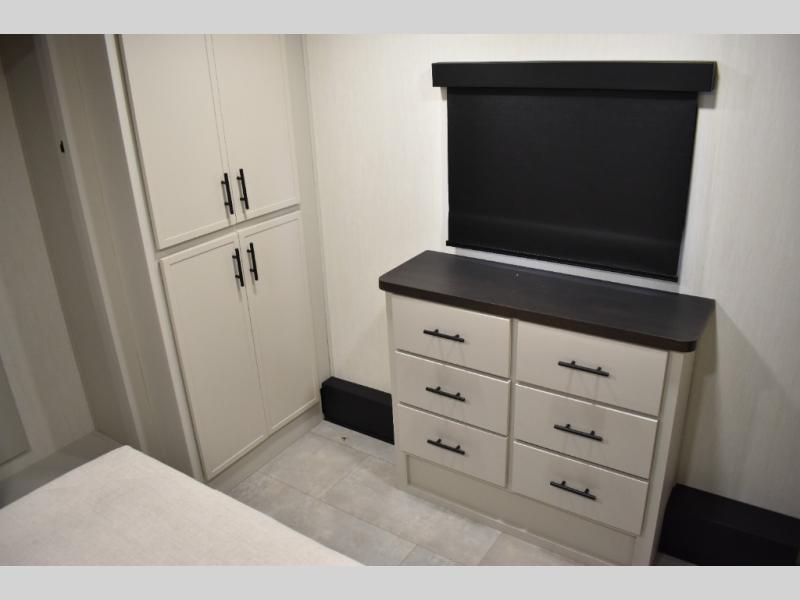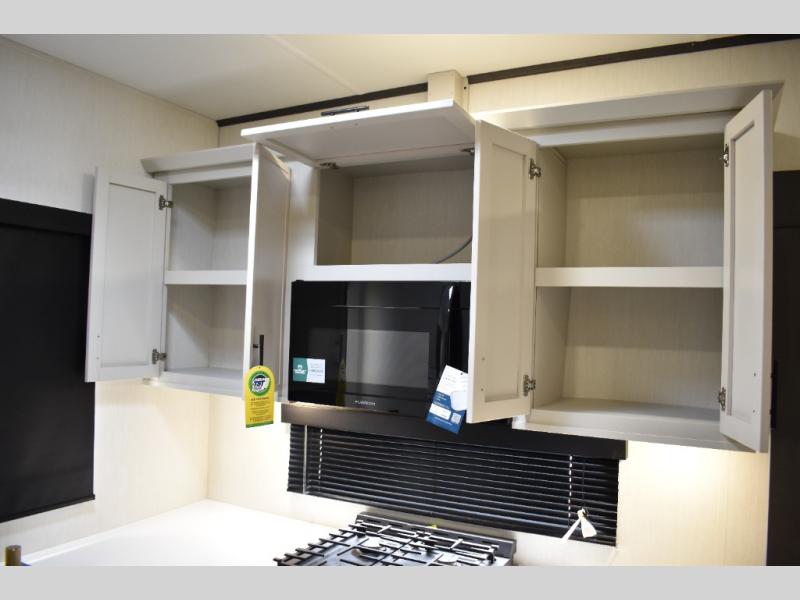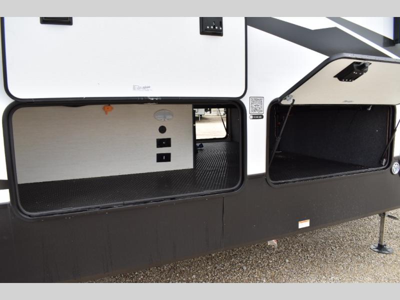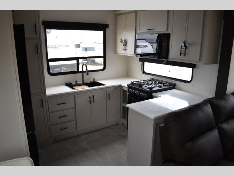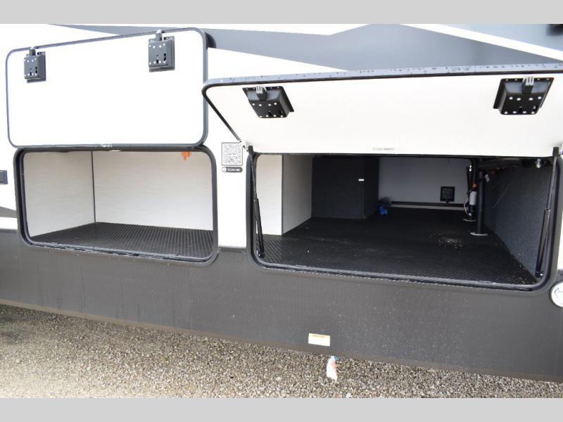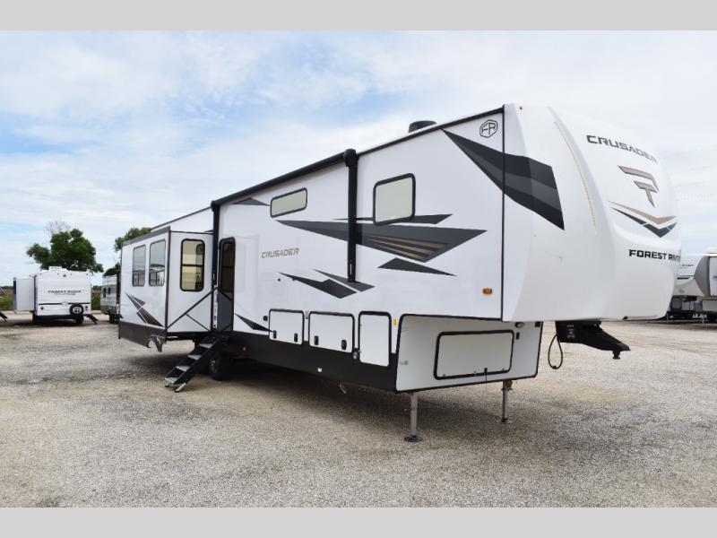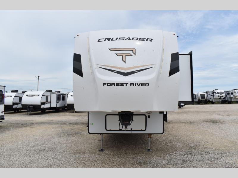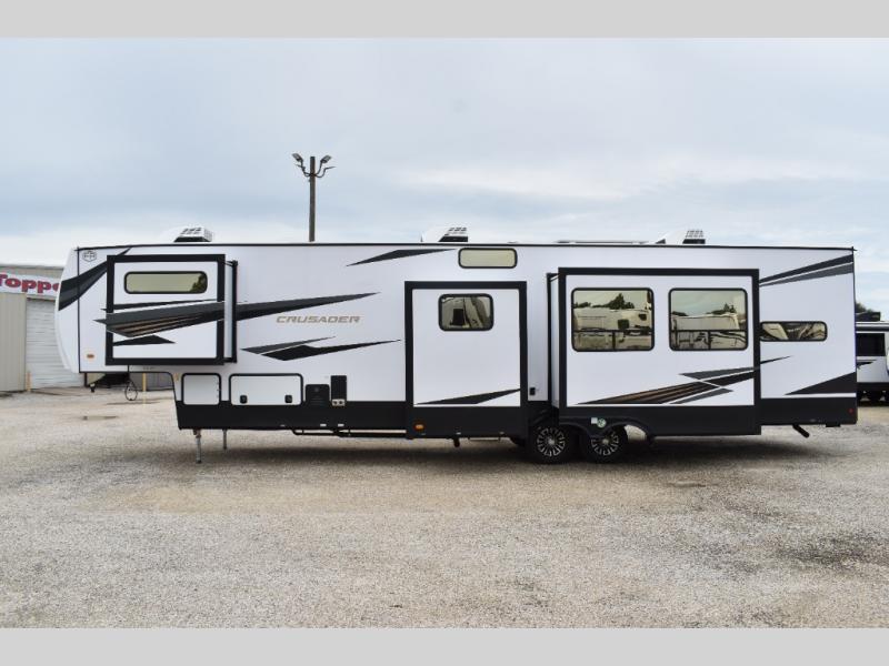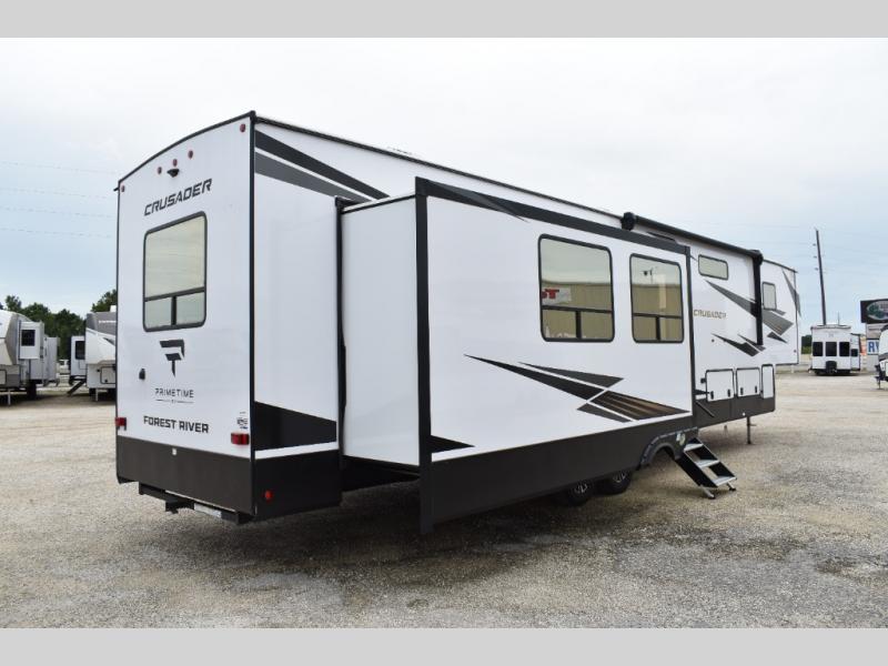 With any Crusader fifth wheel by Prime Time, you will enjoy outstanding quality and premium features! The Dexter E-Z Flex rubberized suspension equalizer will help make towing smoother than ever, and the high gloss gel coated exterior fiberglass is sure to be eye-catching. There are also thick insulated pass-through storage baggage doors outside, along with a 102" wide body, and hassle-free one-touch auto leveling. Inside, you'll find real wood cabinet doors, carpet-less slide rooms, blackout roller shades, and stain resistant, easy clean furniture. The Crusader fifth wheels are built with Eternabond construction, a one-piece PVC roof membrane, radiant foil insulation, plus rack and pinion slide systems.