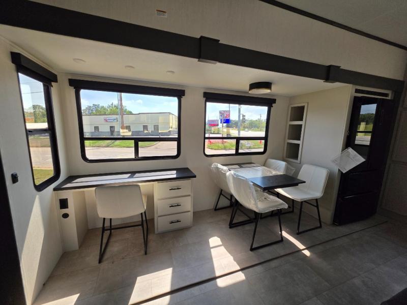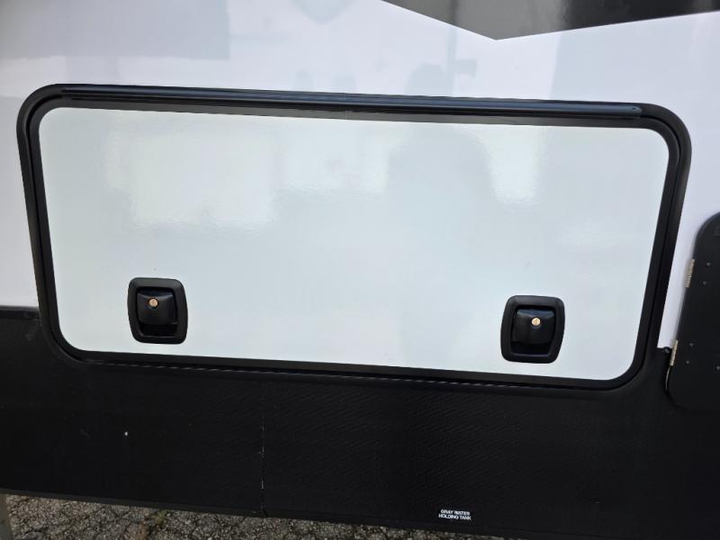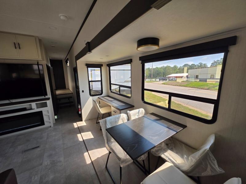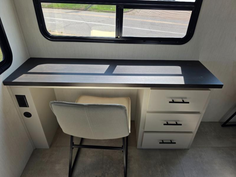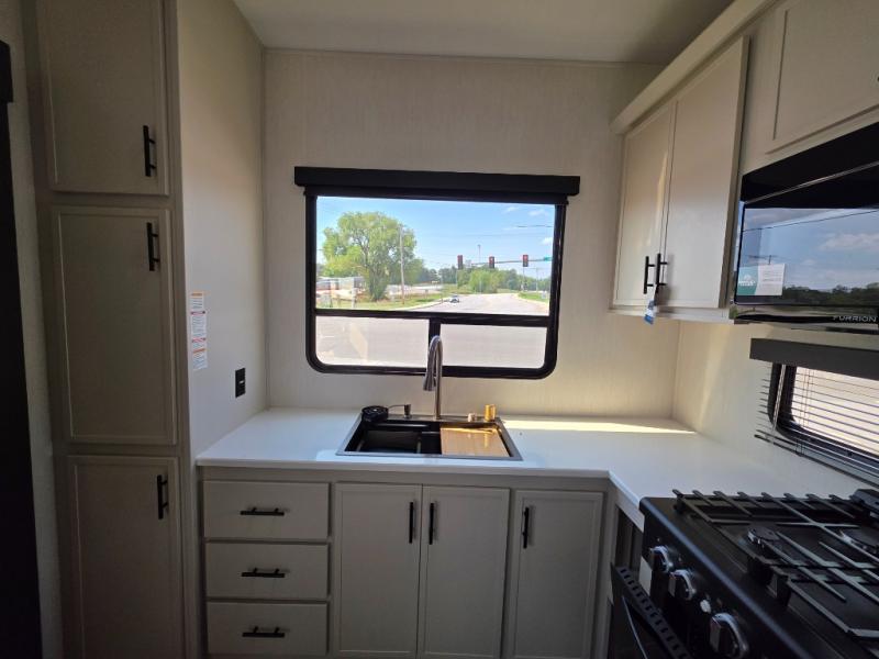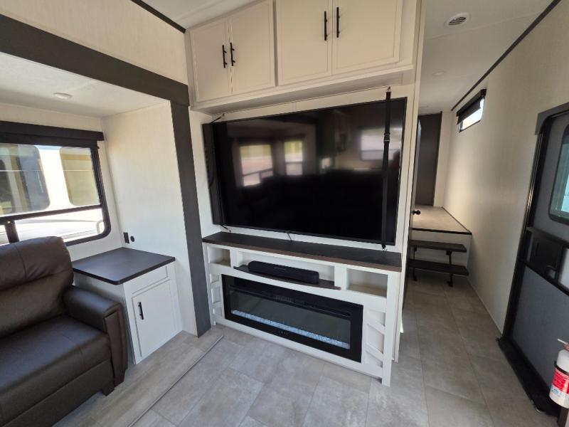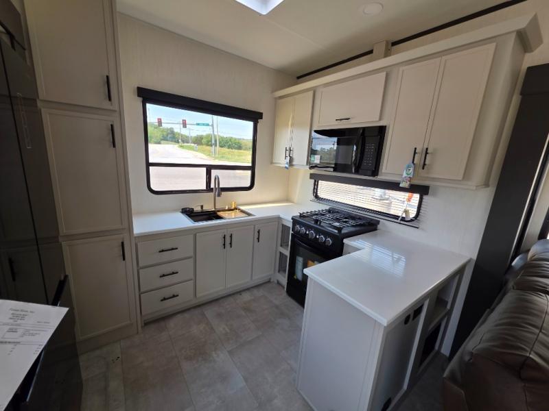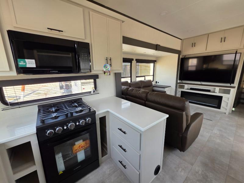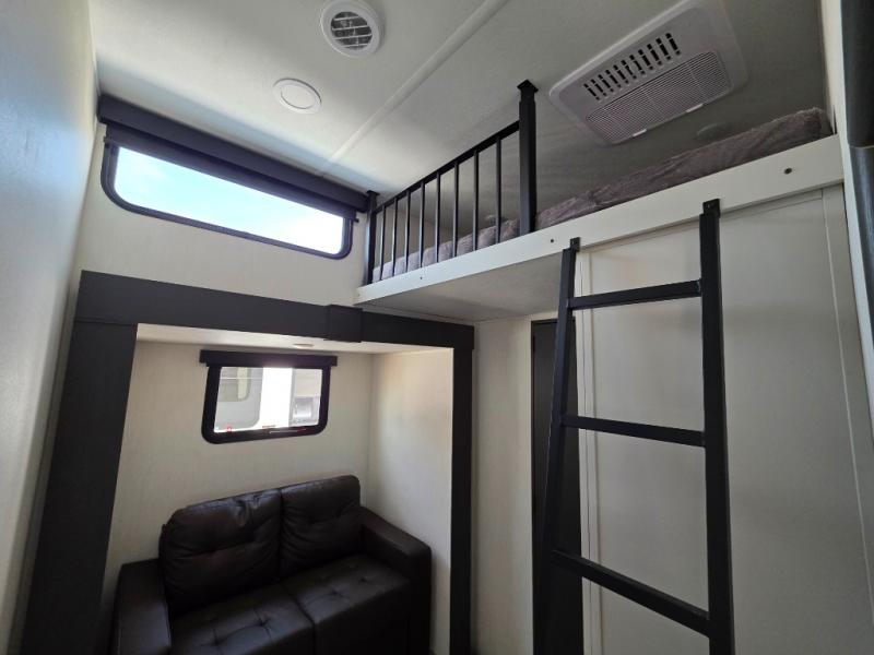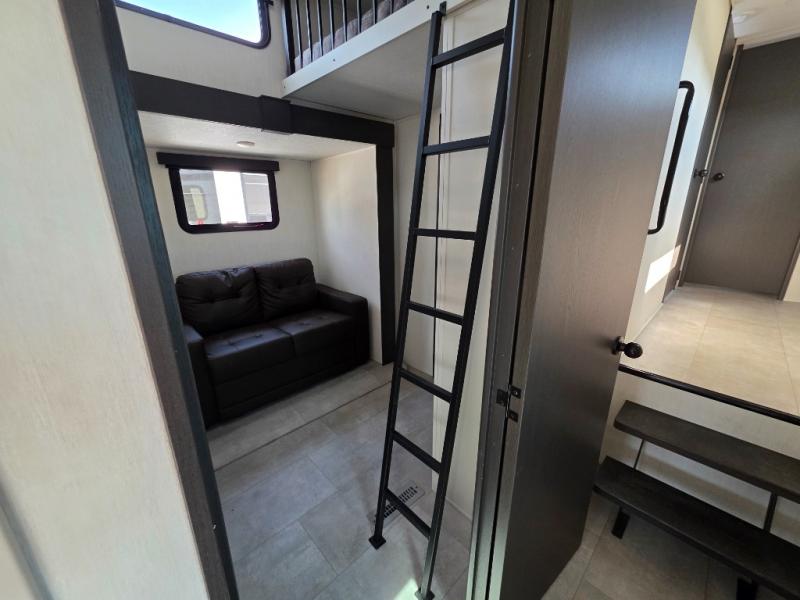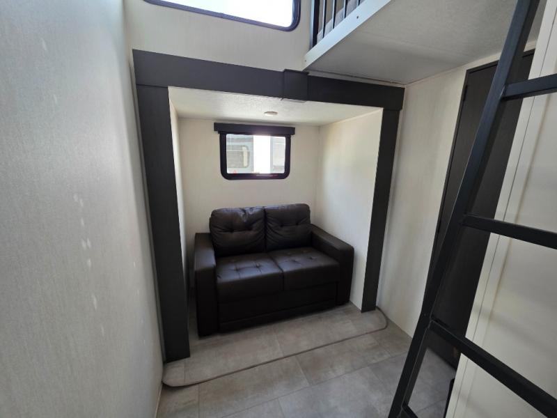 If you enjoy camping with family or friends, this fifth wheel is sure to meet all of your needs! The front bedroom includes a queen bed slide out for more space and comfort, plus a front wardrobe with washer and dryer prep. And the full bath is right next door for easy nighttime use. Your guests can utilize the middle bonus room that includes an E-Z glide sofa slide out, a private loft, and a half bath! The living room is made spacious thanks to the dual opposing slides, and you'll find a sectional sleeper sofa here, as well as desk with a chair and a free-standing table with chairs. And don't overlook the rear kitchen with ample counter space, a four burner range, an accessory sink and a French door 12V refrigerator!