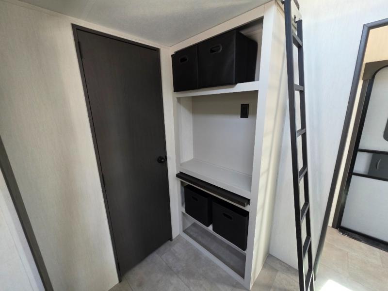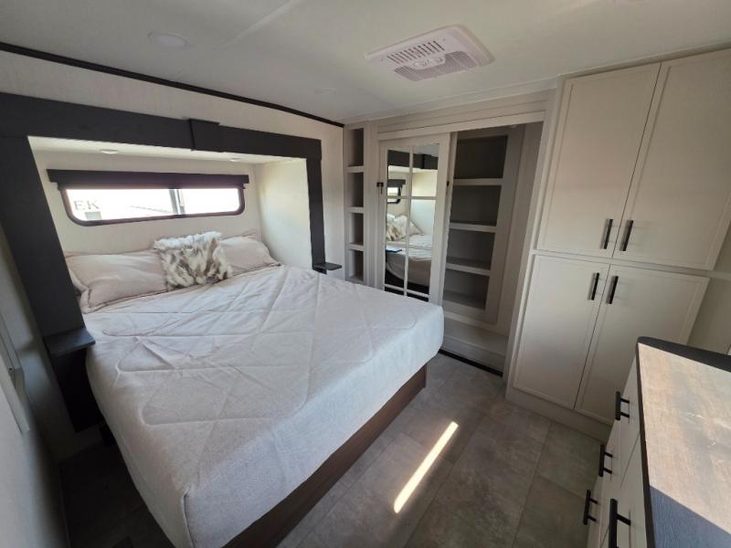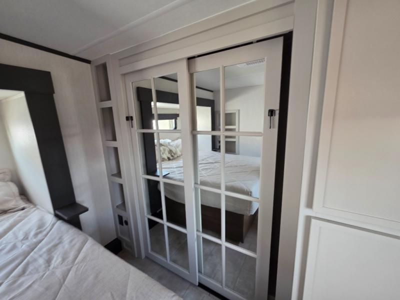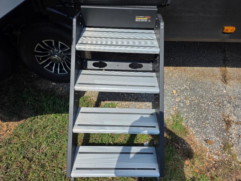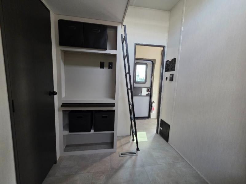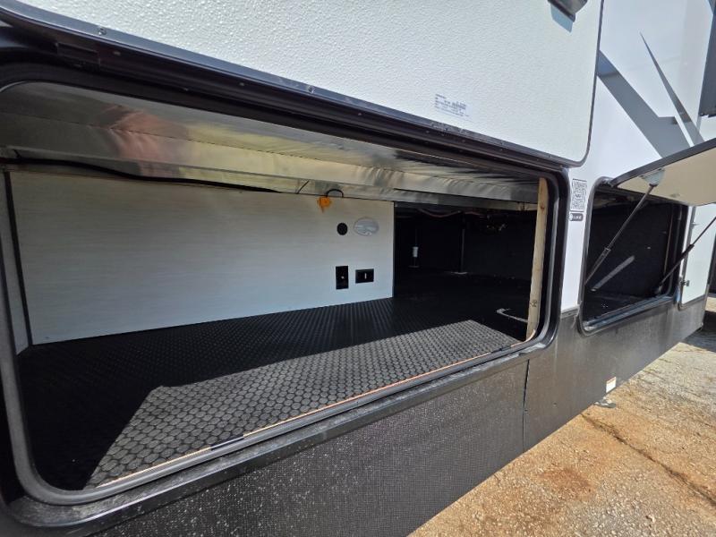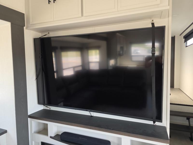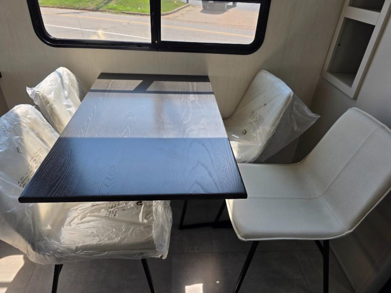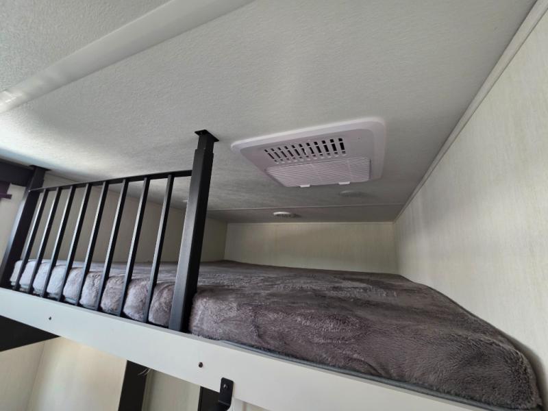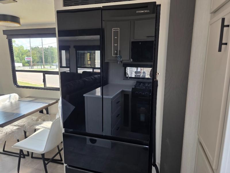 If you enjoy camping with family or friends, this fifth wheel is sure to meet all of your needs! The front bedroom includes a queen bed slide out for more space and comfort, plus a front wardrobe with washer and dryer prep. And the full bath is right next door for easy nighttime use. Your guests can utilize the middle bonus room that includes an E-Z glide sofa slide out, a private loft, and a half bath! The living room is made spacious thanks to the dual opposing slides, and you'll find a sectional sleeper sofa here, as well as desk with a chair and a free-standing table with chairs. And don't overlook the rear kitchen with ample counter space, a four burner range, an accessory sink and a French door 12V refrigerator!