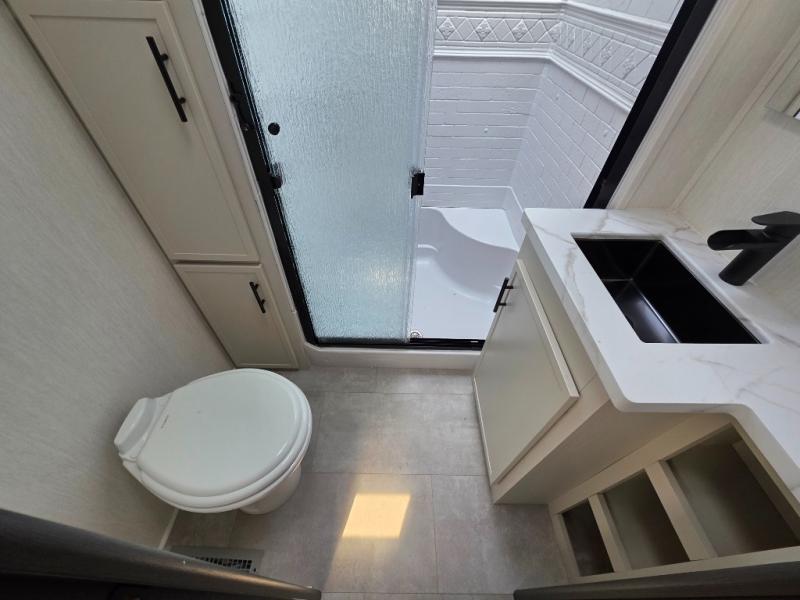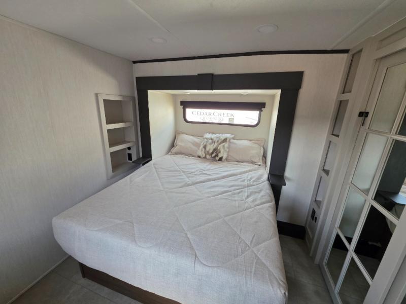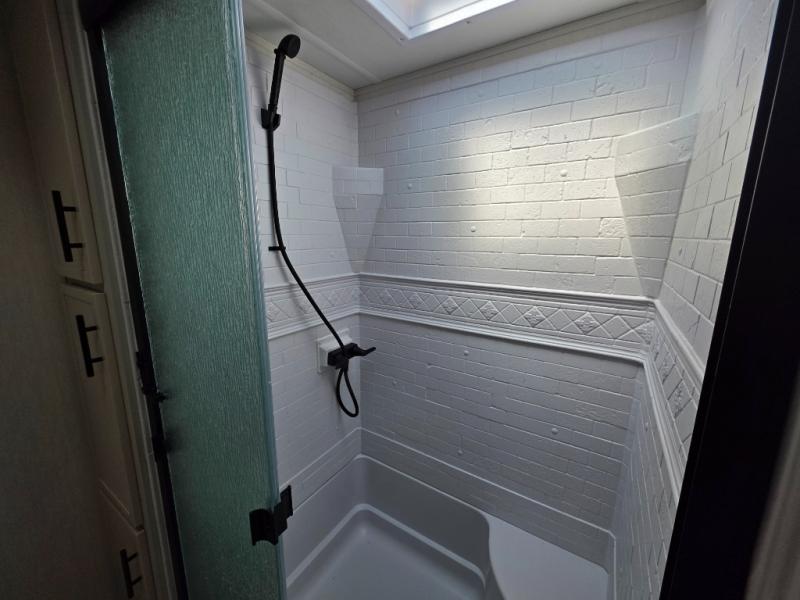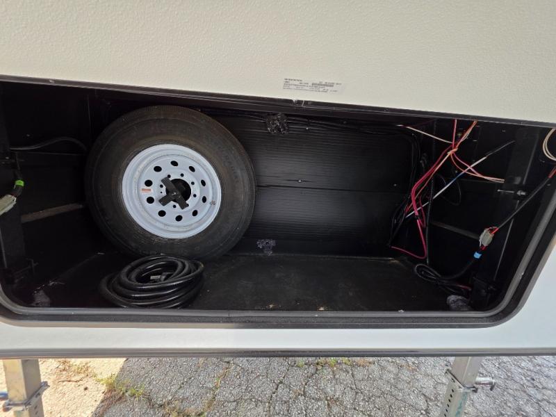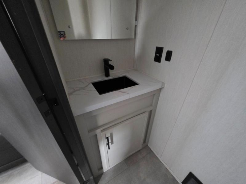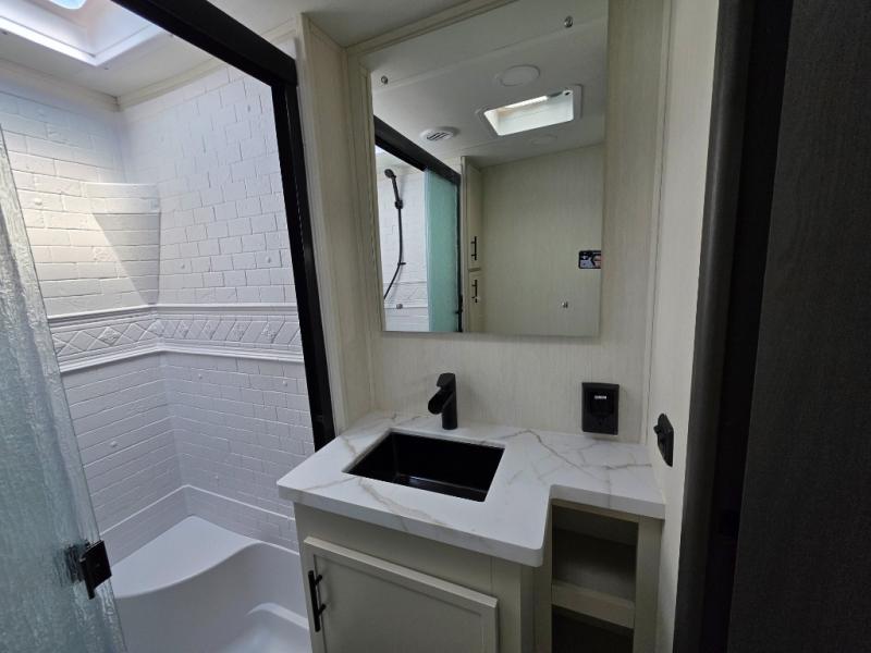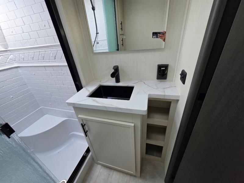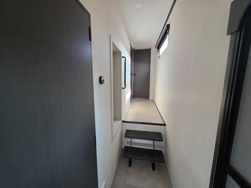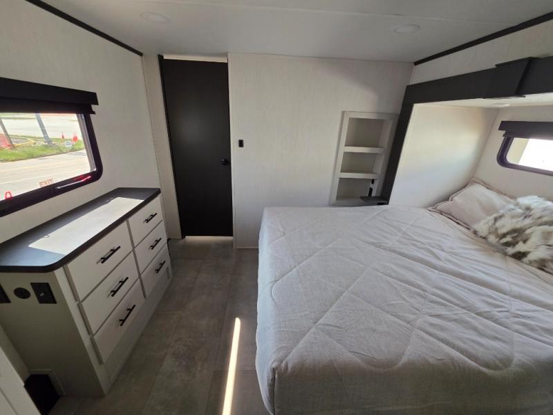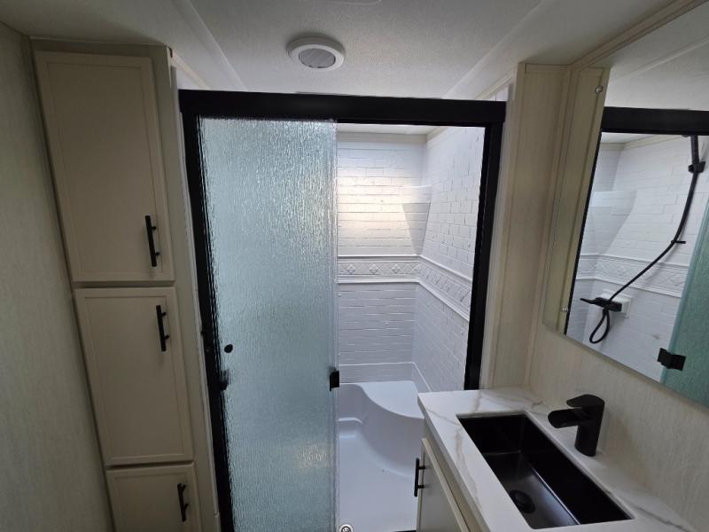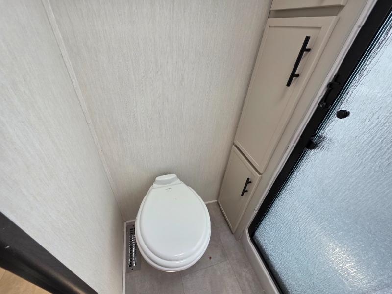 If you enjoy camping with family or friends, this fifth wheel is sure to meet all of your needs! The front bedroom includes a queen bed slide out for more space and comfort, plus a front wardrobe with washer and dryer prep. And the full bath is right next door for easy nighttime use. Your guests can utilize the middle bonus room that includes an E-Z glide sofa slide out, a private loft, and a half bath! The living room is made spacious thanks to the dual opposing slides, and you'll find a sectional sleeper sofa here, as well as desk with a chair and a free-standing table with chairs. And don't overlook the rear kitchen with ample counter space, a four burner range, an accessory sink and a French door 12V refrigerator!