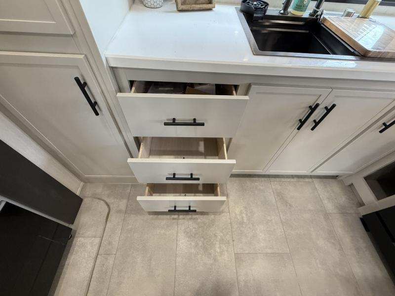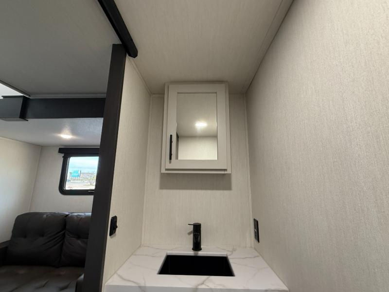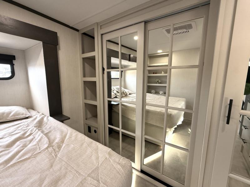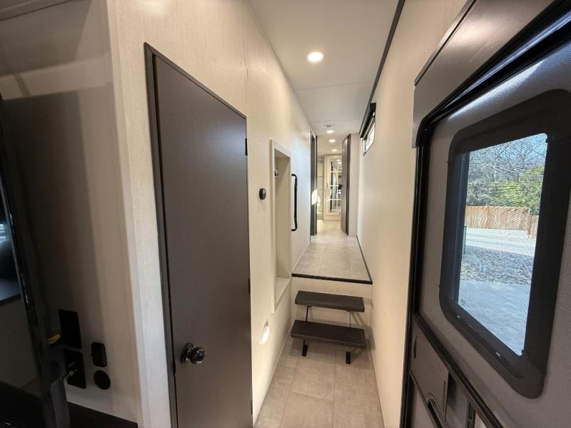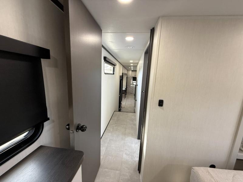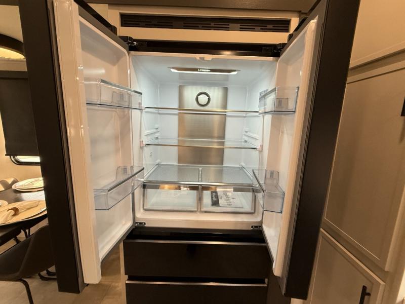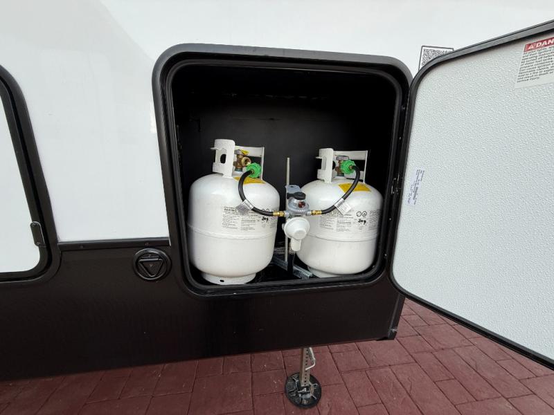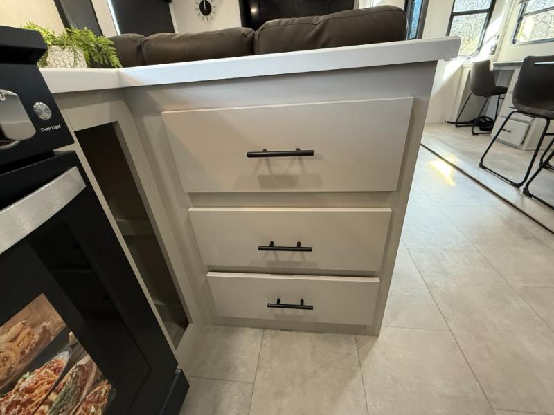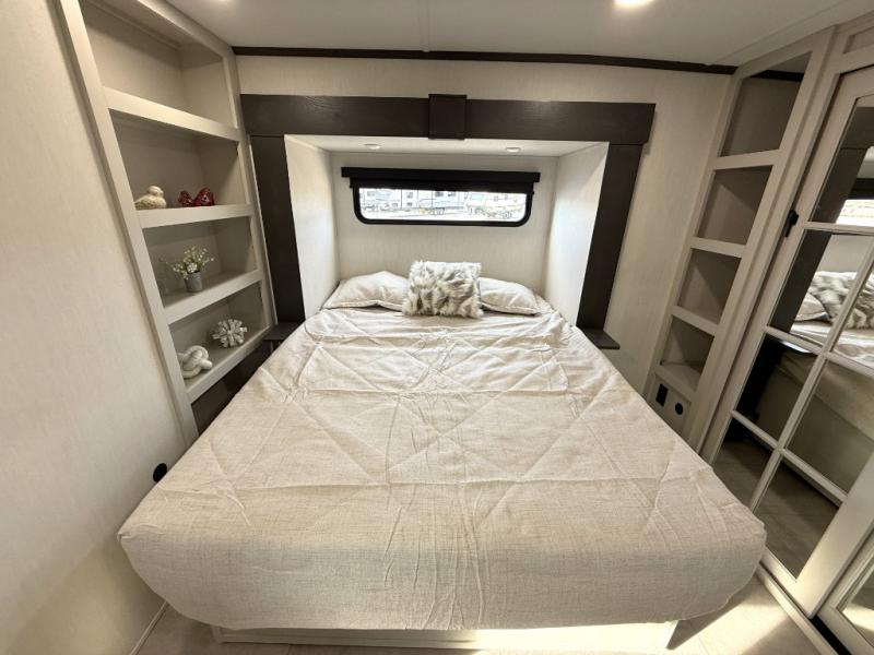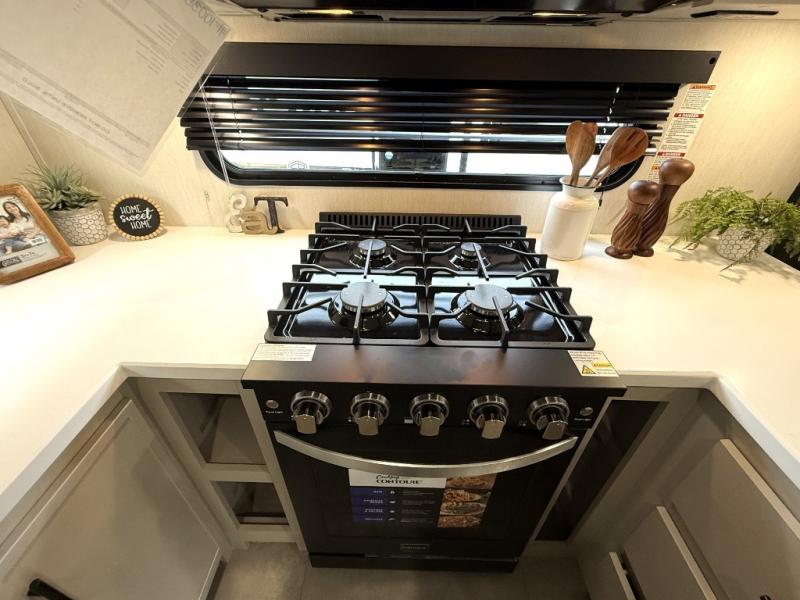 If you enjoy camping with family or friends, this fifth wheel is sure to meet all of your needs! The front bedroom includes a queen bed slide out for more space and comfort, plus a front wardrobe with washer and dryer prep. And the full bath is right next door for easy nighttime use. Your guests can utilize the middle bonus room that includes an E-Z glide sofa slide out, a private loft, and a half bath! The living room is made spacious thanks to the dual opposing slides, and you'll find a sectional sleeper sofa here, as well as desk with a chair and a free-standing table with chairs. And don't overlook the rear kitchen with ample counter space, a four burner range, an accessory sink and a French door 12V refrigerator!
