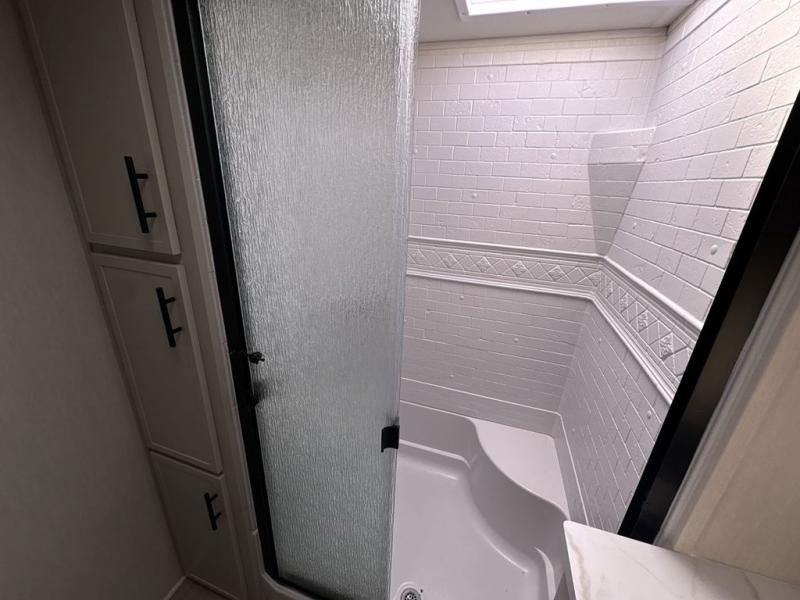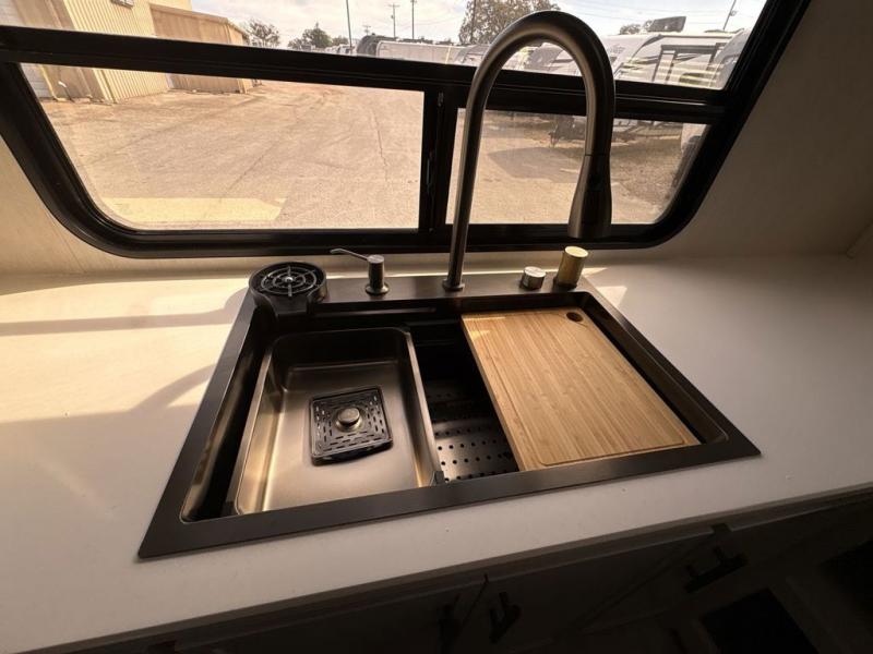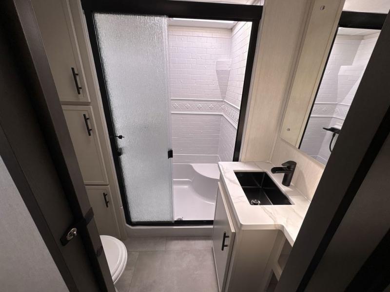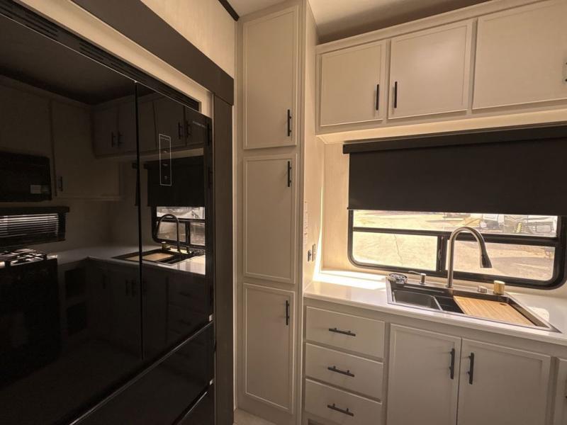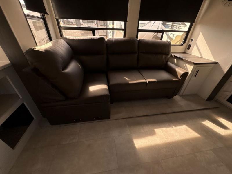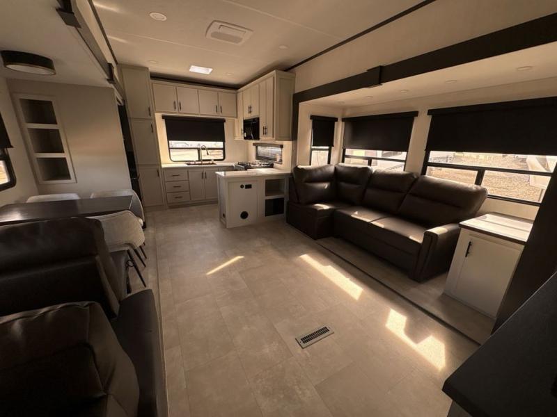 If you enjoy camping with family or friends, this fifth wheel is sure to meet all of your needs! The front bedroom includes a queen bed slide out for more space and comfort, plus a front wardrobe with washer and dryer prep. And the full bath is right next door for easy nighttime use. Your guests can utilize the middle bonus room that includes an E-Z glide sofa slide out, a private loft, and a half bath! The living room is made spacious thanks to the dual opposing slides, and you'll find a sectional sleeper sofa here, as well as desk with a chair and a free-standing table with chairs. And don't overlook the rear kitchen with ample counter space, a four burner range, an accessory sink and a French door 12V refrigerator!