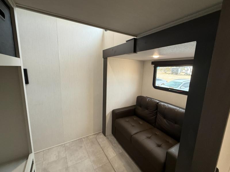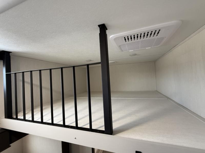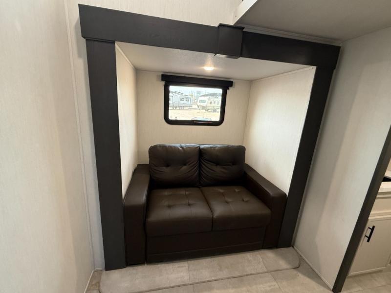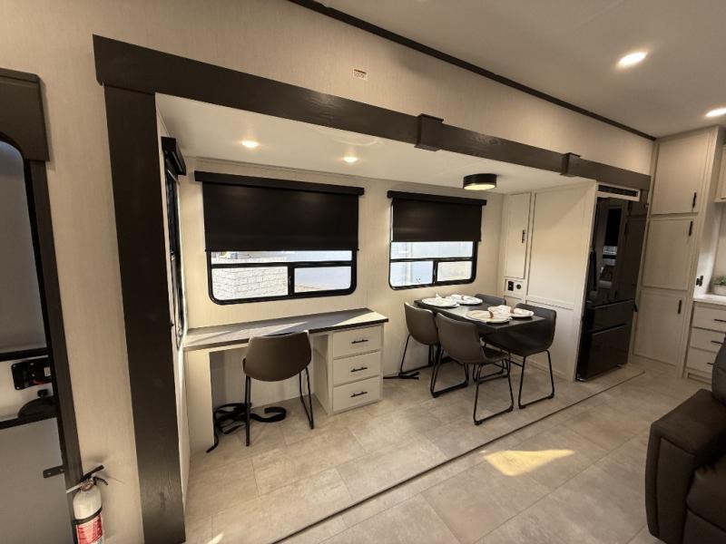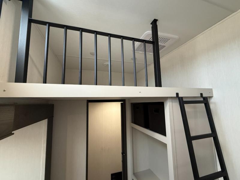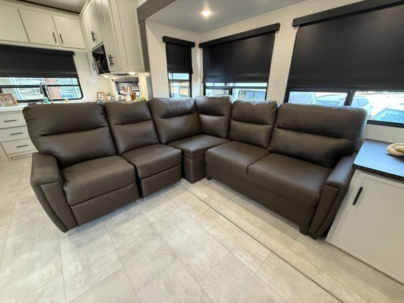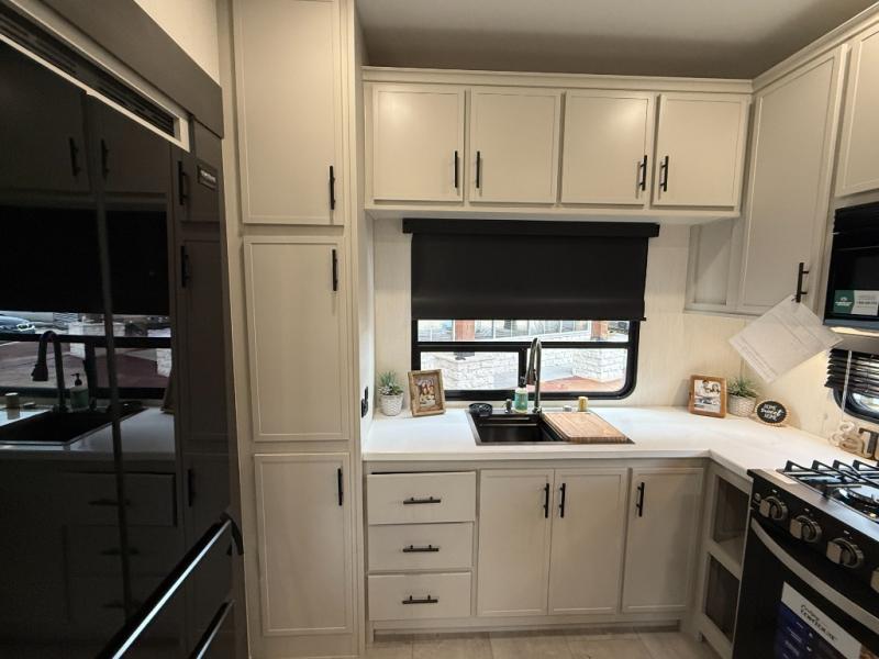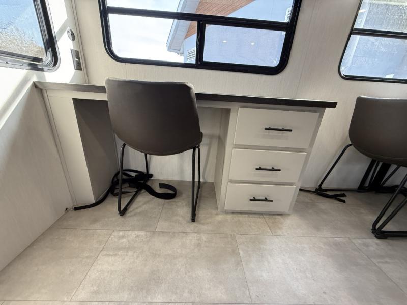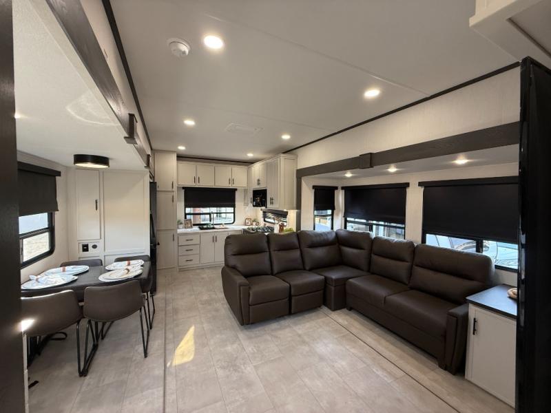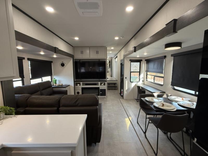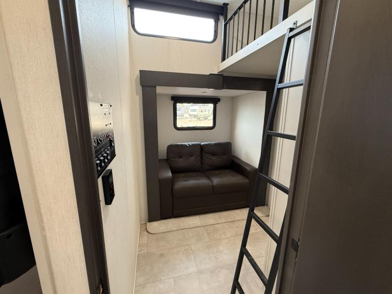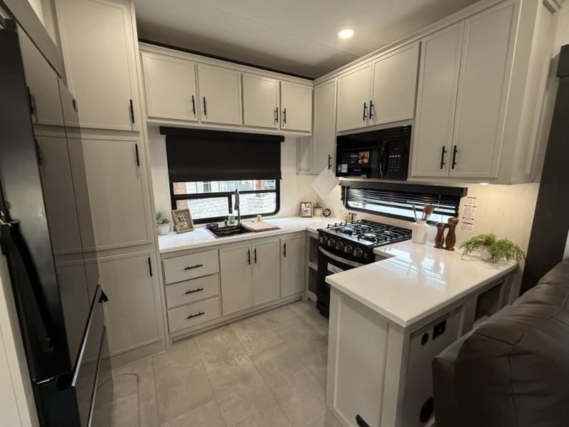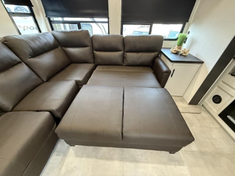 If you enjoy camping with family or friends, this fifth wheel is sure to meet all of your needs! The front bedroom includes a queen bed slide out for more space and comfort, plus a front wardrobe with washer and dryer prep. And the full bath is right next door for easy nighttime use. Your guests can utilize the middle bonus room that includes an E-Z glide sofa slide out, a private loft, and a half bath! The living room is made spacious thanks to the dual opposing slides, and you'll find a sectional sleeper sofa here, as well as desk with a chair and a free-standing table with chairs. And don't overlook the rear kitchen with ample counter space, a four burner range, an accessory sink and a French door 12V refrigerator!