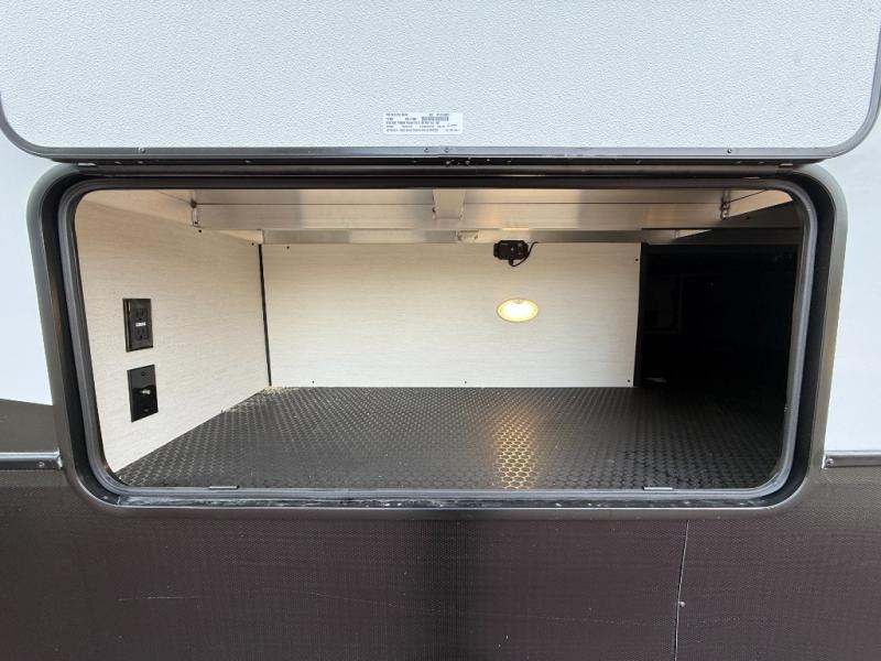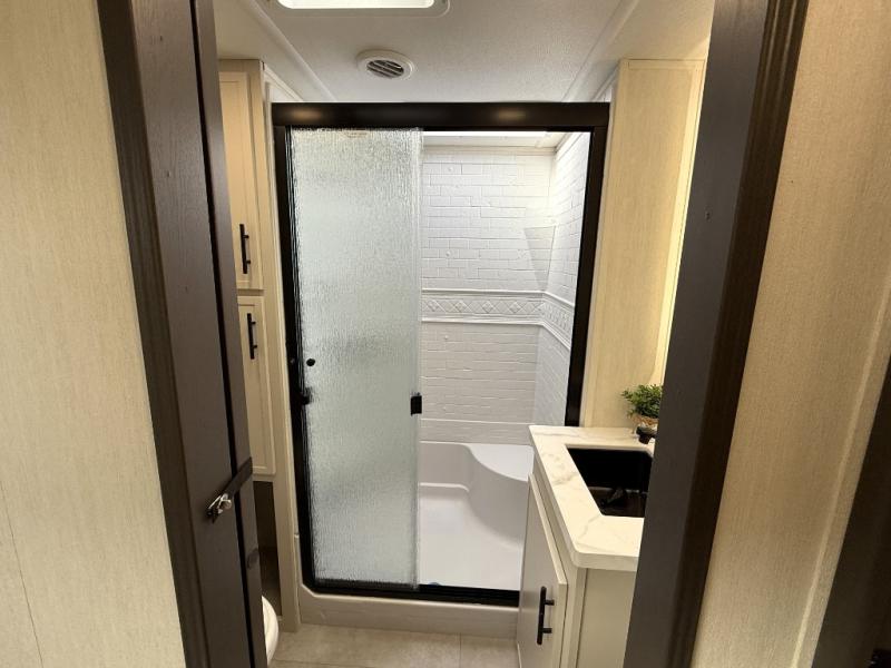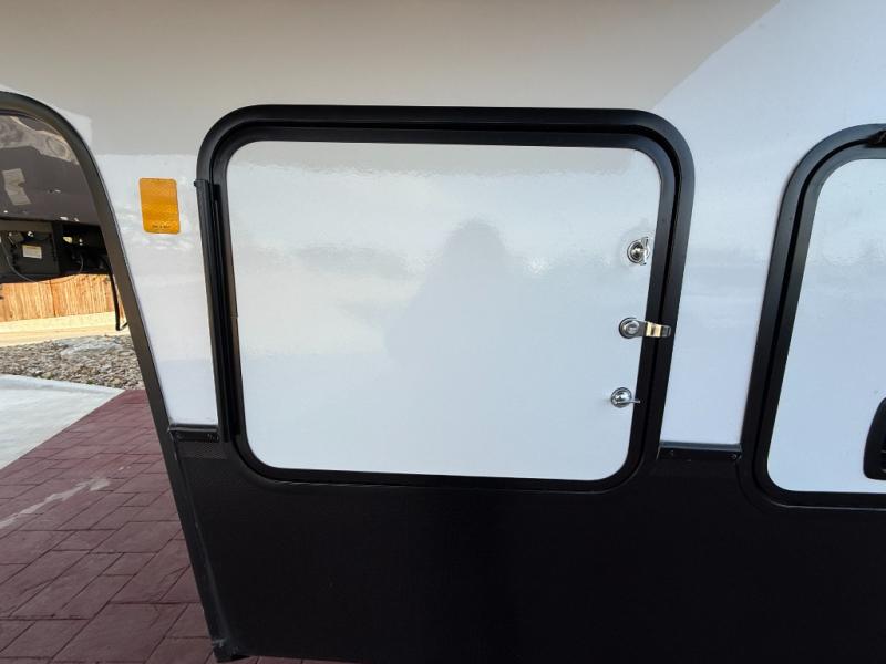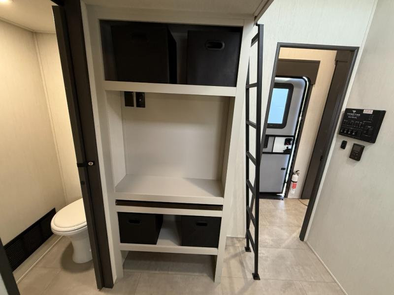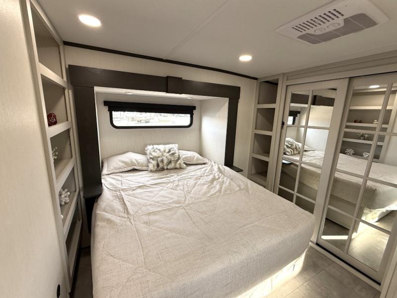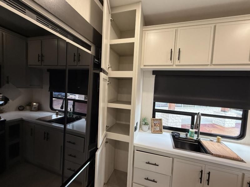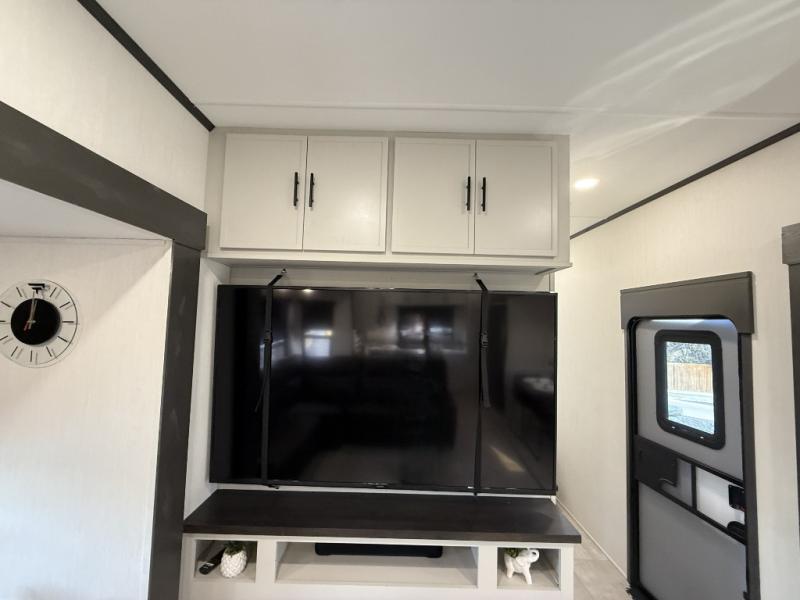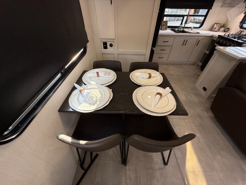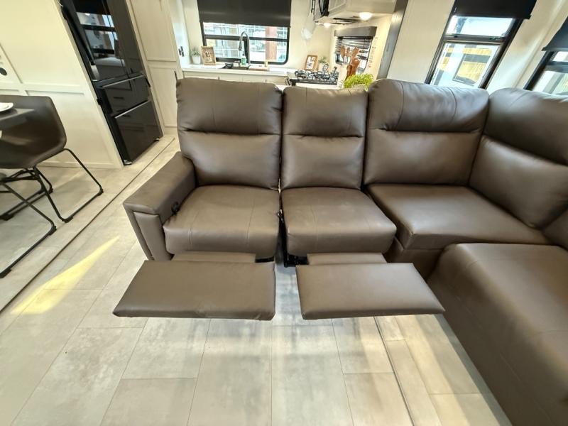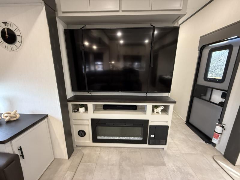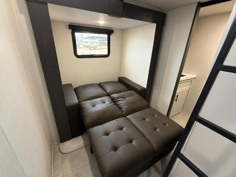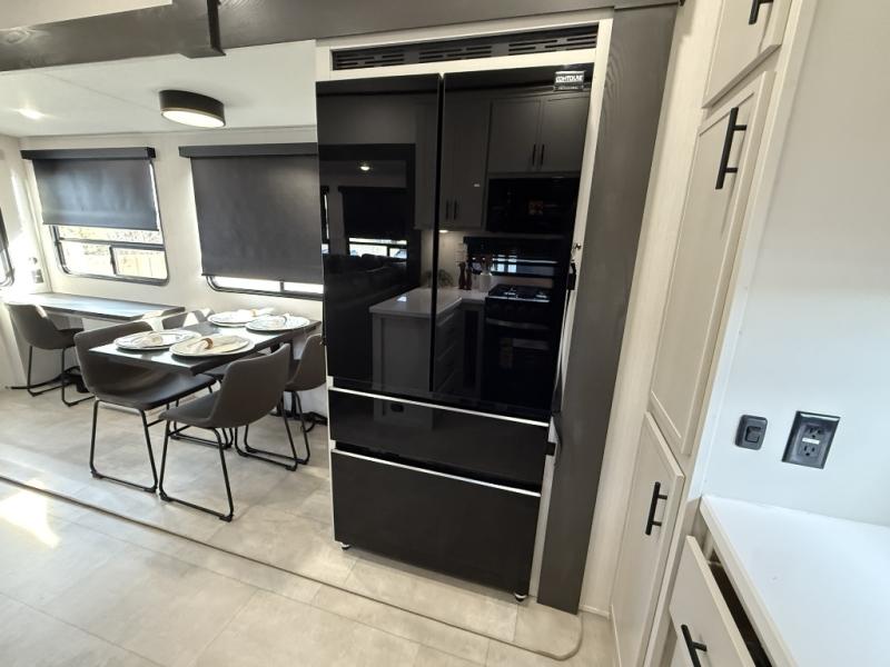 If you enjoy camping with family or friends, this fifth wheel is sure to meet all of your needs! The front bedroom includes a queen bed slide out for more space and comfort, plus a front wardrobe with washer and dryer prep. And the full bath is right next door for easy nighttime use. Your guests can utilize the middle bonus room that includes an E-Z glide sofa slide out, a private loft, and a half bath! The living room is made spacious thanks to the dual opposing slides, and you'll find a sectional sleeper sofa here, as well as desk with a chair and a free-standing table with chairs. And don't overlook the rear kitchen with ample counter space, a four burner range, an accessory sink and a French door 12V refrigerator!