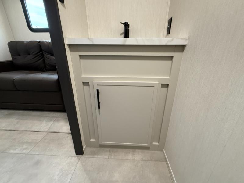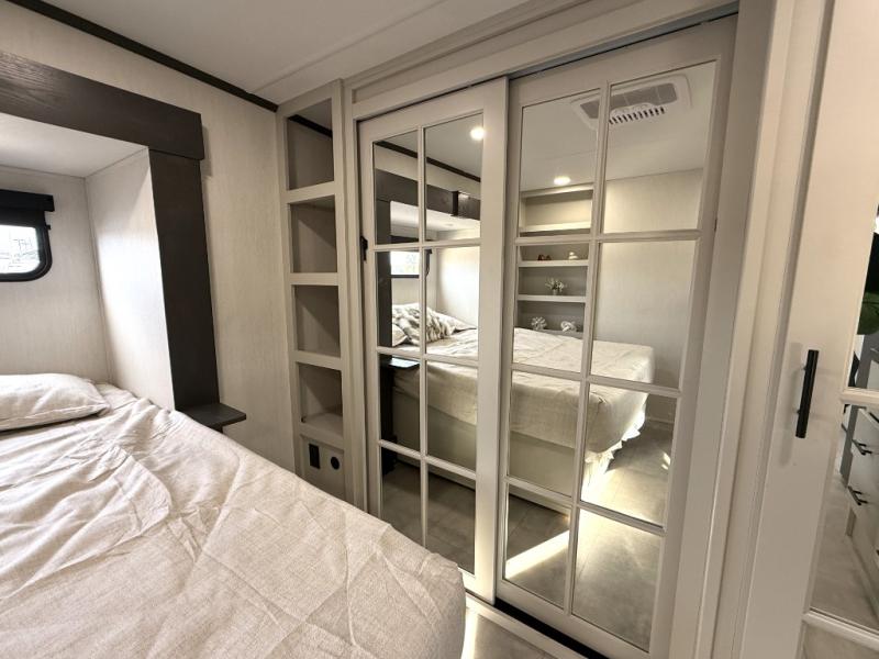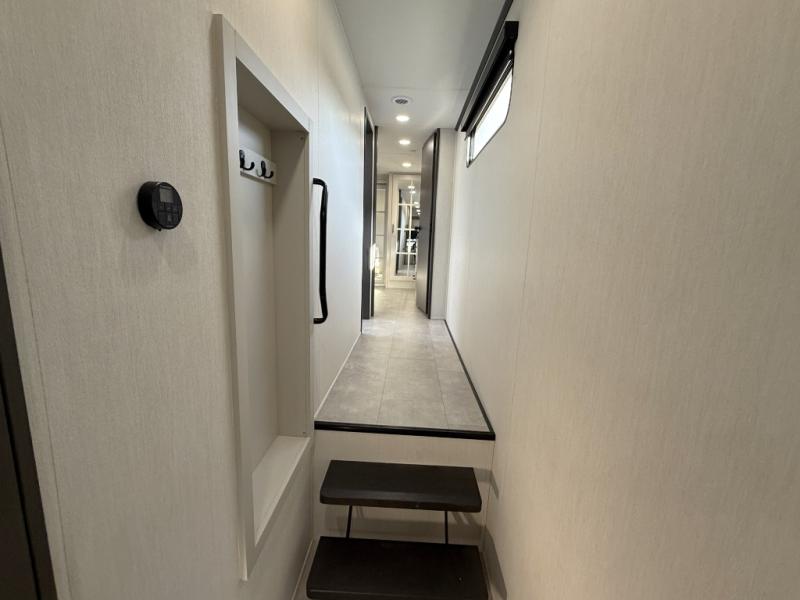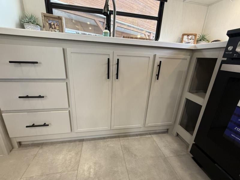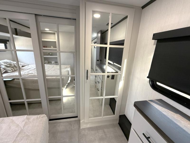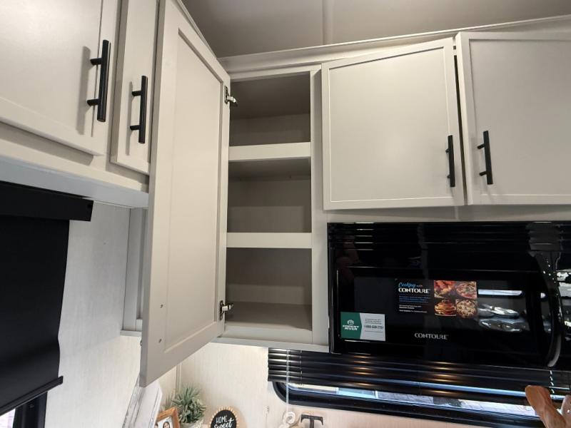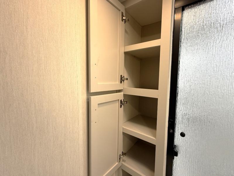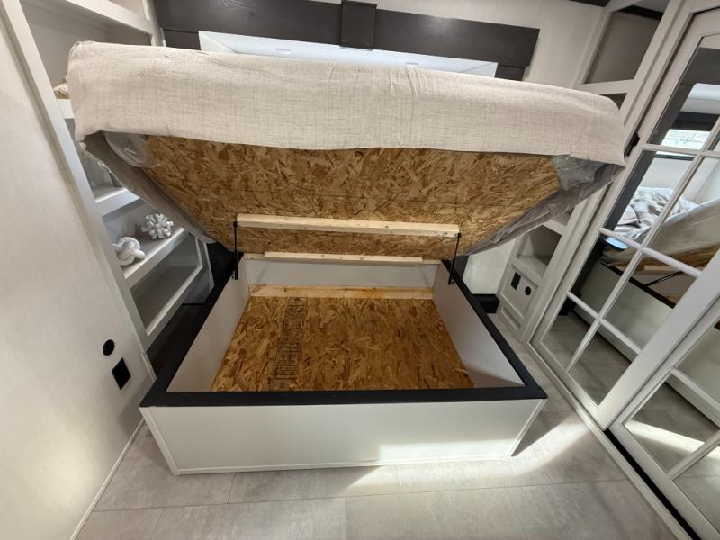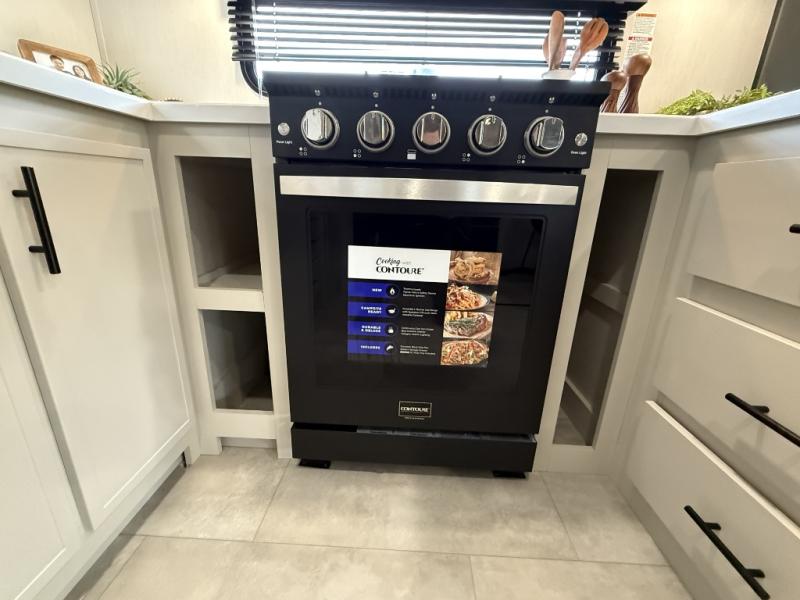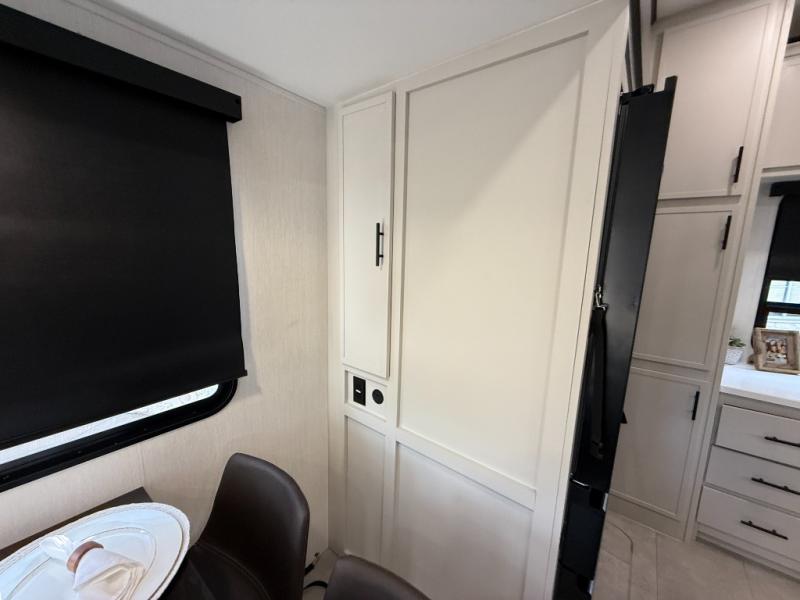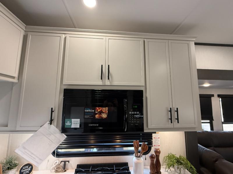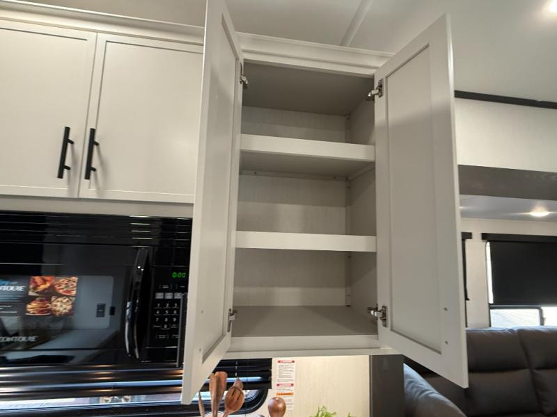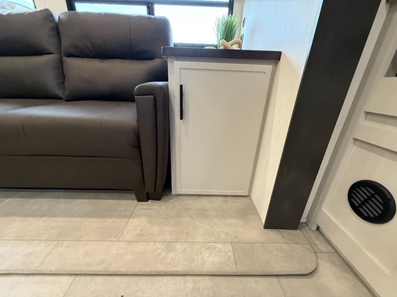 If you enjoy camping with family or friends, this fifth wheel is sure to meet all of your needs! The front bedroom includes a queen bed slide out for more space and comfort, plus a front wardrobe with washer and dryer prep. And the full bath is right next door for easy nighttime use. Your guests can utilize the middle bonus room that includes an E-Z glide sofa slide out, a private loft, and a half bath! The living room is made spacious thanks to the dual opposing slides, and you'll find a sectional sleeper sofa here, as well as desk with a chair and a free-standing table with chairs. And don't overlook the rear kitchen with ample counter space, a four burner range, an accessory sink and a French door 12V refrigerator!