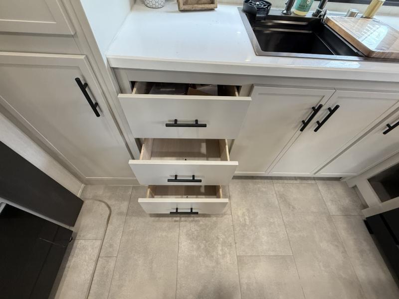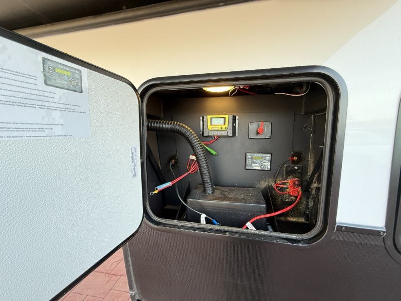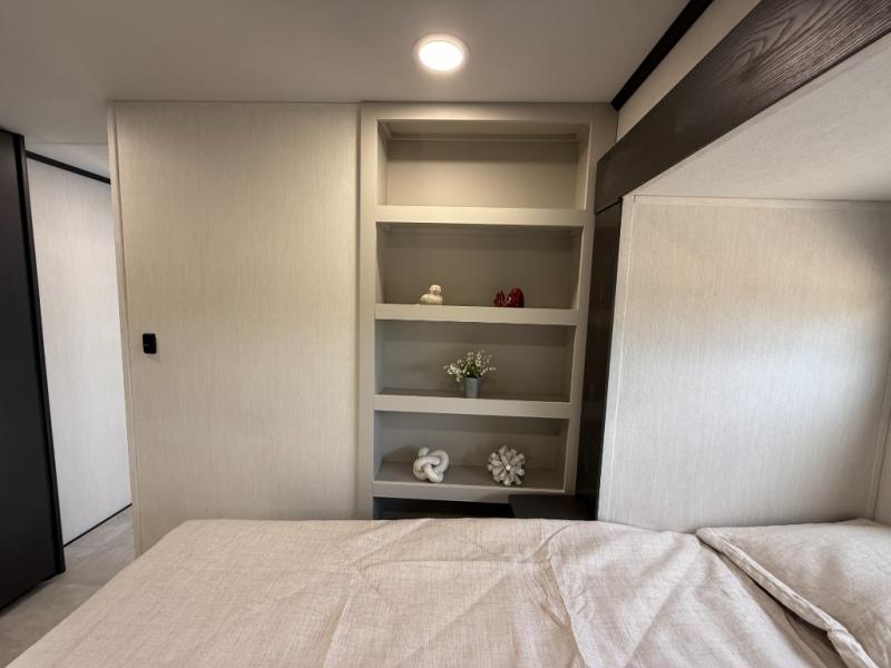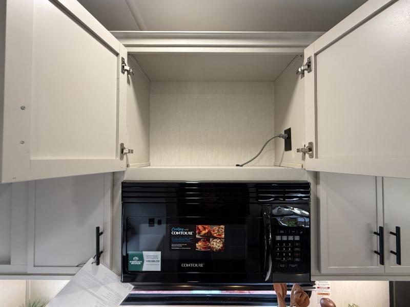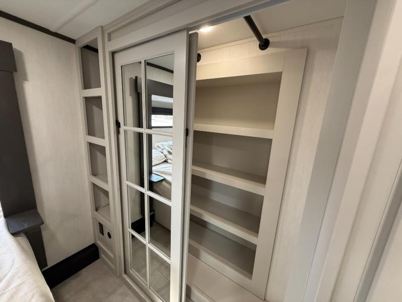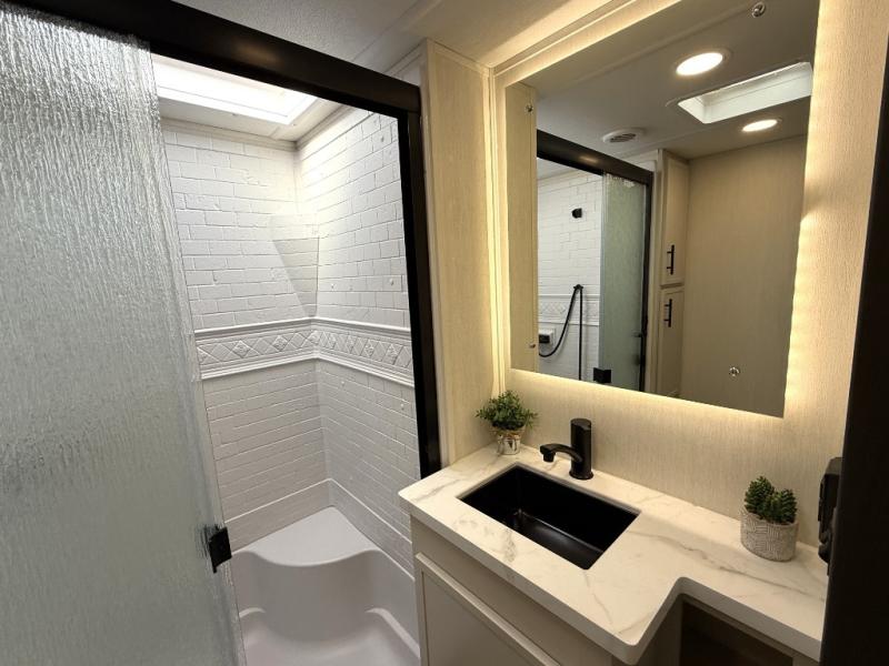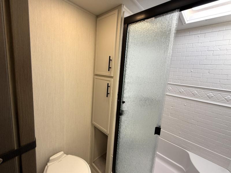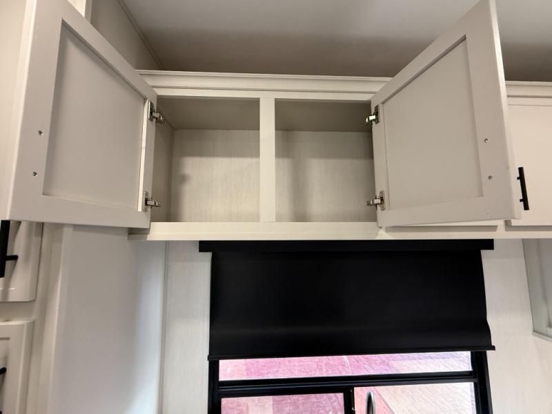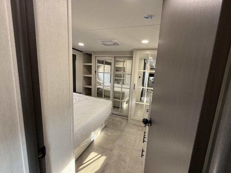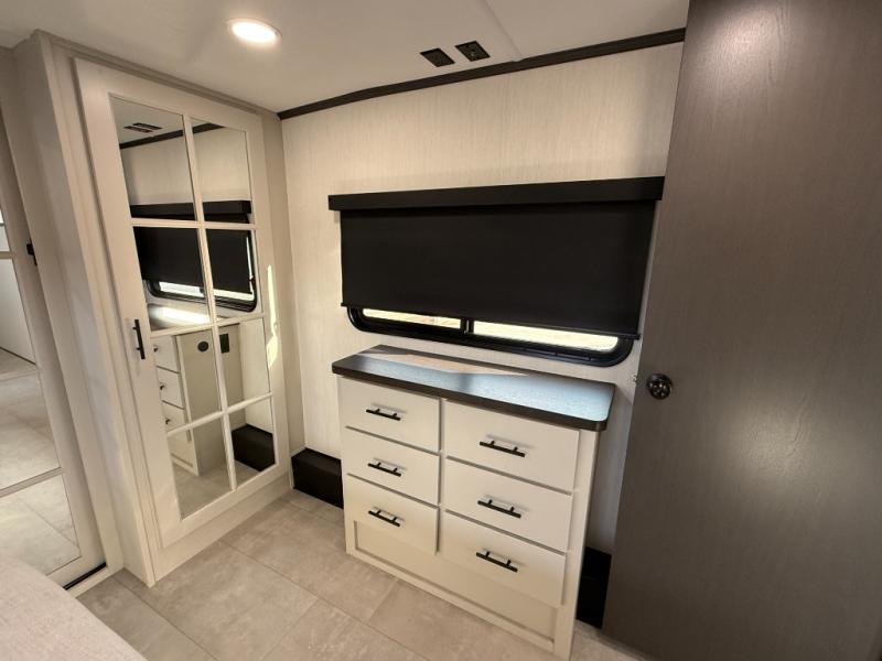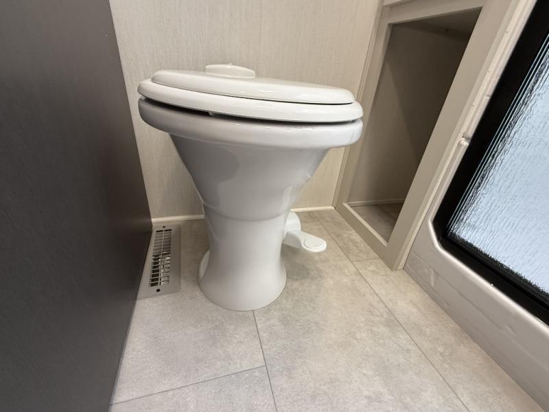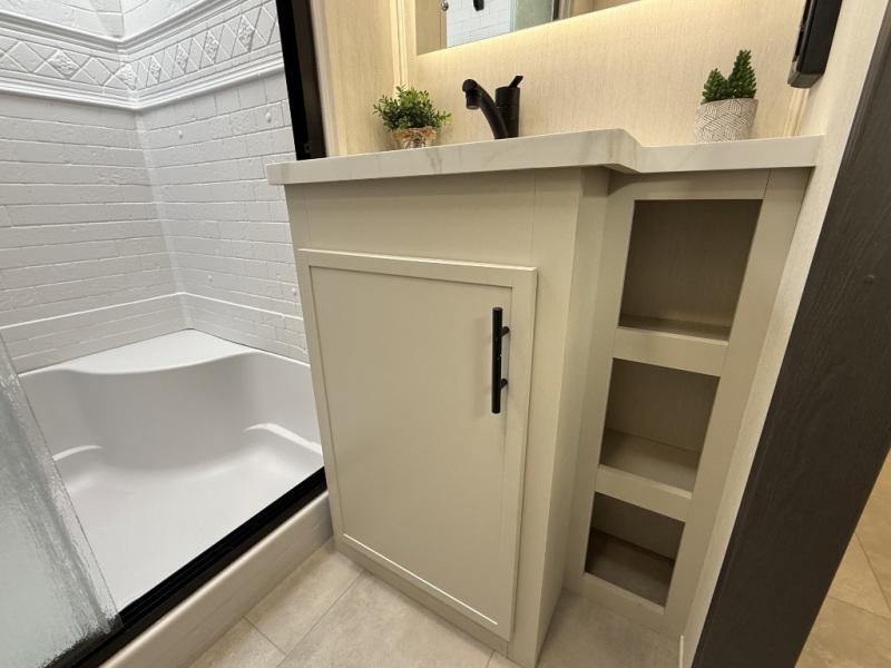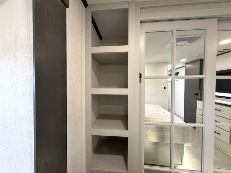 If you enjoy camping with family or friends, this fifth wheel is sure to meet all of your needs! The front bedroom includes a queen bed slide out for more space and comfort, plus a front wardrobe with washer and dryer prep. And the full bath is right next door for easy nighttime use. Your guests can utilize the middle bonus room that includes an E-Z glide sofa slide out, a private loft, and a half bath! The living room is made spacious thanks to the dual opposing slides, and you'll find a sectional sleeper sofa here, as well as desk with a chair and a free-standing table with chairs. And don't overlook the rear kitchen with ample counter space, a four burner range, an accessory sink and a French door 12V refrigerator!