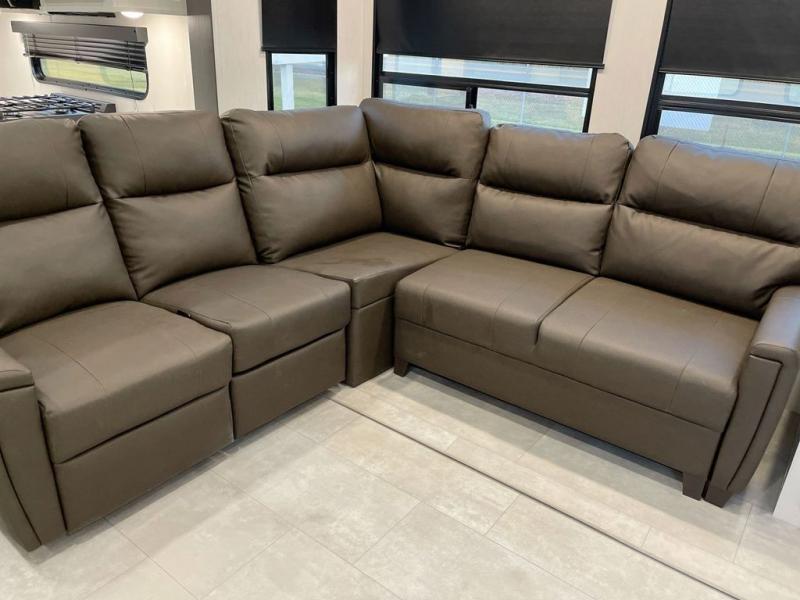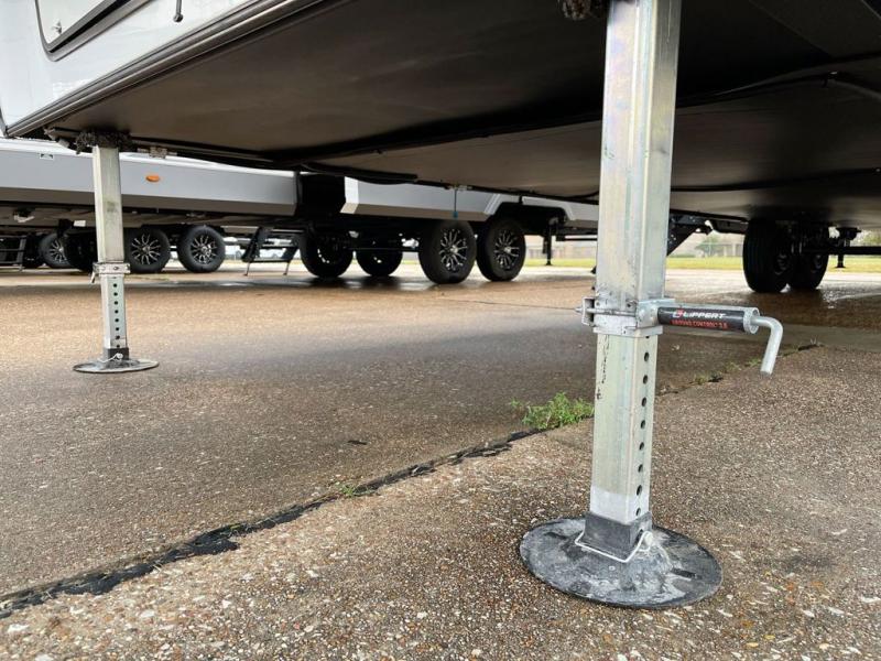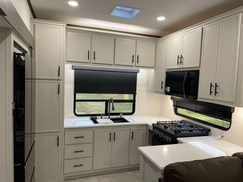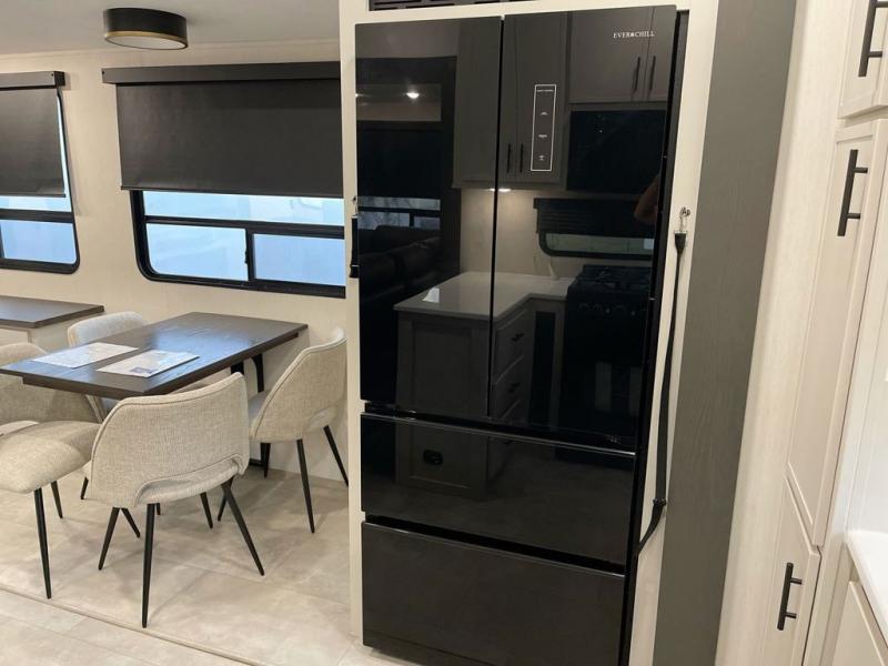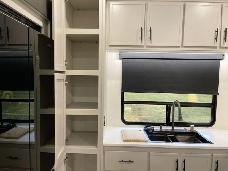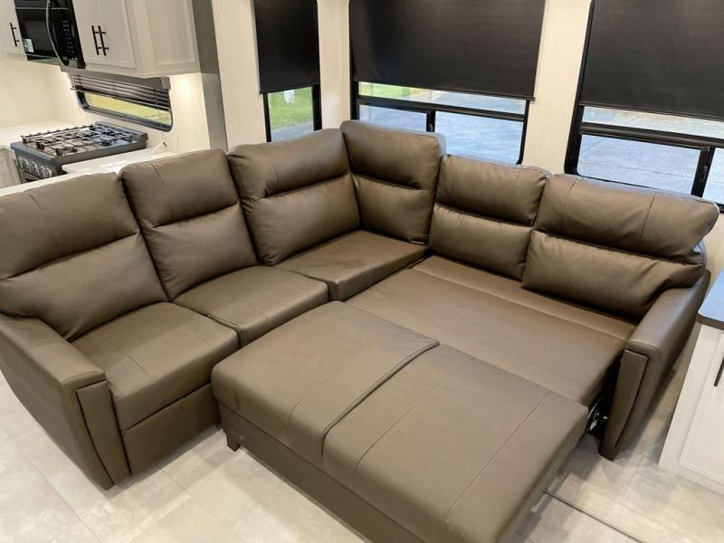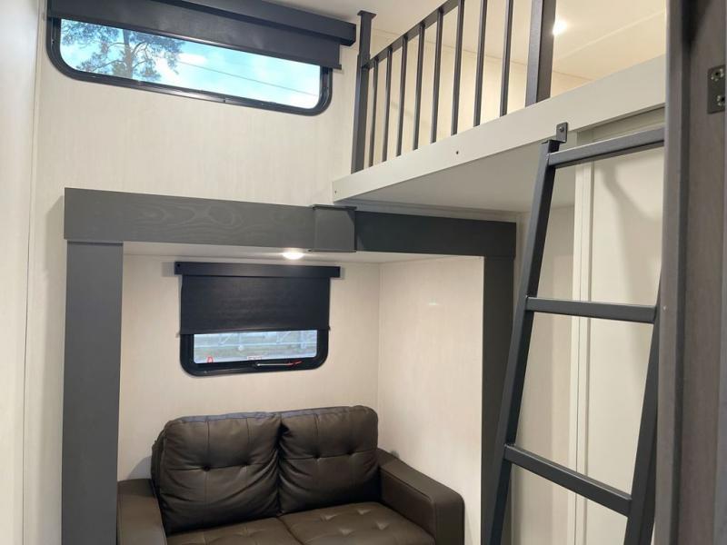 If you enjoy camping with family or friends, this fifth wheel is sure to meet all of your needs! The front bedroom includes a queen bed slide out for more space and comfort, plus a front wardrobe with washer and dryer prep. And the full bath is right next door for easy nighttime use. Your guests can utilize the middle bonus room that includes an E-Z glide sofa slide out, a private loft, and a half bath! The living room is made spacious thanks to the dual opposing slides, and you'll find a sectional sleeper sofa here, as well as desk with a chair and a free-standing table with chairs. And don't overlook the rear kitchen with ample counter space, a four burner range, an accessory sink and a French door 12V refrigerator!