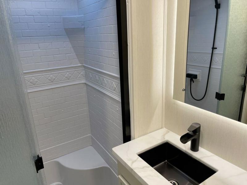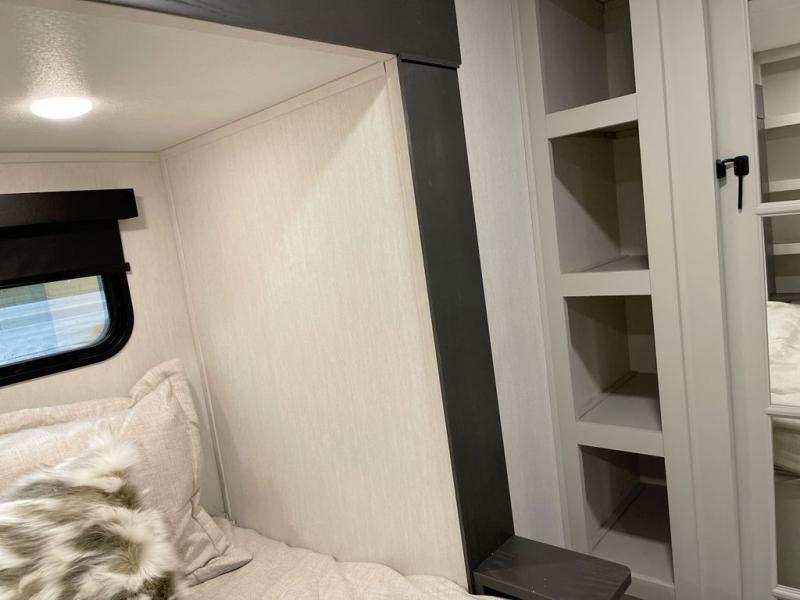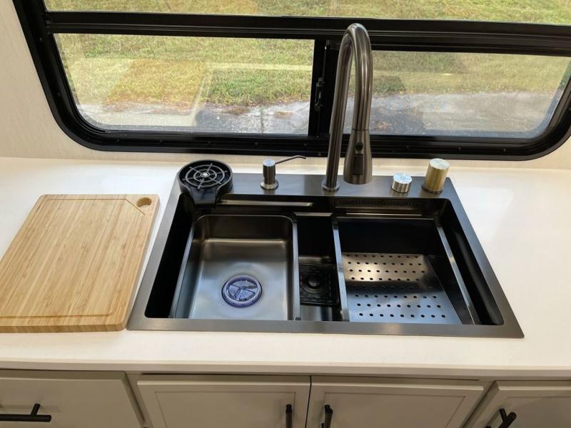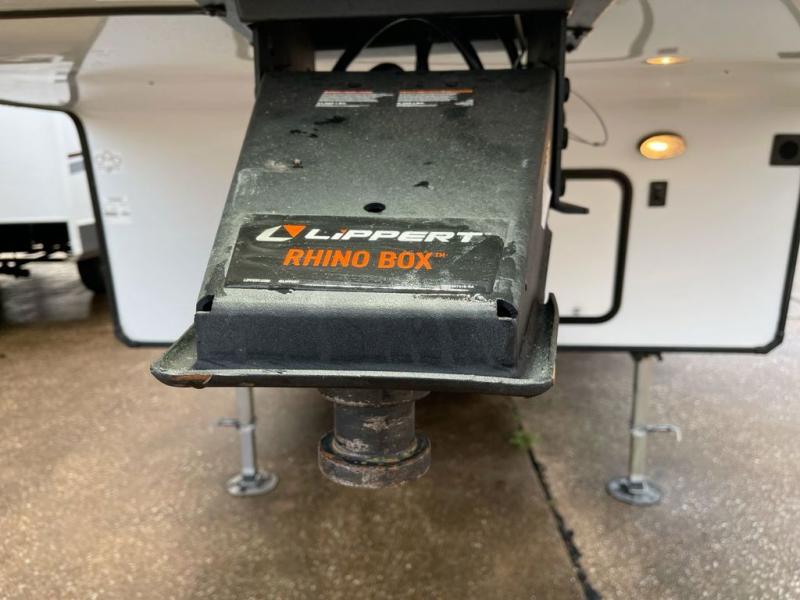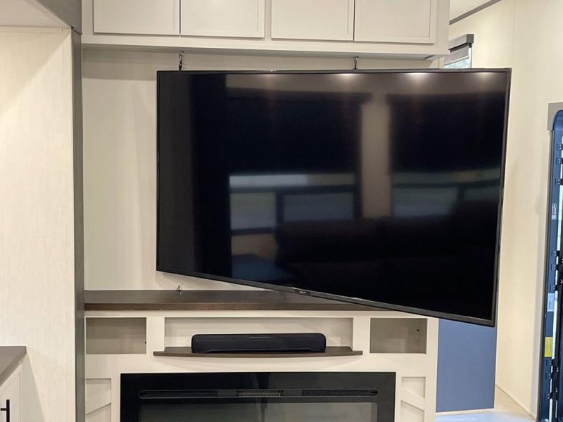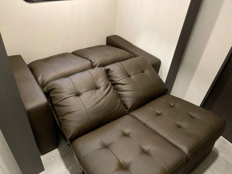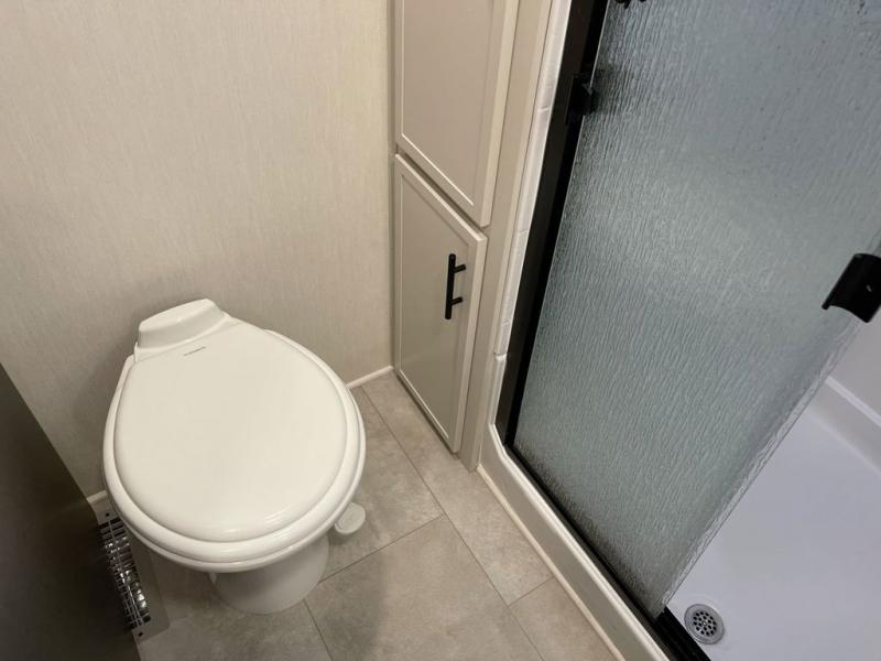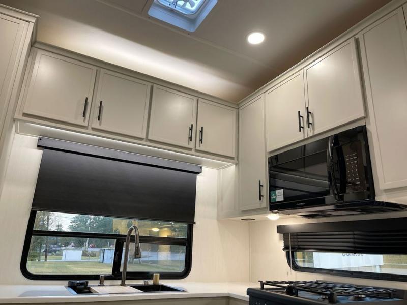 If you enjoy camping with family or friends, this fifth wheel is sure to meet all of your needs! The front bedroom includes a queen bed slide out for more space and comfort, plus a front wardrobe with washer and dryer prep. And the full bath is right next door for easy nighttime use. Your guests can utilize the middle bonus room that includes an E-Z glide sofa slide out, a private loft, and a half bath! The living room is made spacious thanks to the dual opposing slides, and you'll find a sectional sleeper sofa here, as well as desk with a chair and a free-standing table with chairs. And don't overlook the rear kitchen with ample counter space, a four burner range, an accessory sink and a French door 12V refrigerator!