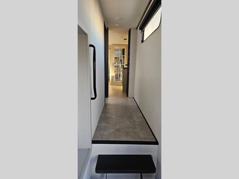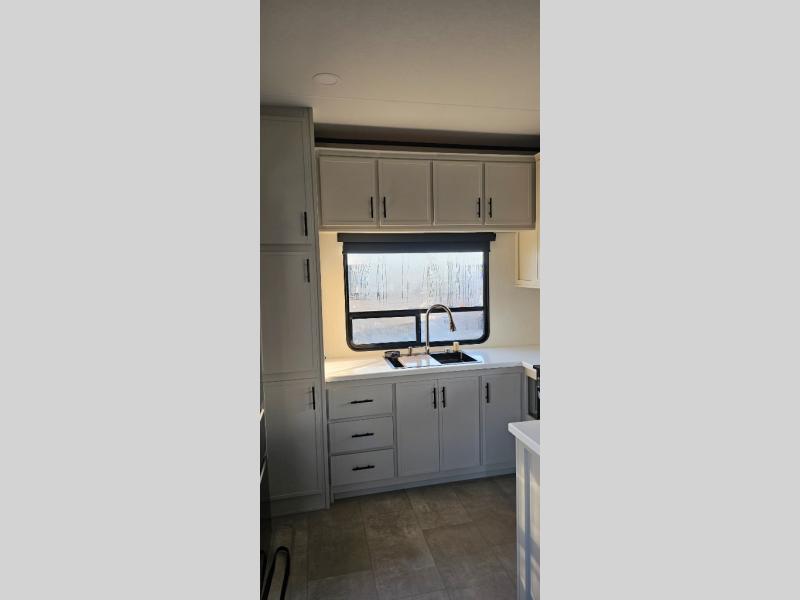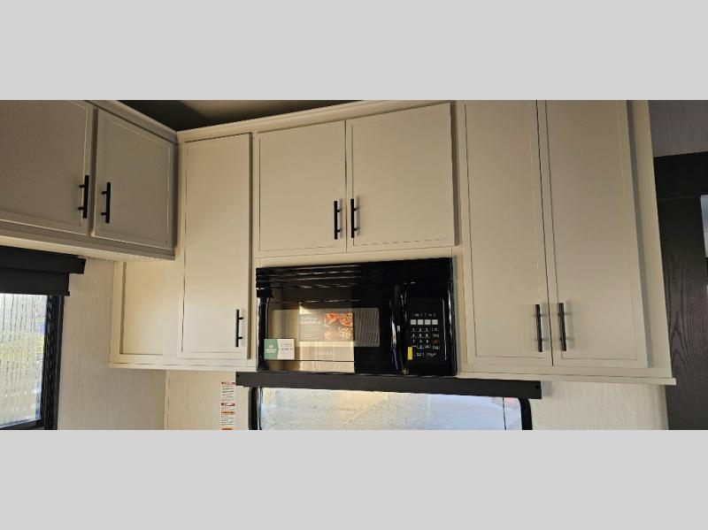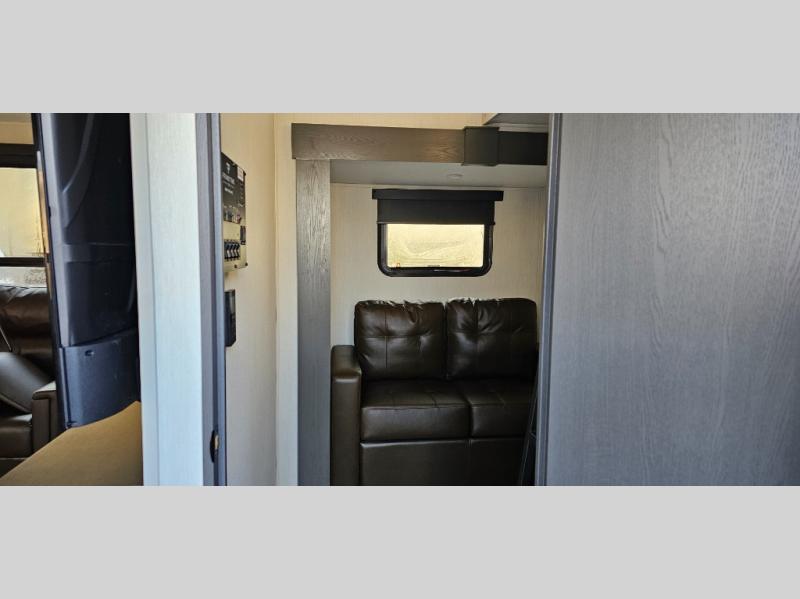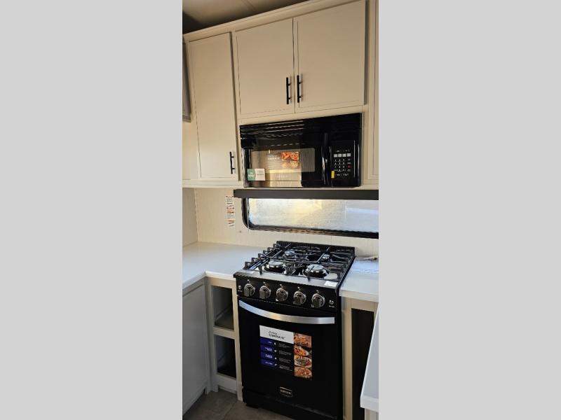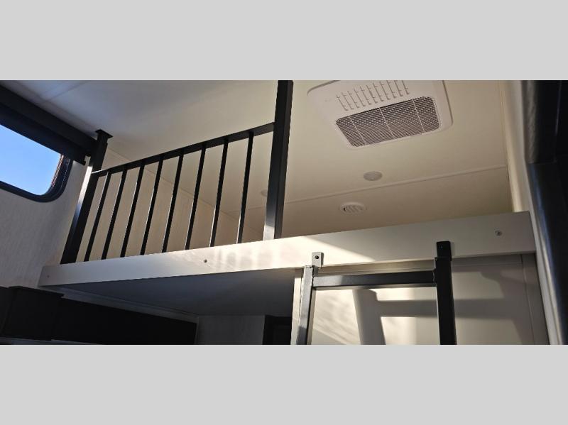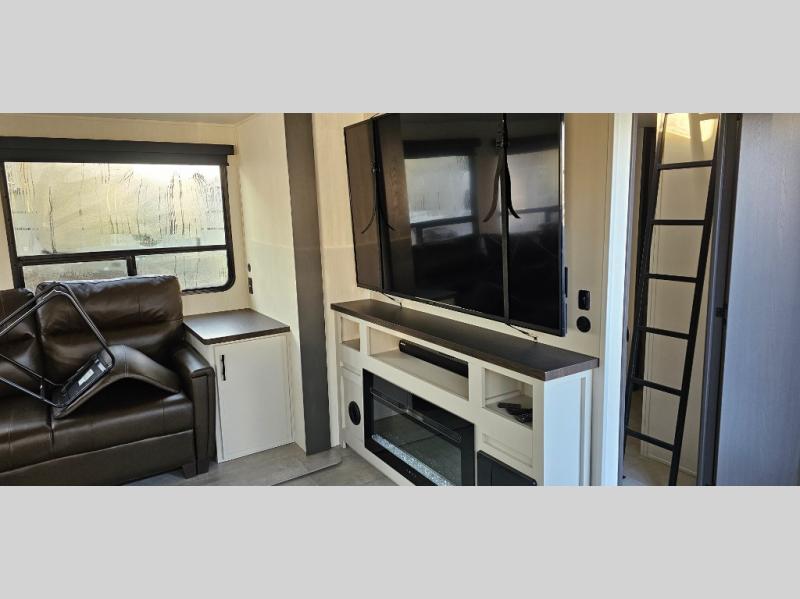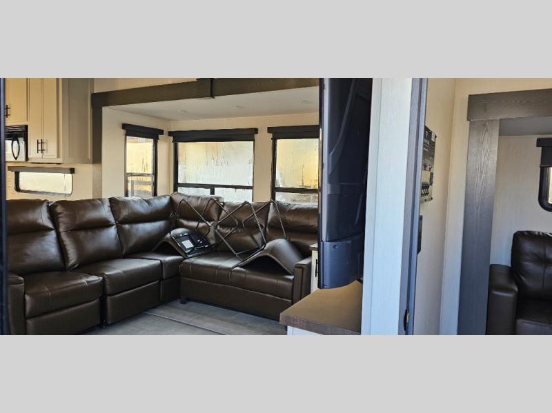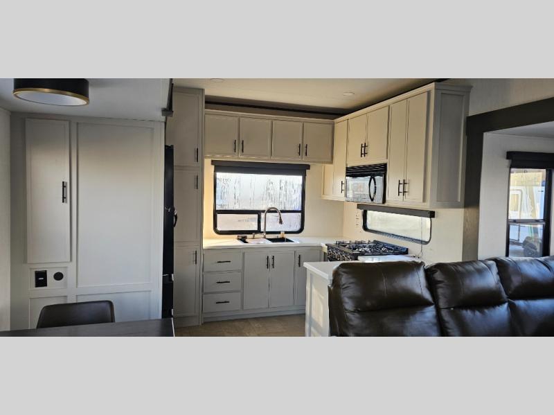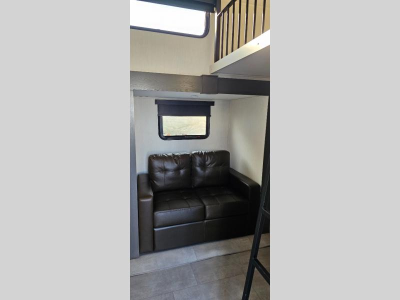 If you enjoy camping with family or friends, this fifth wheel is sure to meet all of your needs! The front bedroom includes a queen bed slide out for more space and comfort, plus a front wardrobe with washer and dryer prep. And the full bath is right next door for easy nighttime use. Your guests can utilize the middle bonus room that includes an E-Z glide sofa slide out, a private loft, and a half bath! The living room is made spacious thanks to the dual opposing slides, and you'll find a sectional sleeper sofa here, as well as desk with a chair and a free-standing table with chairs. And don't overlook the rear kitchen with ample counter space, a four burner range, an accessory sink and a French door 12V refrigerator!
