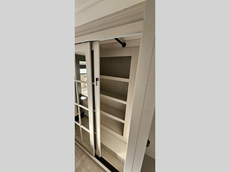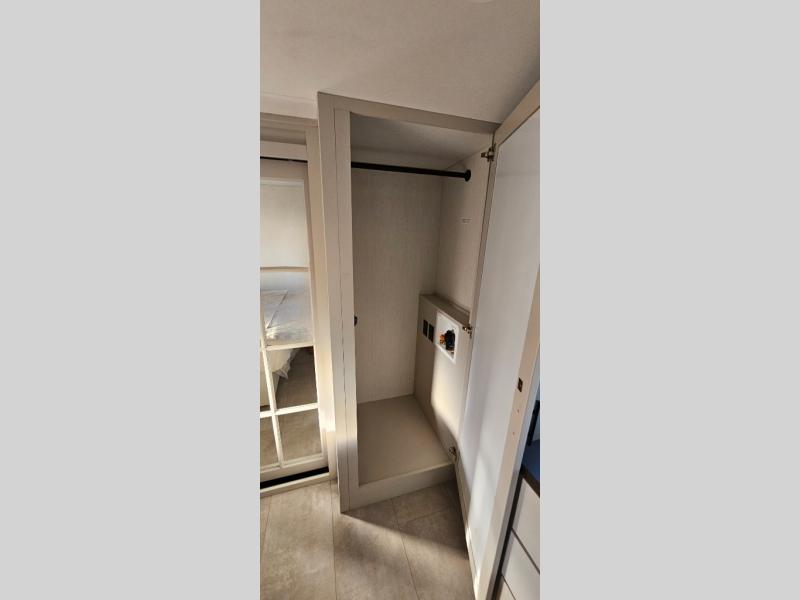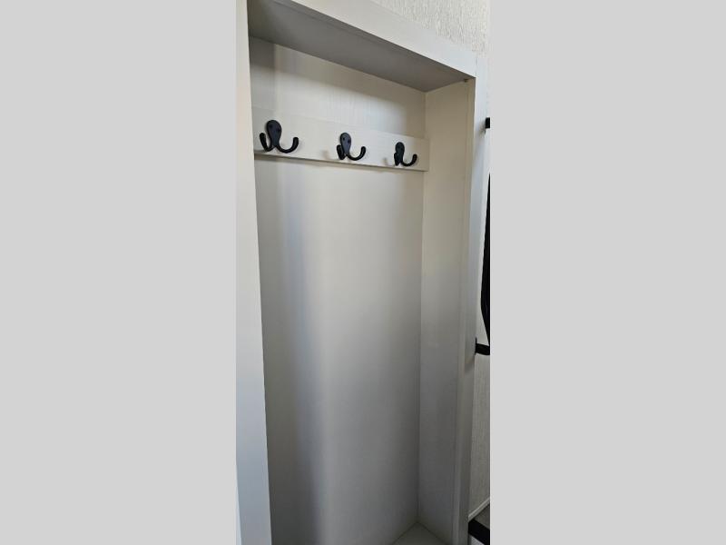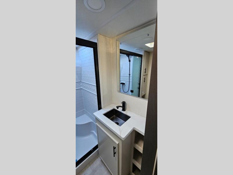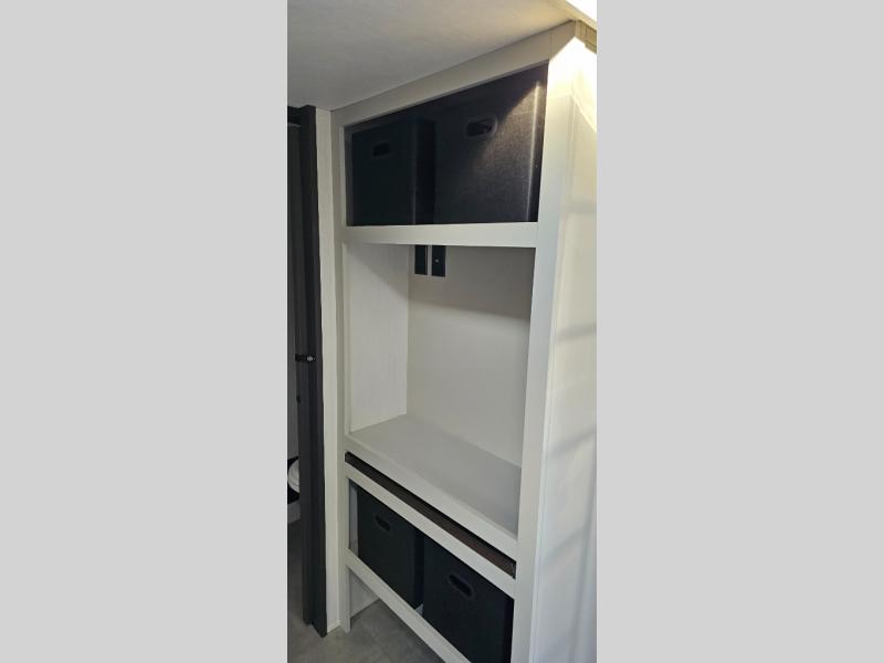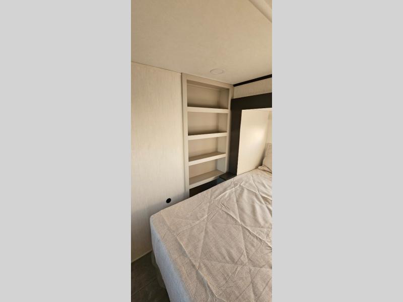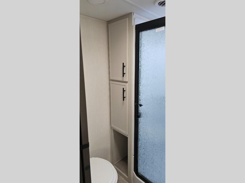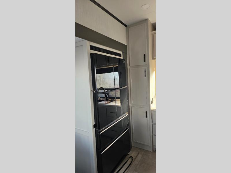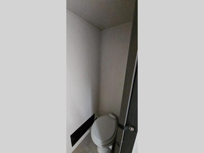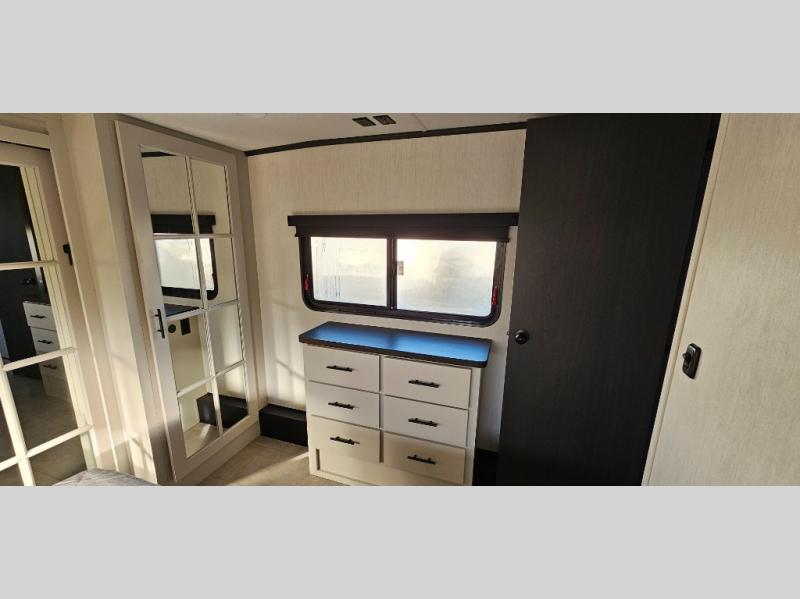 If you enjoy camping with family or friends, this fifth wheel is sure to meet all of your needs! The front bedroom includes a queen bed slide out for more space and comfort, plus a front wardrobe with washer and dryer prep. And the full bath is right next door for easy nighttime use. Your guests can utilize the middle bonus room that includes an E-Z glide sofa slide out, a private loft, and a half bath! The living room is made spacious thanks to the dual opposing slides, and you'll find a sectional sleeper sofa here, as well as desk with a chair and a free-standing table with chairs. And don't overlook the rear kitchen with ample counter space, a four burner range, an accessory sink and a French door 12V refrigerator!
