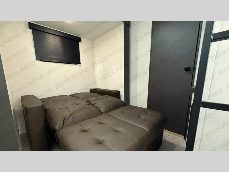 If you enjoy camping with family or friends, this fifth wheel is sure to meet all of your needs! The front bedroom includes a queen bed slide out for more space and comfort, plus a front wardrobe with washer and dryer prep. And the full bath is right next door for easy nighttime use. Your guests can utilize the middle bonus room that includes an E-Z glide sofa slide out, a private loft, and a half bath! The living room is made spacious thanks to the dual opposing slides, and you'll find a sectional sleeper sofa here, as well as desk with a chair and a free-standing table with chairs. And don't overlook the rear kitchen with ample counter space, a four burner range, an accessory sink and a French door 12V refrigerator!