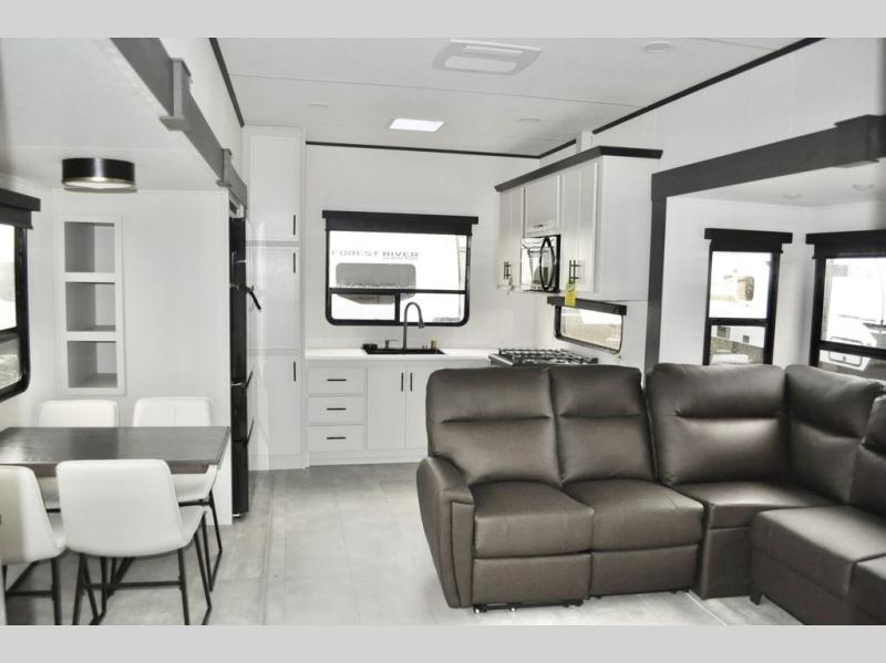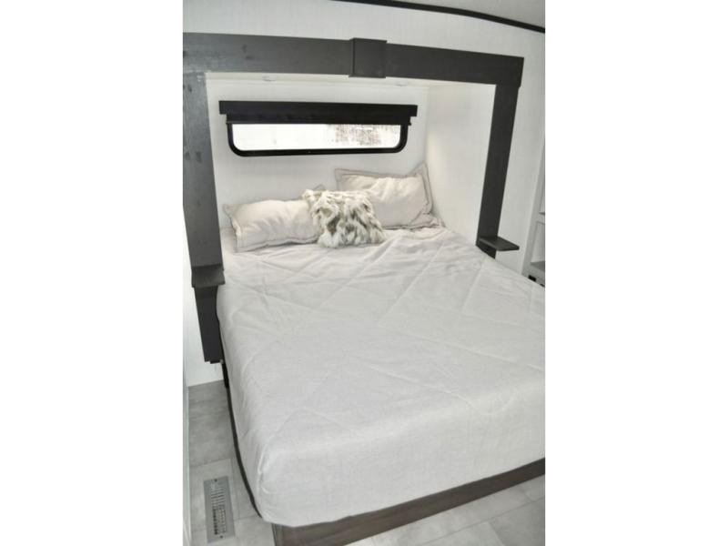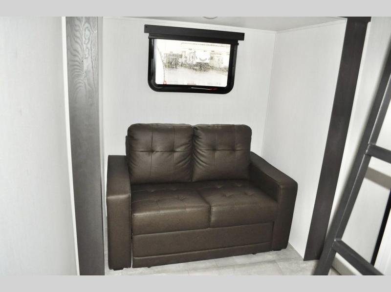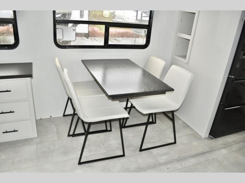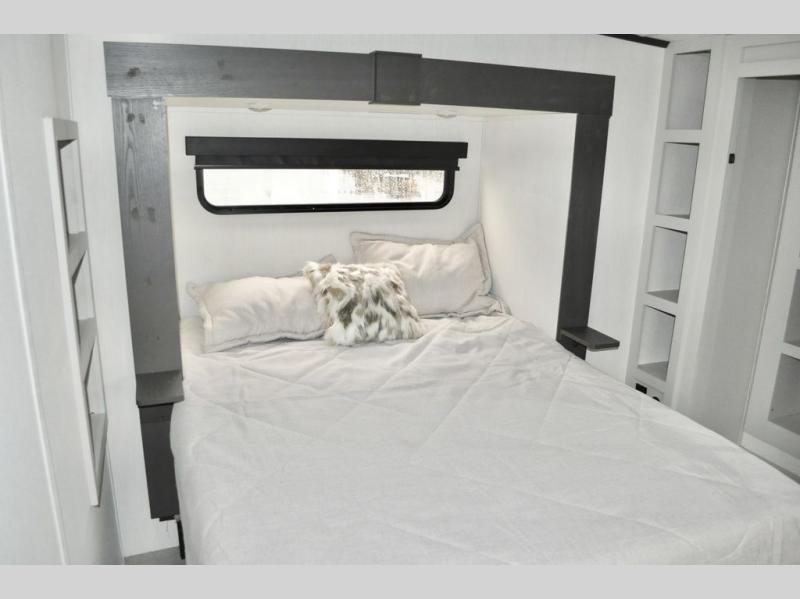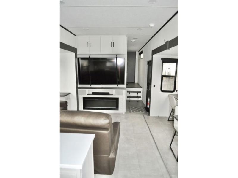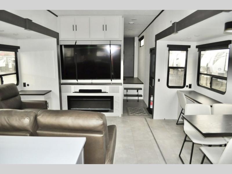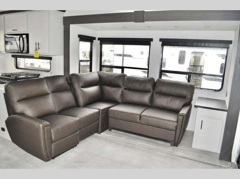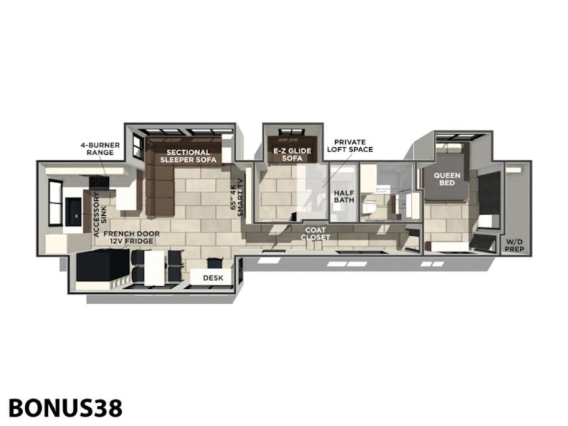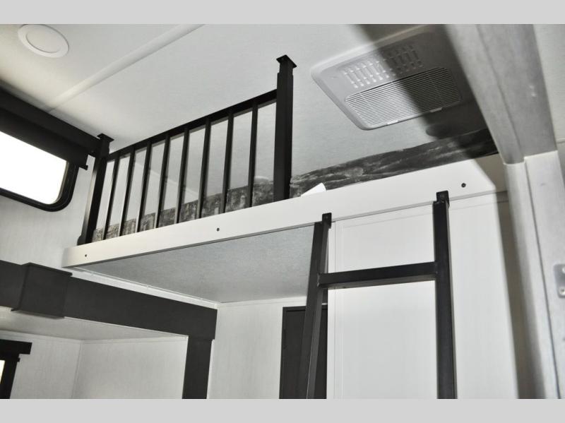 If you enjoy camping with family or friends, this fifth wheel is sure to meet all of your needs! The front bedroom includes a queen bed slide out for more space and comfort, plus a front wardrobe with washer and dryer prep. And the full bath is right next door for easy nighttime use. Your guests can utilize the middle bonus room that includes an E-Z glide sofa slide out, a private loft, and a half bath! The living room is made spacious thanks to the dual opposing slides, and you'll find a sectional sleeper sofa here, as well as desk with a chair and a free-standing table with chairs. And don't overlook the rear kitchen with ample counter space, a four burner range, an accessory sink and a French door 12V refrigerator!