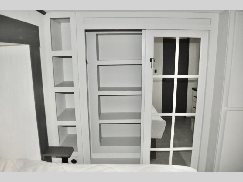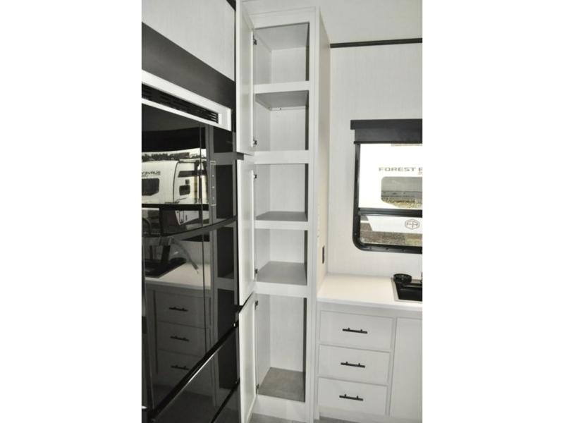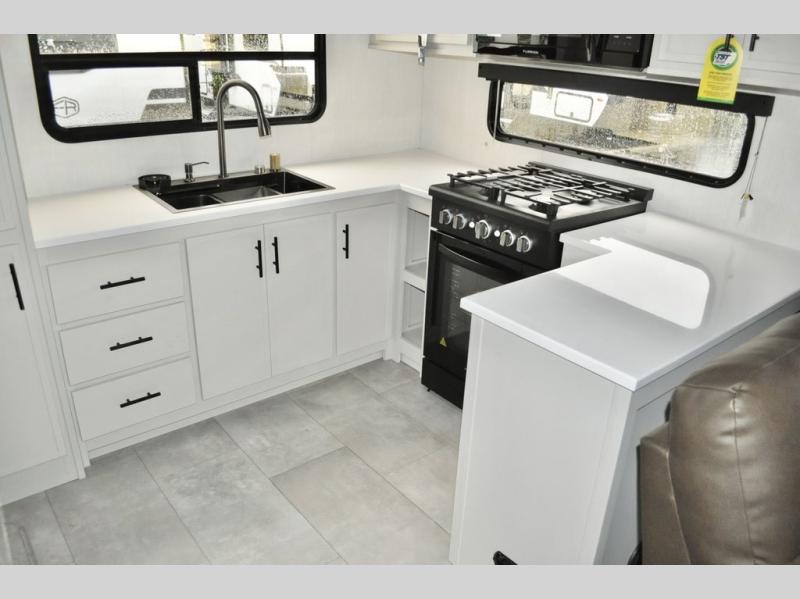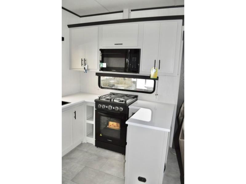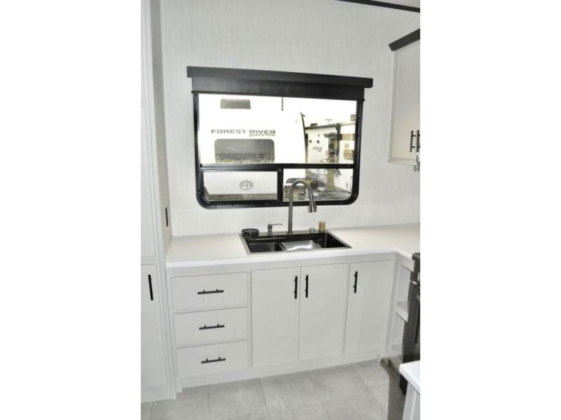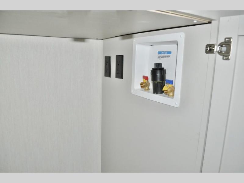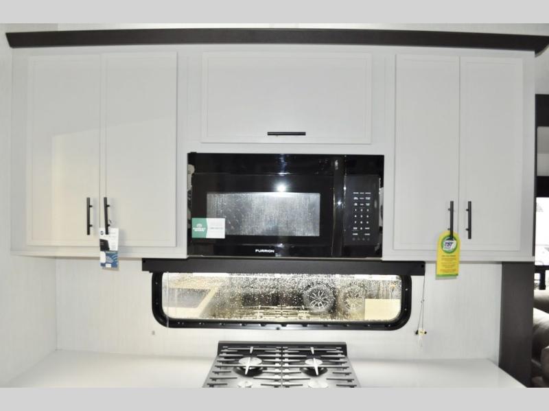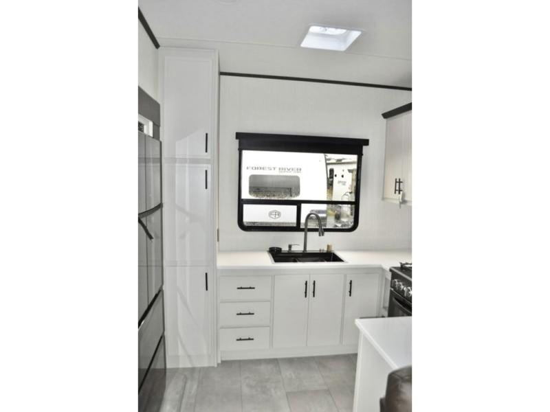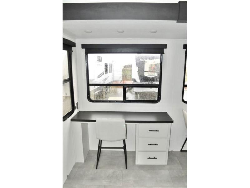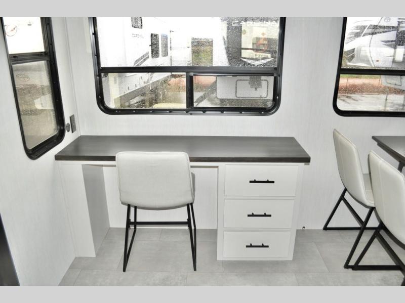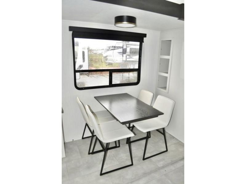 If you enjoy camping with family or friends, this fifth wheel is sure to meet all of your needs! The front bedroom includes a queen bed slide out for more space and comfort, plus a front wardrobe with washer and dryer prep. And the full bath is right next door for easy nighttime use. Your guests can utilize the middle bonus room that includes an E-Z glide sofa slide out, a private loft, and a half bath! The living room is made spacious thanks to the dual opposing slides, and you'll find a sectional sleeper sofa here, as well as desk with a chair and a free-standing table with chairs. And don't overlook the rear kitchen with ample counter space, a four burner range, an accessory sink and a French door 12V refrigerator!