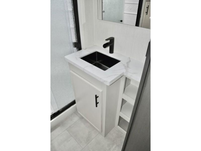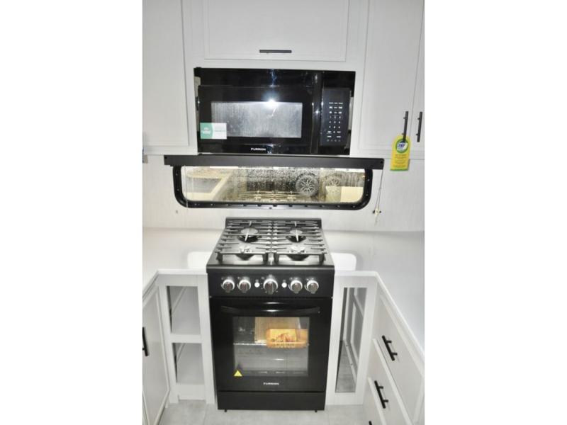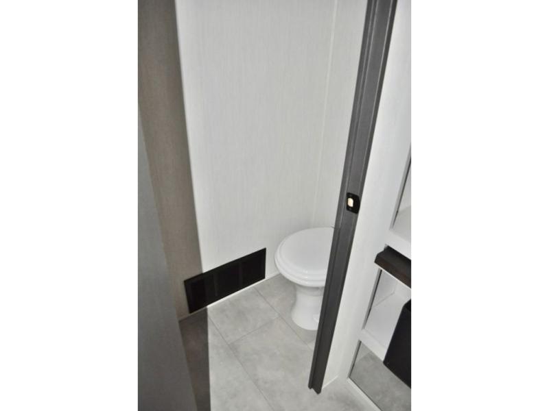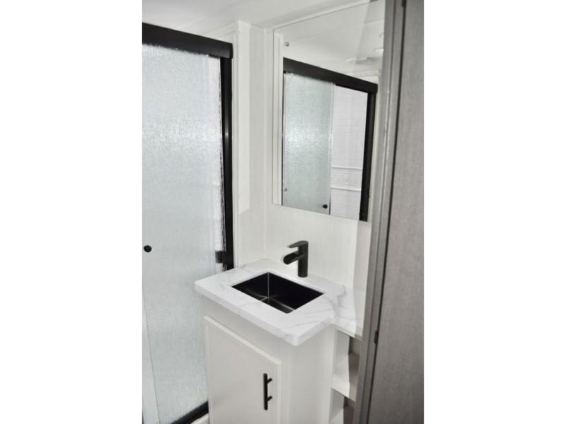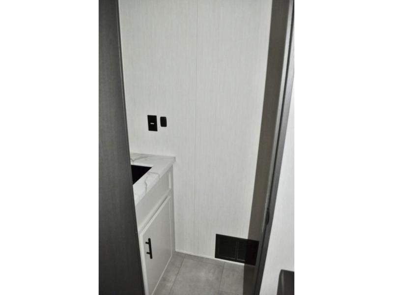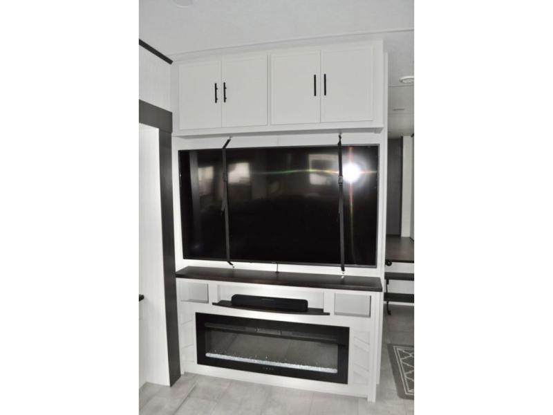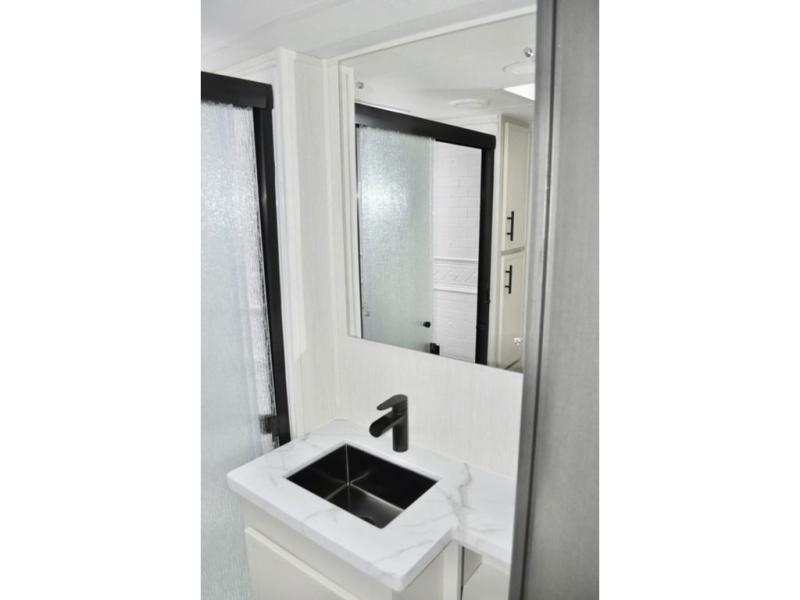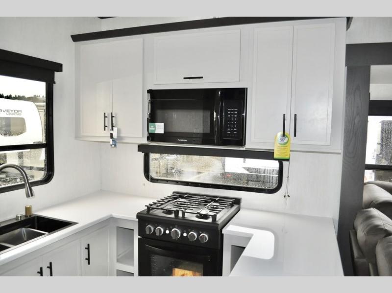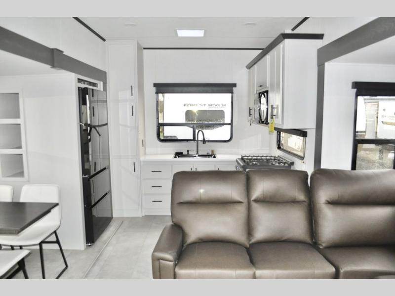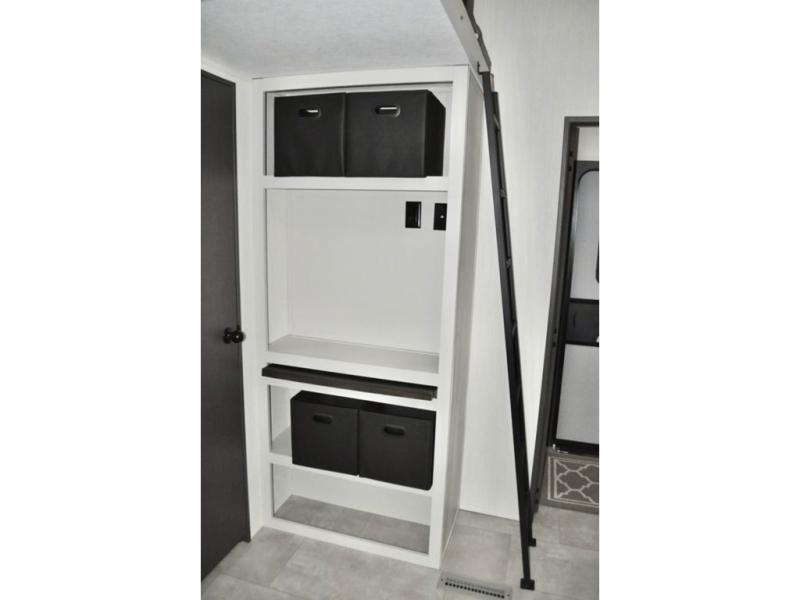 If you enjoy camping with family or friends, this fifth wheel is sure to meet all of your needs! The front bedroom includes a queen bed slide out for more space and comfort, plus a front wardrobe with washer and dryer prep. And the full bath is right next door for easy nighttime use. Your guests can utilize the middle bonus room that includes an E-Z glide sofa slide out, a private loft, and a half bath! The living room is made spacious thanks to the dual opposing slides, and you'll find a sectional sleeper sofa here, as well as desk with a chair and a free-standing table with chairs. And don't overlook the rear kitchen with ample counter space, a four burner range, an accessory sink and a French door 12V refrigerator!