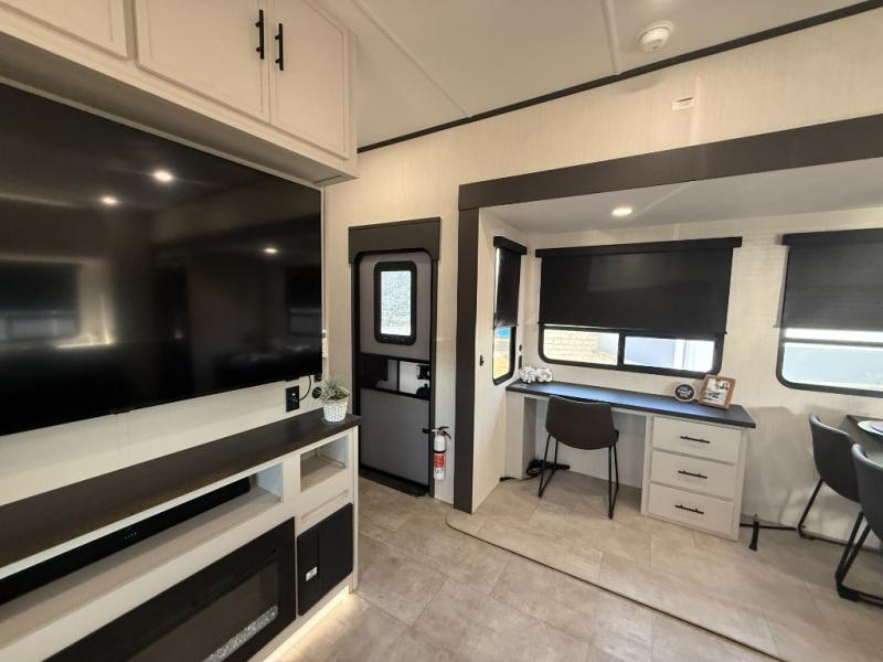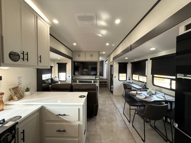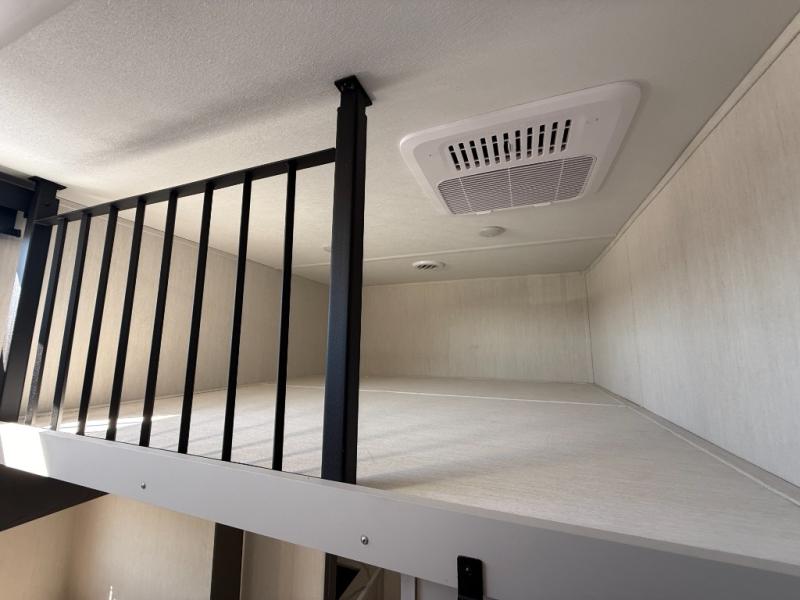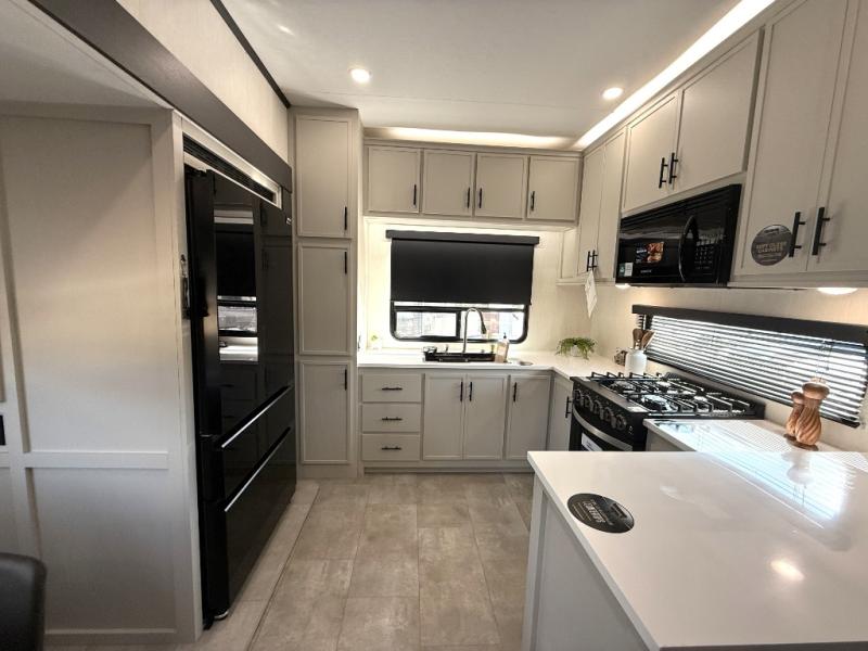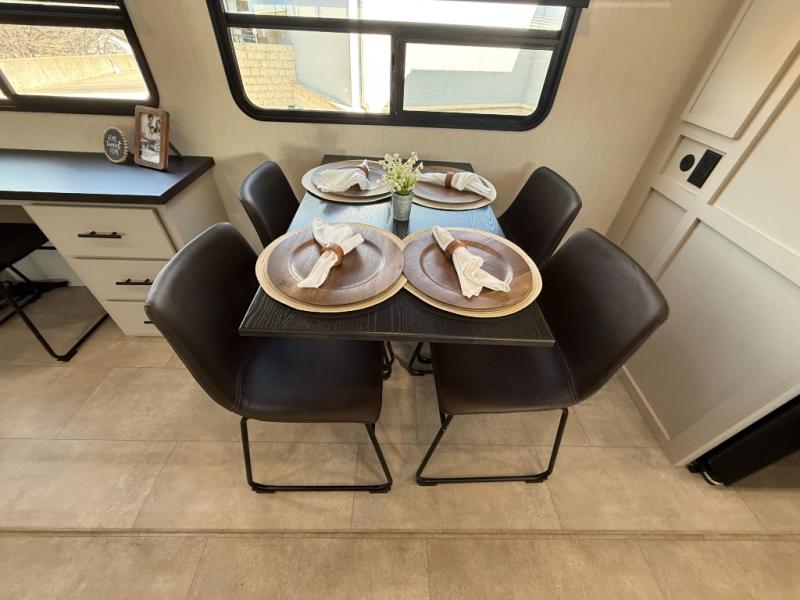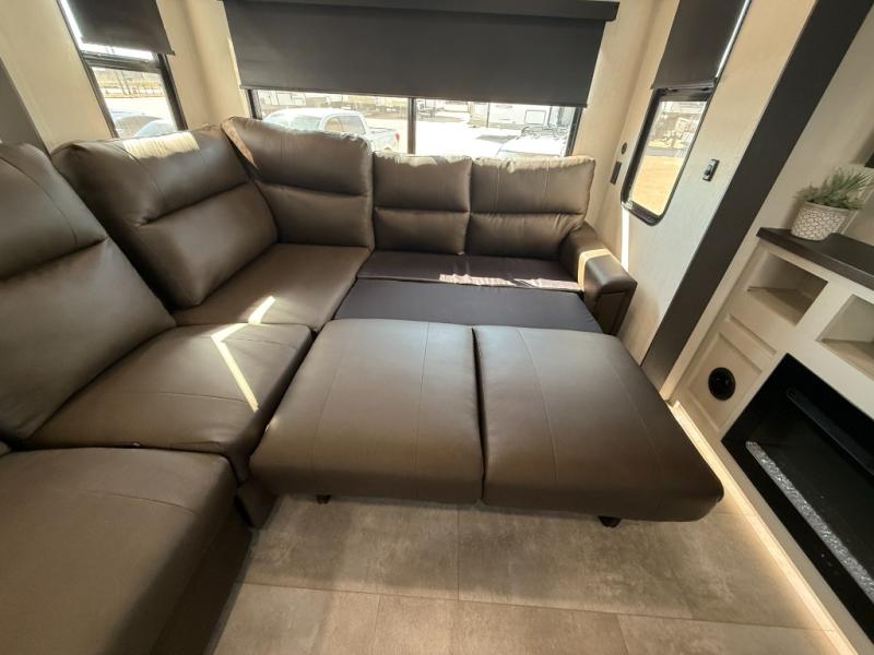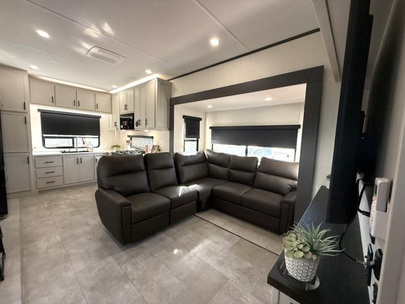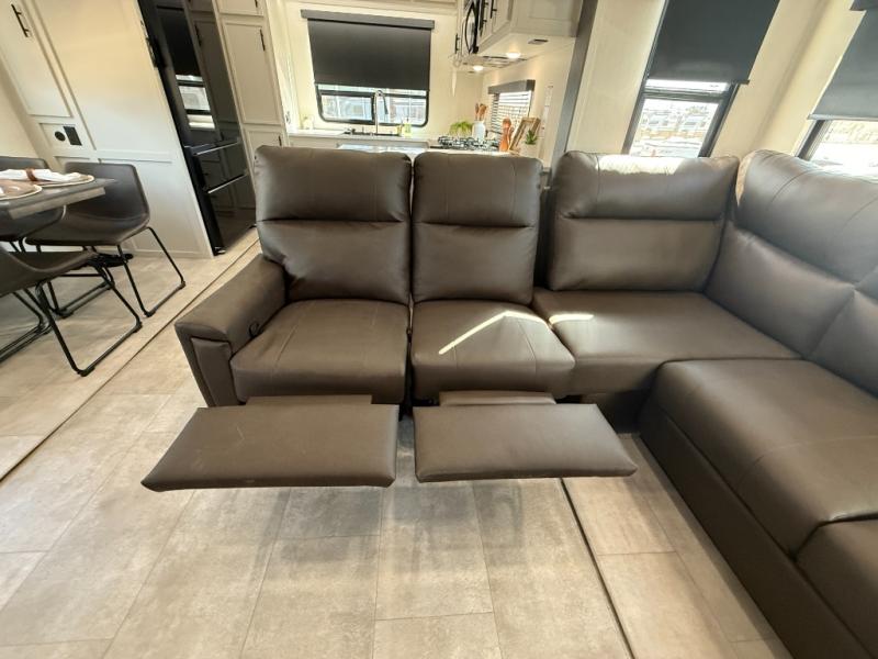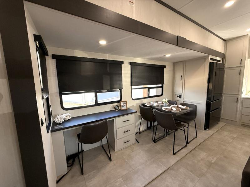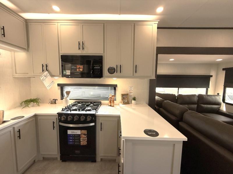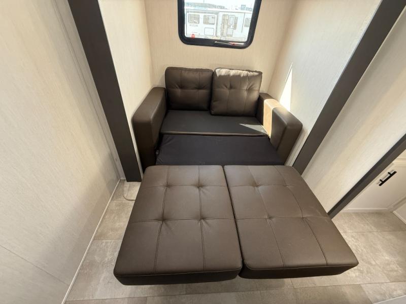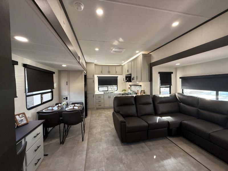 If you enjoy camping with family or friends, this fifth wheel is sure to meet all of your needs! The front bedroom includes a queen bed slide out for more space and comfort, plus a front wardrobe with washer and dryer prep. And the full bath is right next door for easy nighttime use. Your guests can utilize the middle bonus room that includes an E-Z glide sofa slide out, a private loft, and a half bath! The living room is made spacious thanks to the dual opposing slides, and you'll find a sectional sleeper sofa here, as well as desk with a chair and a free-standing table with chairs. And don't overlook the rear kitchen with ample counter space, a four burner range, an accessory sink and a French door 12V refrigerator!
