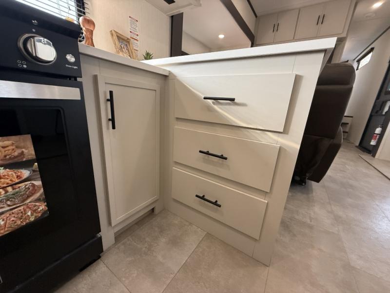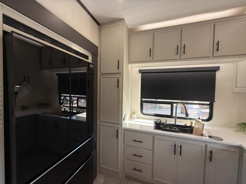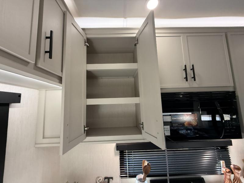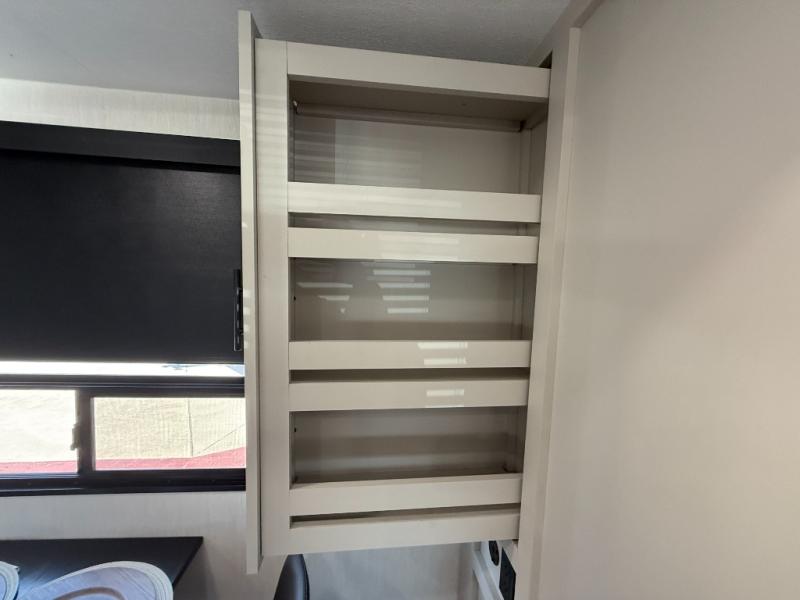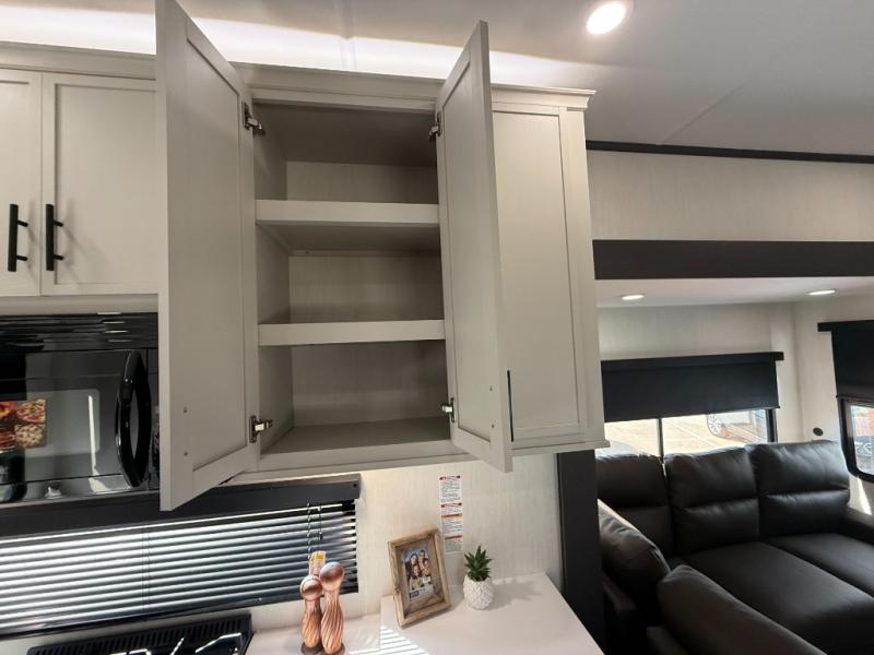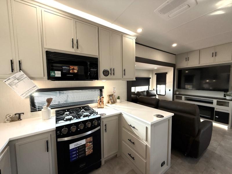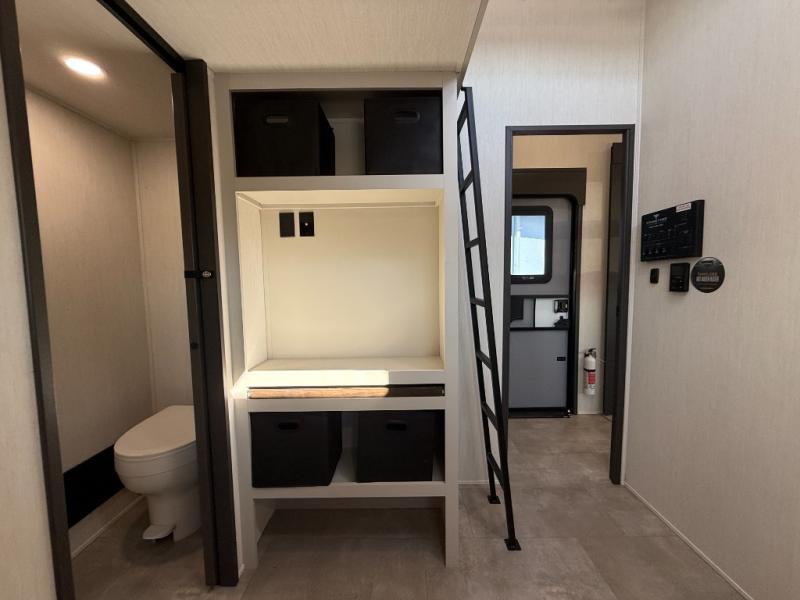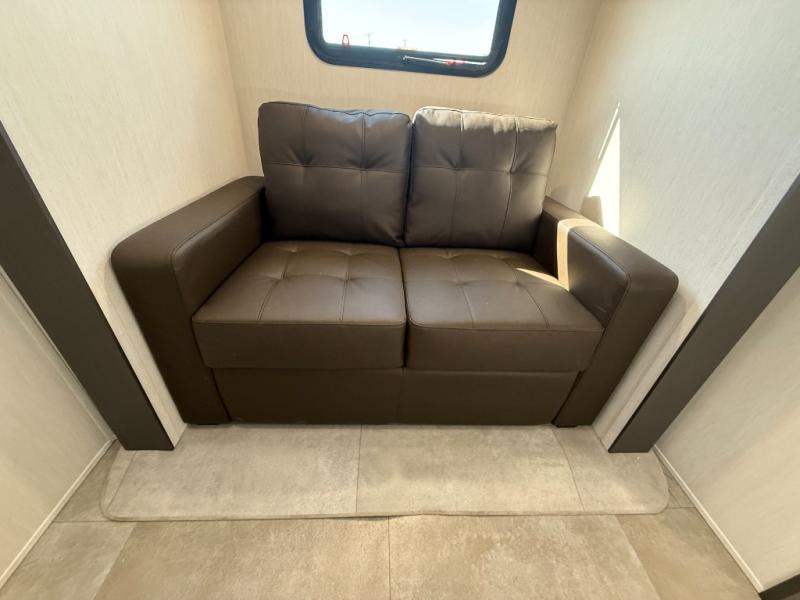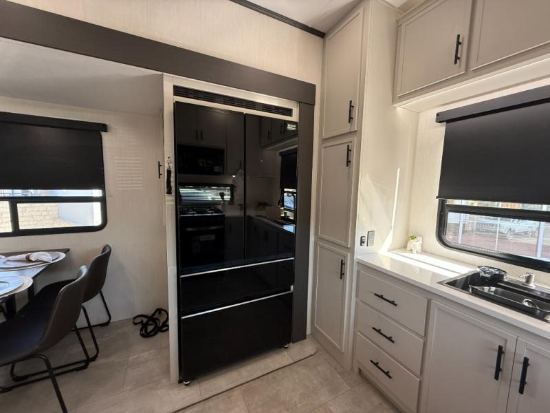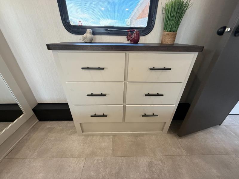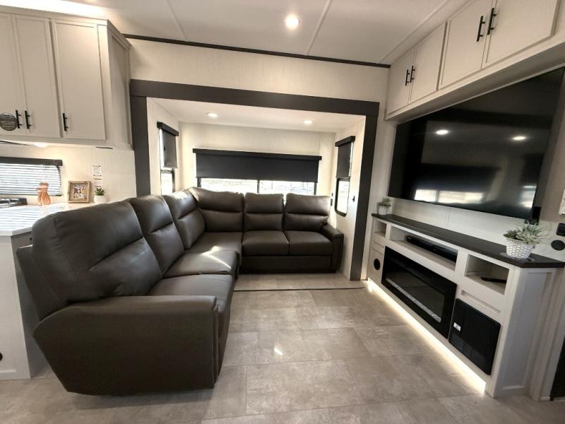 If you enjoy camping with family or friends, this fifth wheel is sure to meet all of your needs! The front bedroom includes a queen bed slide out for more space and comfort, plus a front wardrobe with washer and dryer prep. And the full bath is right next door for easy nighttime use. Your guests can utilize the middle bonus room that includes an E-Z glide sofa slide out, a private loft, and a half bath! The living room is made spacious thanks to the dual opposing slides, and you'll find a sectional sleeper sofa here, as well as desk with a chair and a free-standing table with chairs. And don't overlook the rear kitchen with ample counter space, a four burner range, an accessory sink and a French door 12V refrigerator!