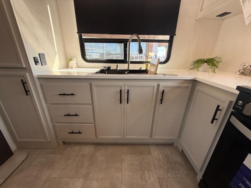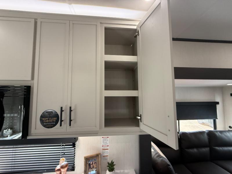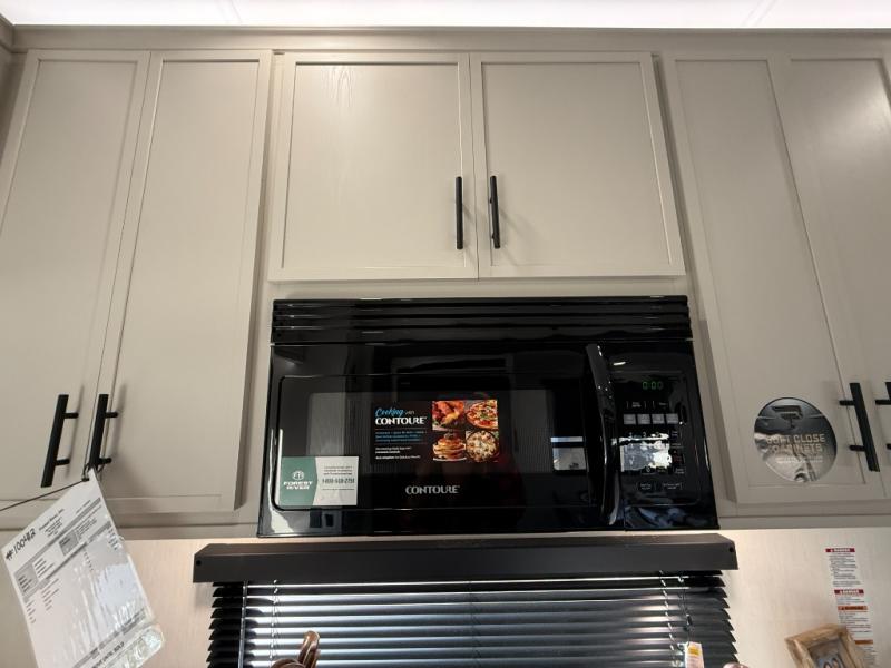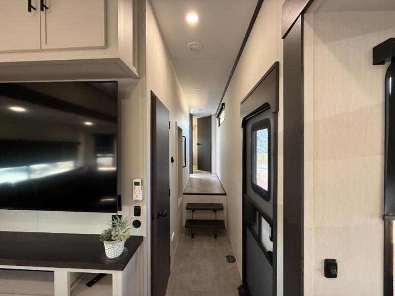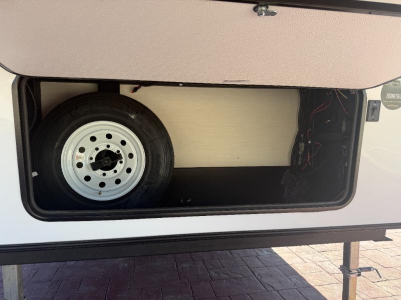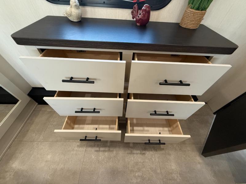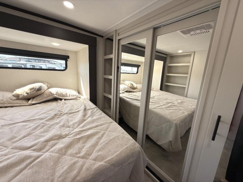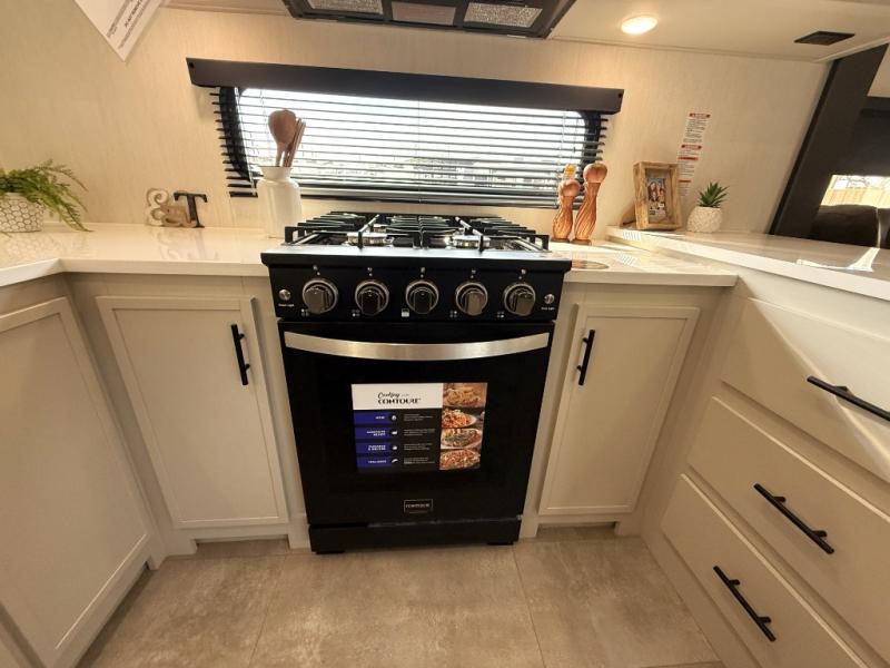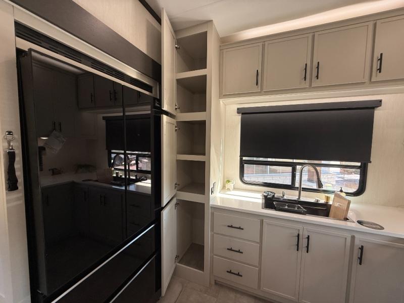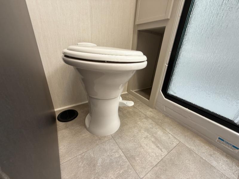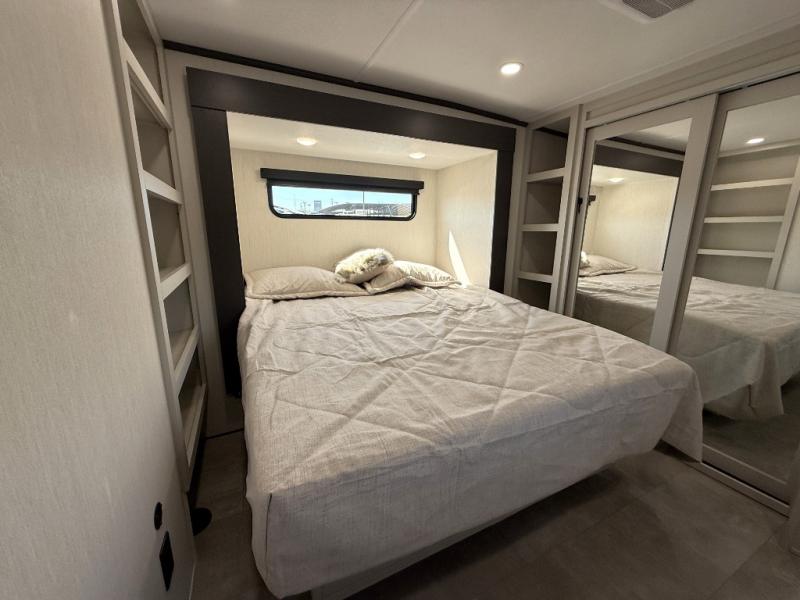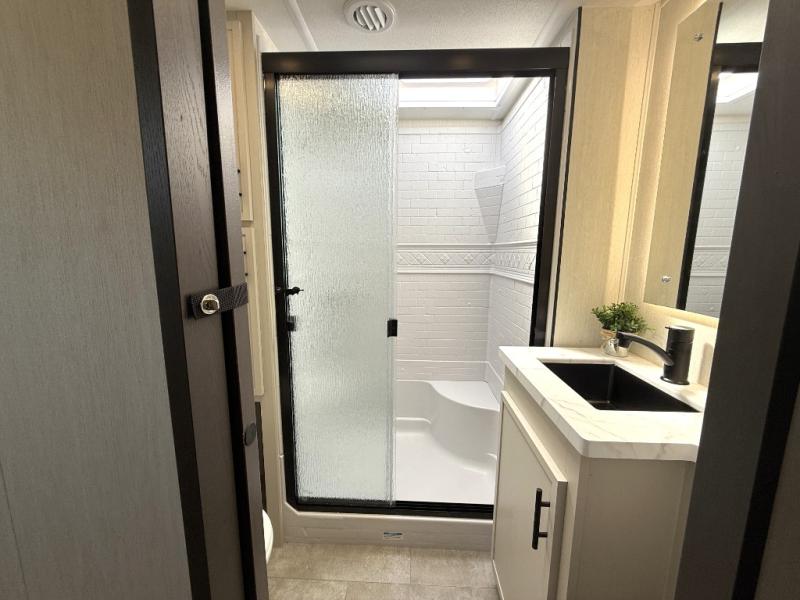 If you enjoy camping with family or friends, this fifth wheel is sure to meet all of your needs! The front bedroom includes a queen bed slide out for more space and comfort, plus a front wardrobe with washer and dryer prep. And the full bath is right next door for easy nighttime use. Your guests can utilize the middle bonus room that includes an E-Z glide sofa slide out, a private loft, and a half bath! The living room is made spacious thanks to the dual opposing slides, and you'll find a sectional sleeper sofa here, as well as desk with a chair and a free-standing table with chairs. And don't overlook the rear kitchen with ample counter space, a four burner range, an accessory sink and a French door 12V refrigerator!