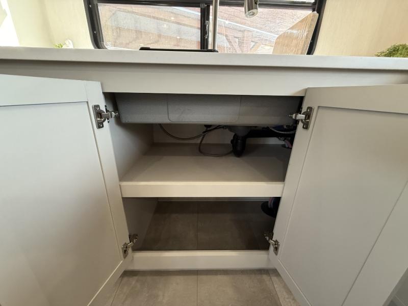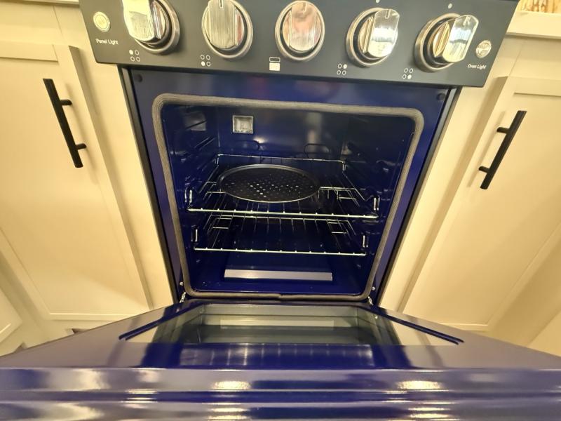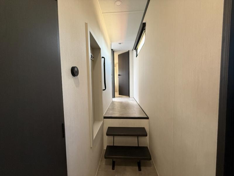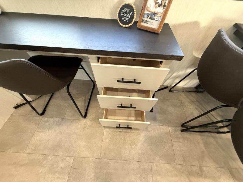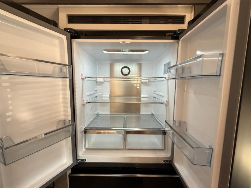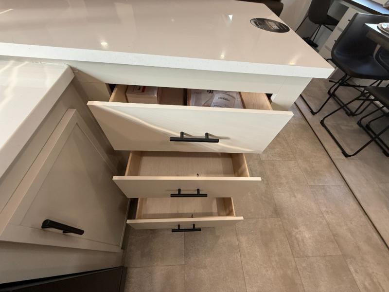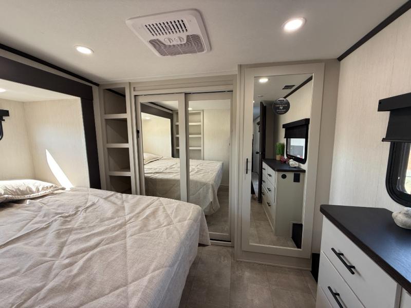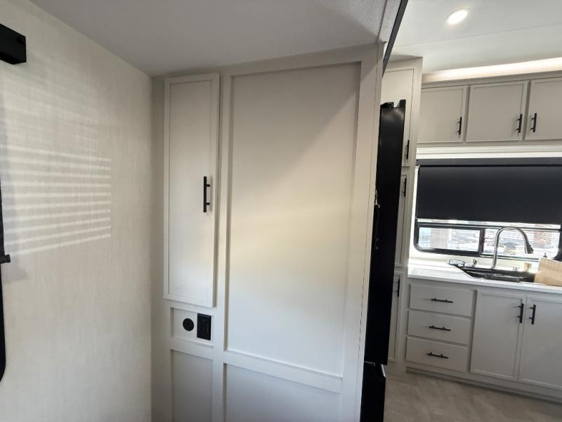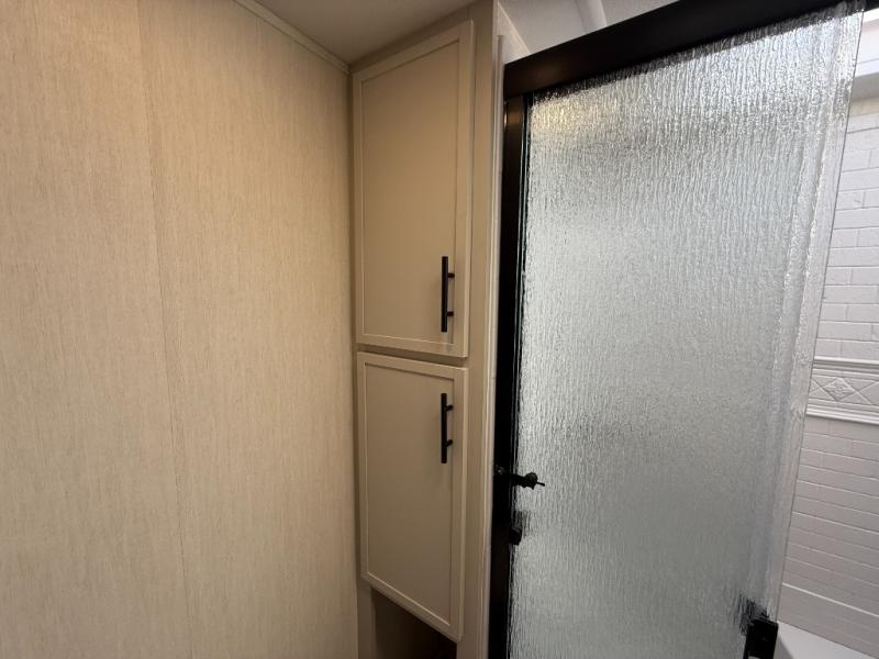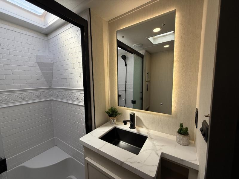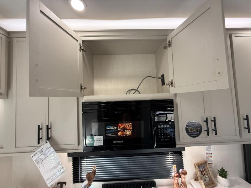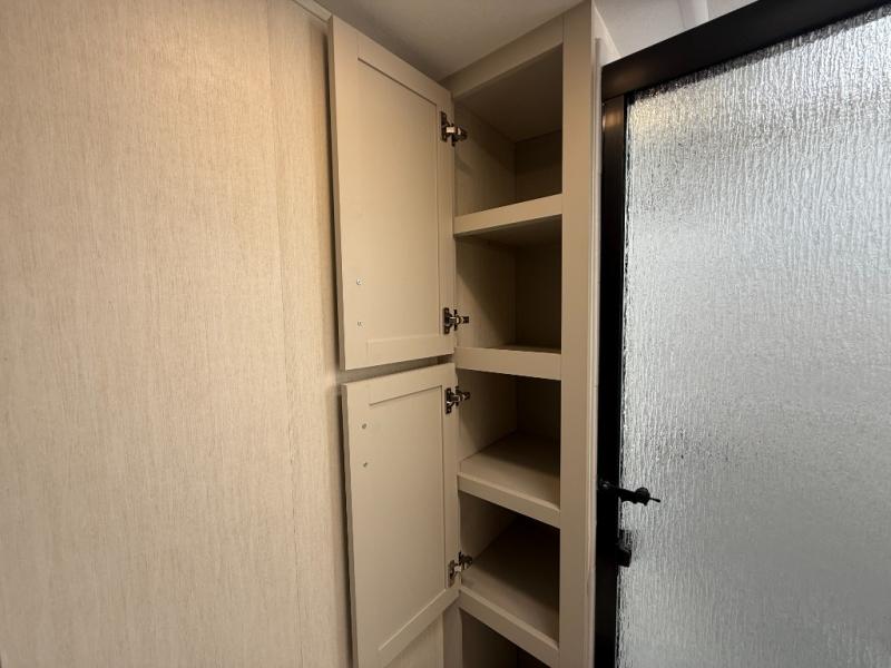 If you enjoy camping with family or friends, this fifth wheel is sure to meet all of your needs! The front bedroom includes a queen bed slide out for more space and comfort, plus a front wardrobe with washer and dryer prep. And the full bath is right next door for easy nighttime use. Your guests can utilize the middle bonus room that includes an E-Z glide sofa slide out, a private loft, and a half bath! The living room is made spacious thanks to the dual opposing slides, and you'll find a sectional sleeper sofa here, as well as desk with a chair and a free-standing table with chairs. And don't overlook the rear kitchen with ample counter space, a four burner range, an accessory sink and a French door 12V refrigerator!