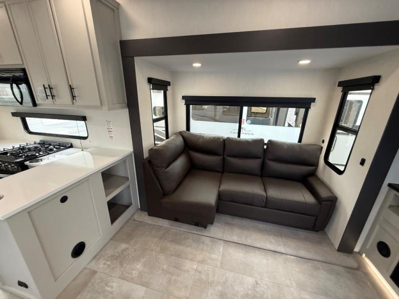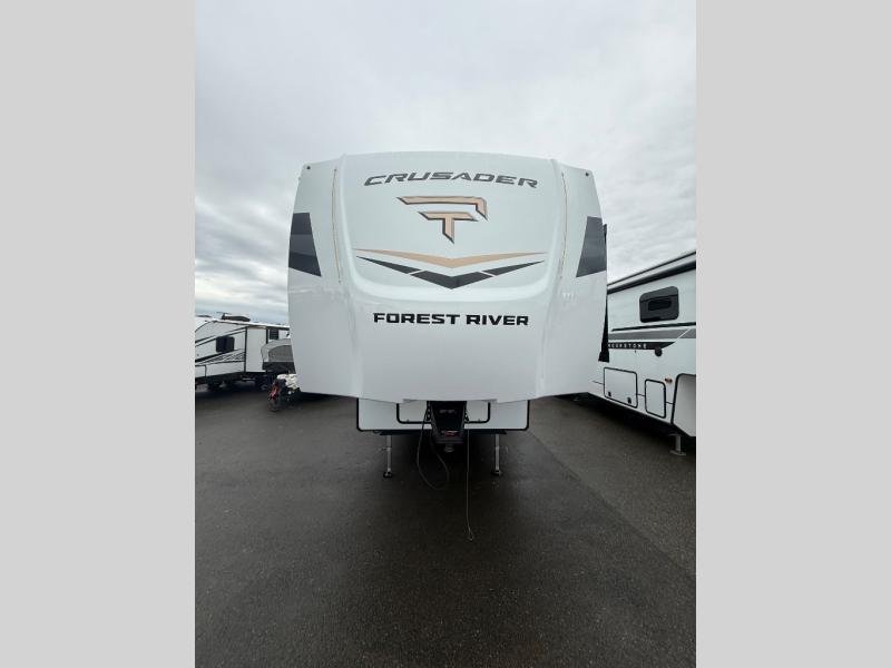 With any Crusader fifth wheel by Prime Time, you will enjoy outstanding quality and premium features! The Dexter E-Z Flex rubberized suspension equalizer will help make towing smoother than ever, and the high gloss gel coated exterior fiberglass is sure to be eye-catching. There are also thick insulated pass-through storage baggage doors outside, along with a 102" wide body, and hassle-free one-touch auto leveling. Inside, you'll find real wood cabinet doors, carpet-less slide rooms, blackout roller shades, and stain resistant, easy clean furniture. The Crusader fifth wheels are built with Eternabond construction, a one-piece PVC roof membrane, radiant foil insulation, plus rack and pinion slide systems.