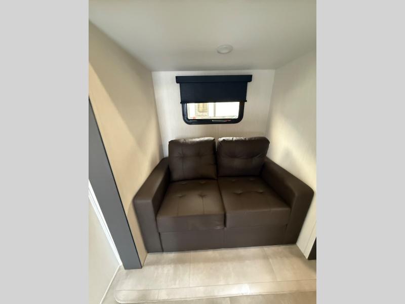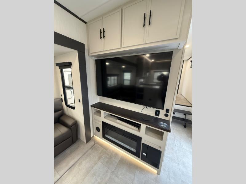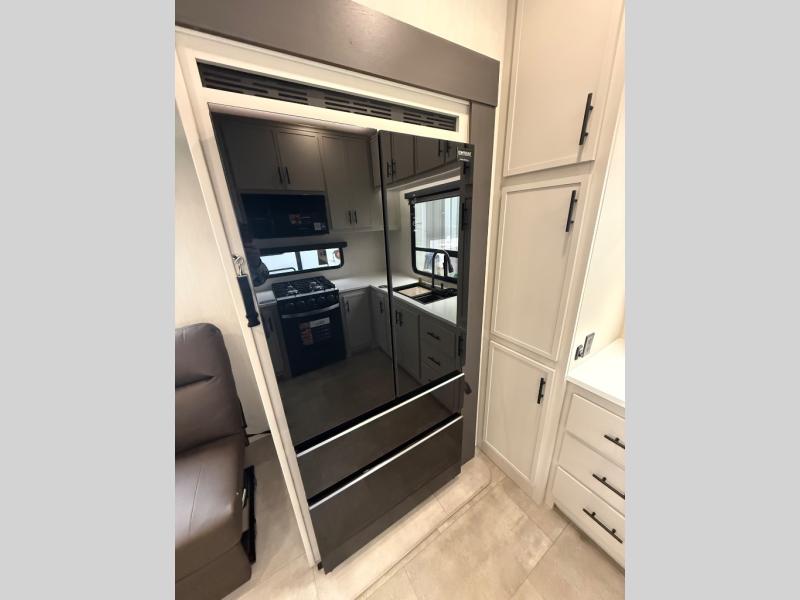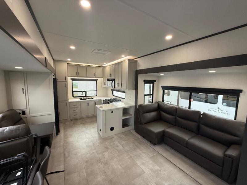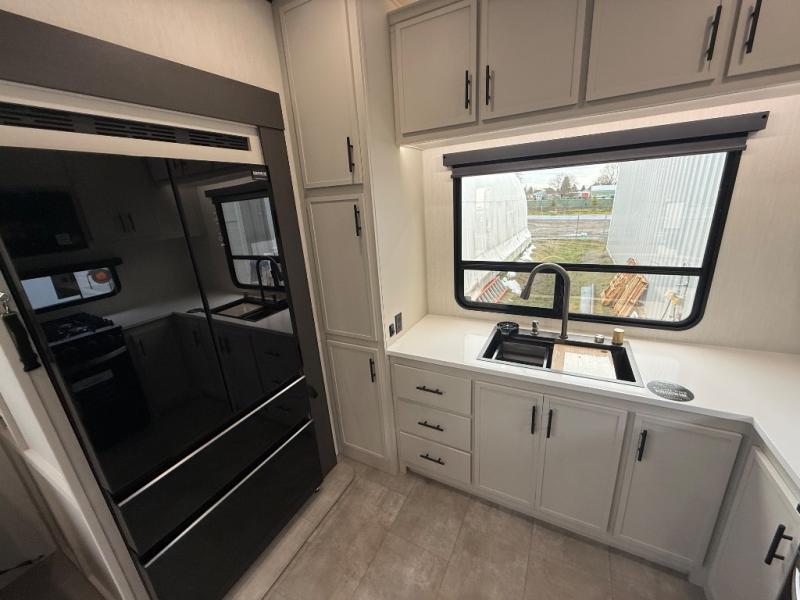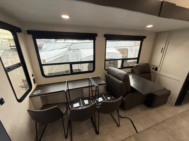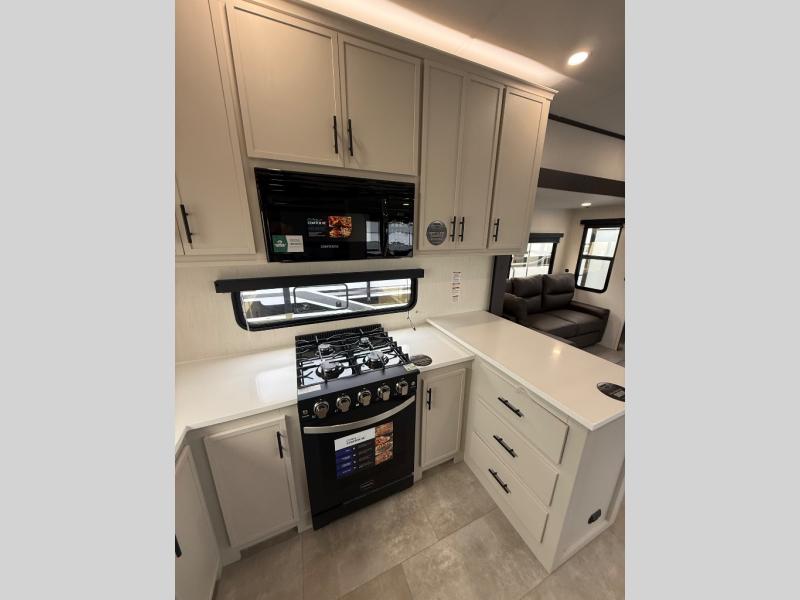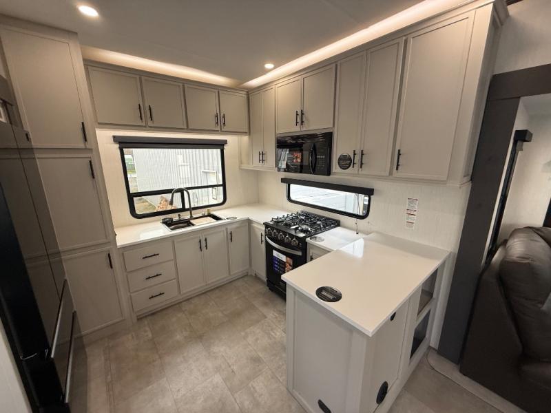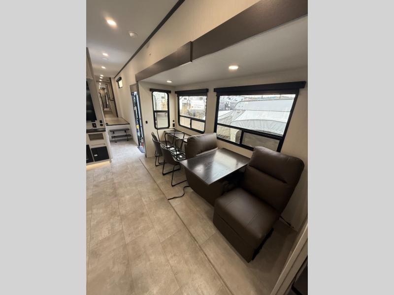 If you enjoy camping with family or friends, this fifth wheel is sure to meet all of your needs! The front bedroom includes a queen bed slide out for more space and comfort, plus a front wardrobe with washer and dryer prep. And the full bath is right next door for easy nighttime use. Your guests can utilize the middle bonus room that includes an E-Z glide sofa slide out, a private loft, and a half bath! The living room is made spacious thanks to the dual opposing slides, and you'll find a sectional sleeper sofa here, as well as desk with a chair and a free-standing table with chairs. And don't overlook the rear kitchen with ample counter space, a four burner range, an accessory sink and a French door 12V refrigerator!