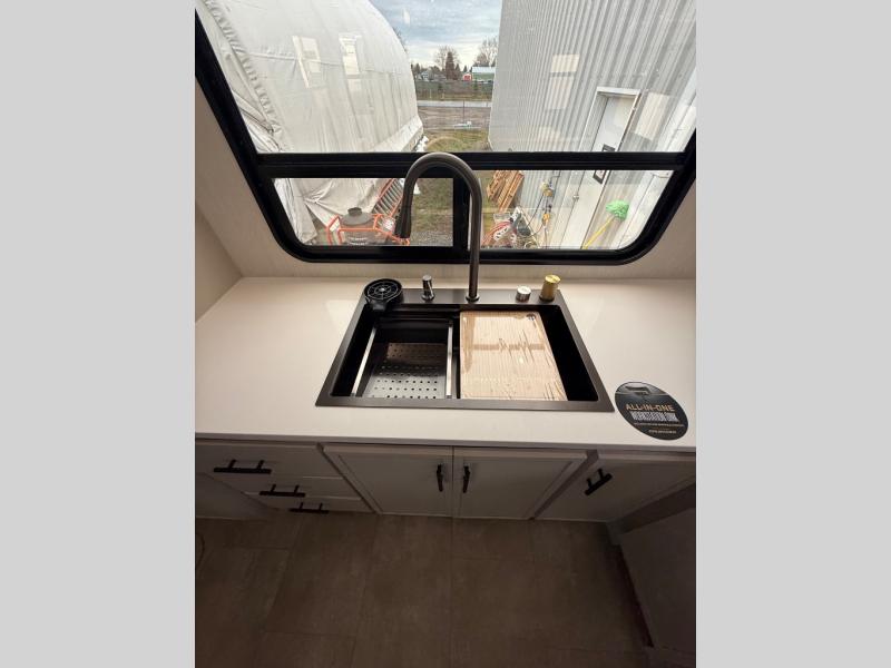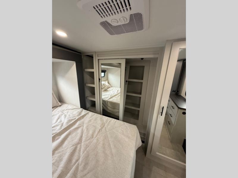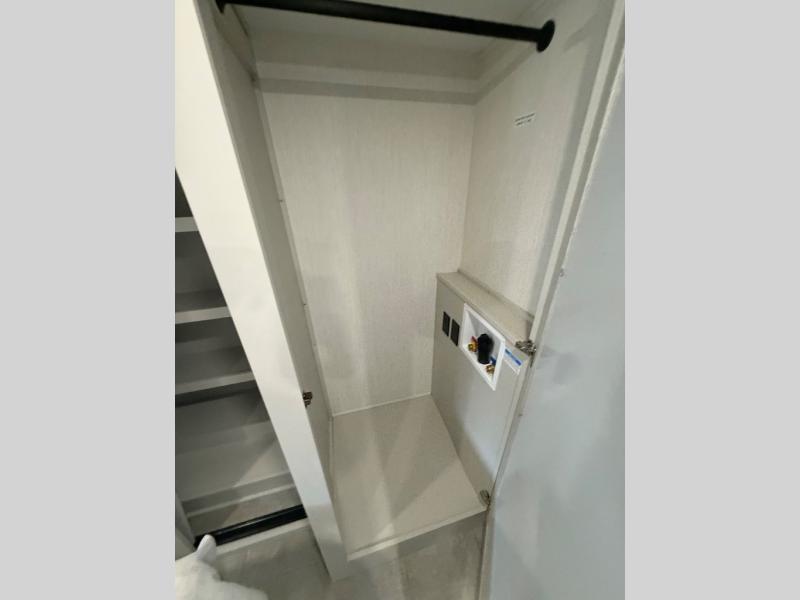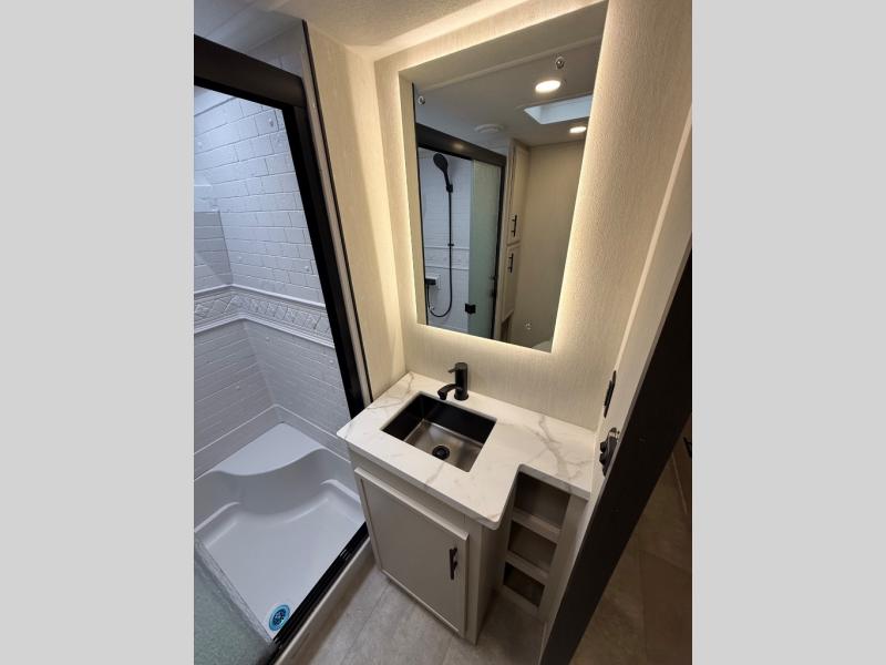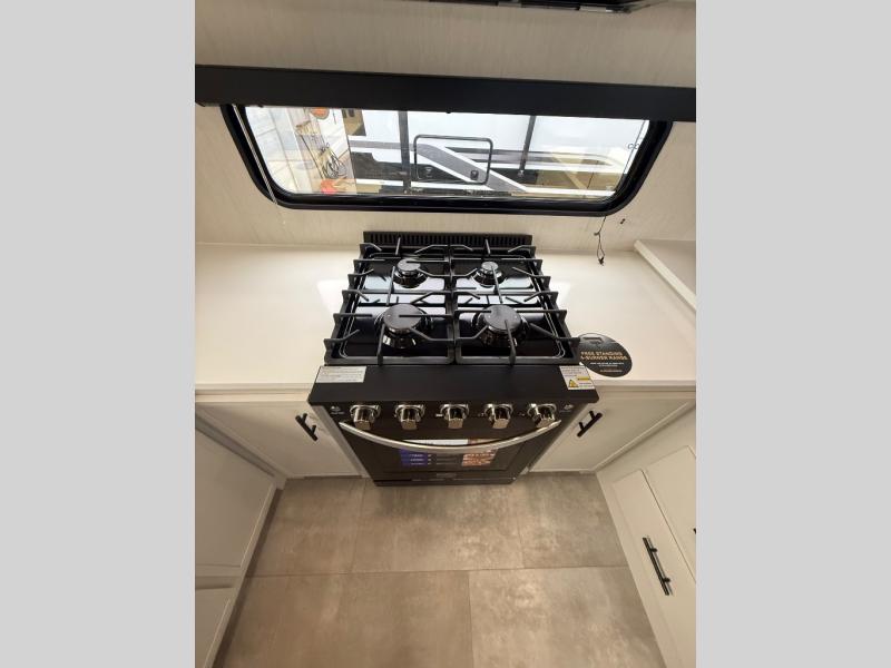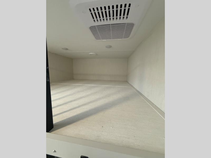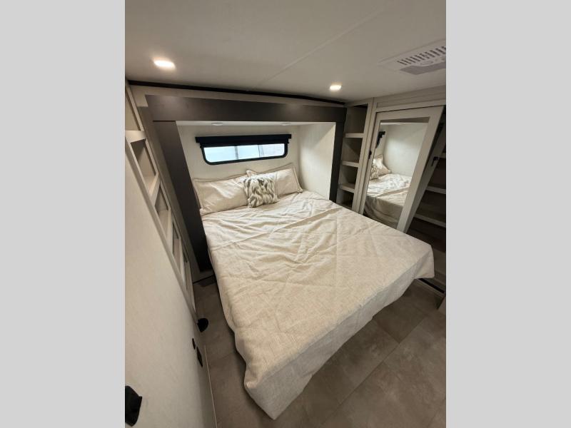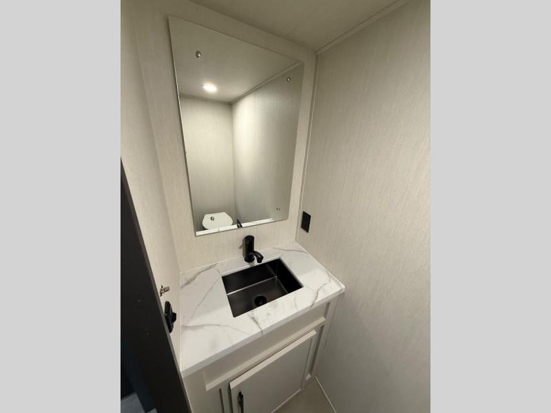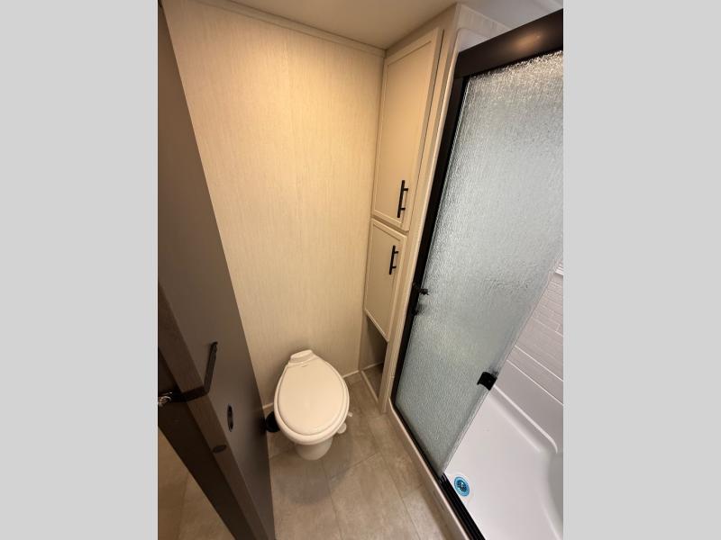 If you enjoy camping with family or friends, this fifth wheel is sure to meet all of your needs! The front bedroom includes a queen bed slide out for more space and comfort, plus a front wardrobe with washer and dryer prep. And the full bath is right next door for easy nighttime use. Your guests can utilize the middle bonus room that includes an E-Z glide sofa slide out, a private loft, and a half bath! The living room is made spacious thanks to the dual opposing slides, and you'll find a sectional sleeper sofa here, as well as desk with a chair and a free-standing table with chairs. And don't overlook the rear kitchen with ample counter space, a four burner range, an accessory sink and a French door 12V refrigerator!
