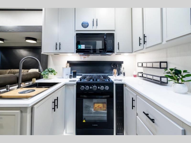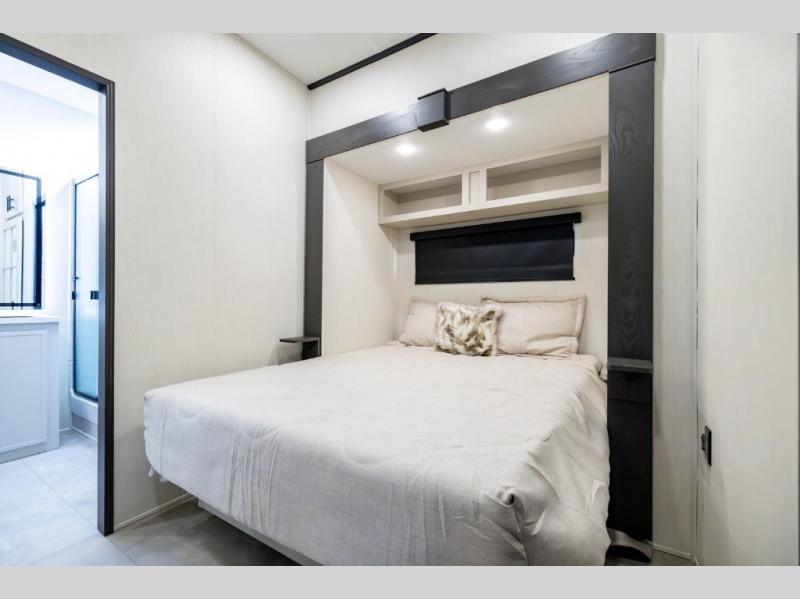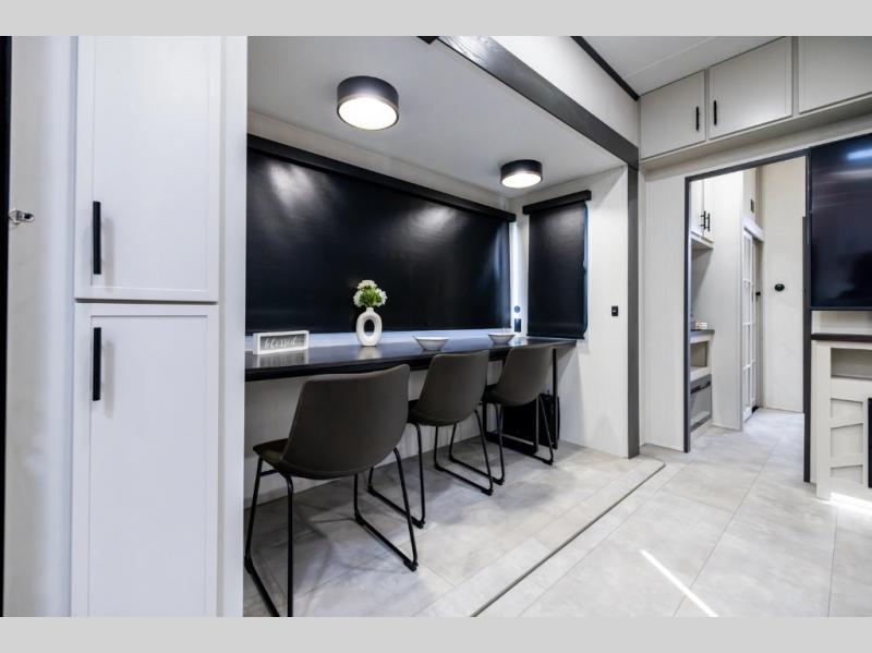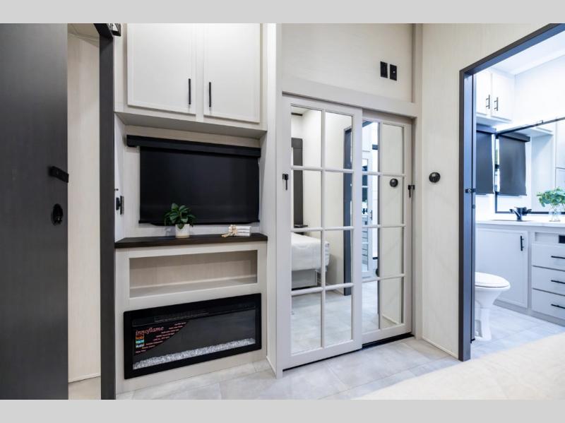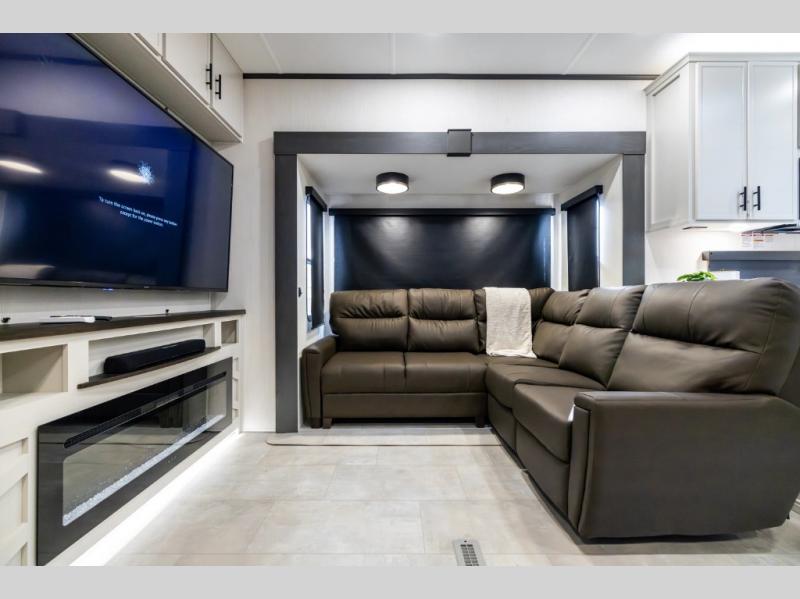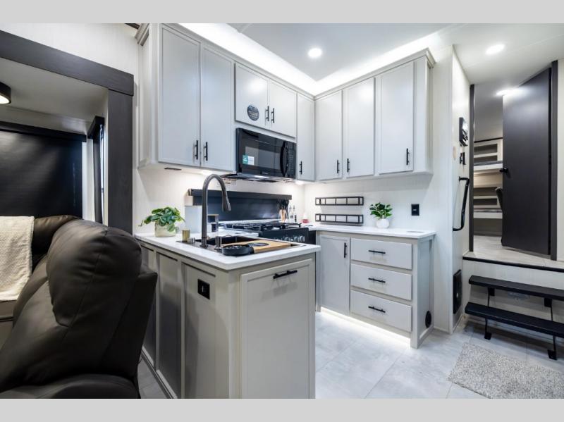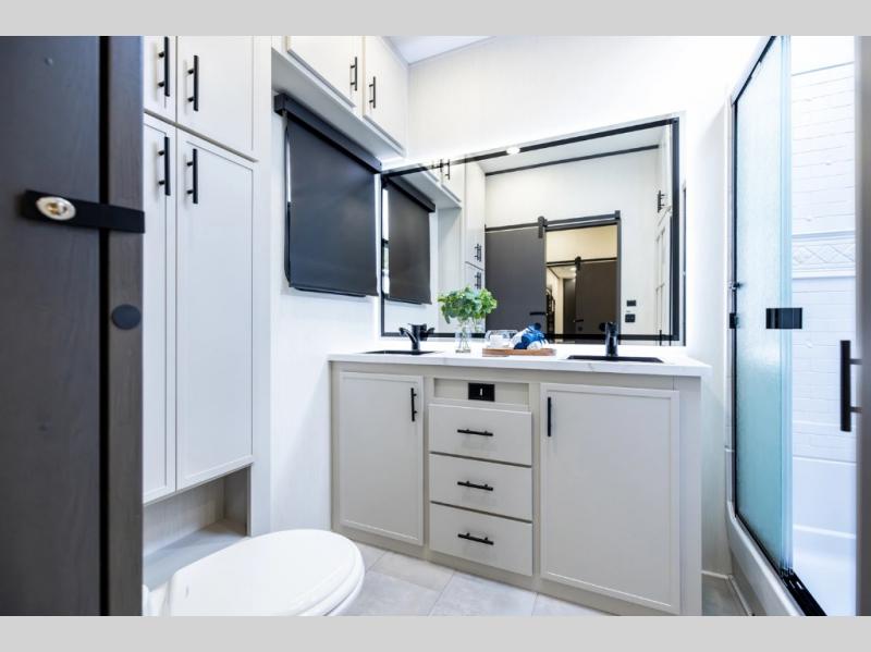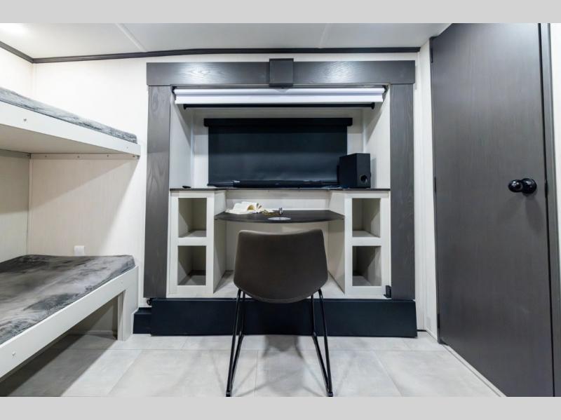 If you enjoy long trips with family and friends, this fifth wheel is sure to meet all of your needs! There is a private bedroom with a king bed slide-out for more space and comfort, plus a front wardrobe. And you will be amazed by the lovely full bathroom behind the barn door next to the bedroom with a double vanity for you and your partner! The living room is made spacious thanks to the dual opposing slides, and you'll find a sectional sleeper sofa here, as well as desk/dinette for meals and even work. And don't overlook the kitchen area with ample counter space, a four burner range, an accessory sink and a French door 12V refrigerator! If you thought it can´t get better, wait until you see the front room that will be the best place to relax and hang out, featuring a sleeper sofa, bunks above, and an entertainment center with a projector for a movie marathon.
