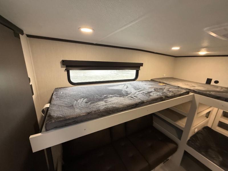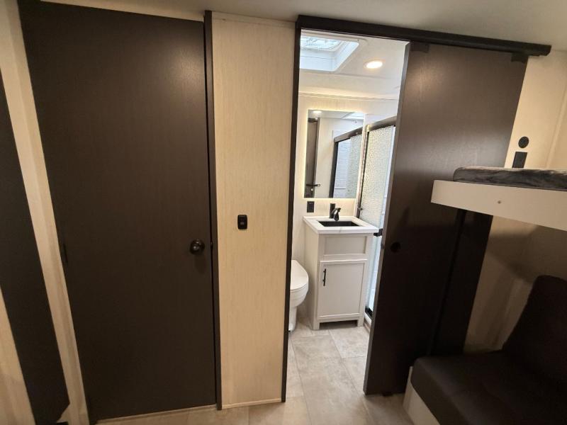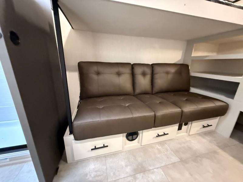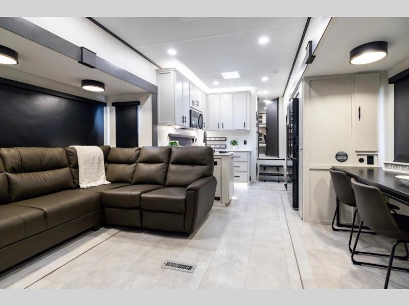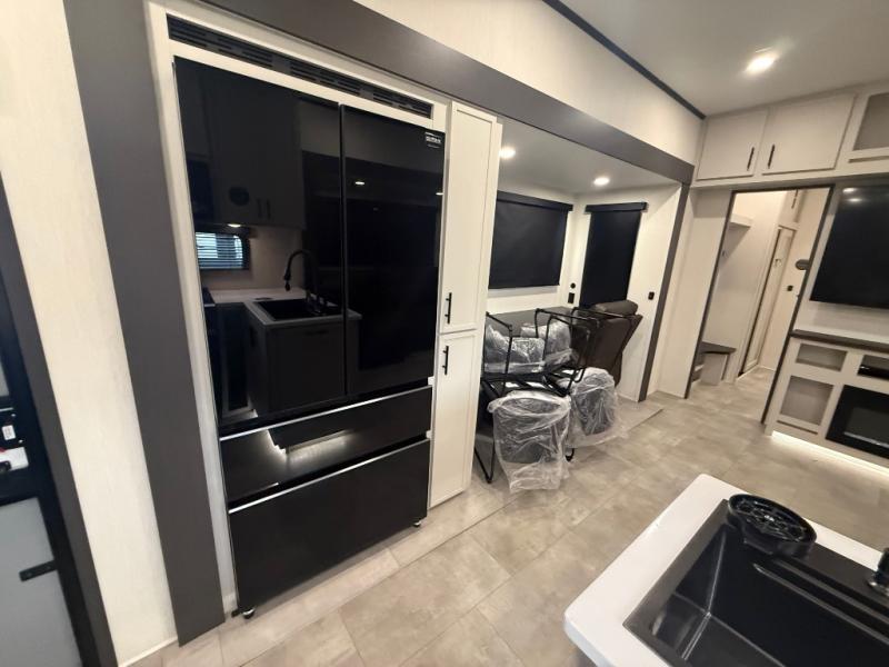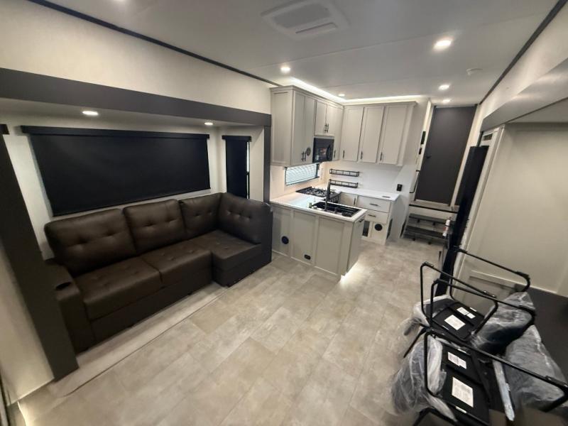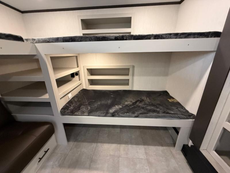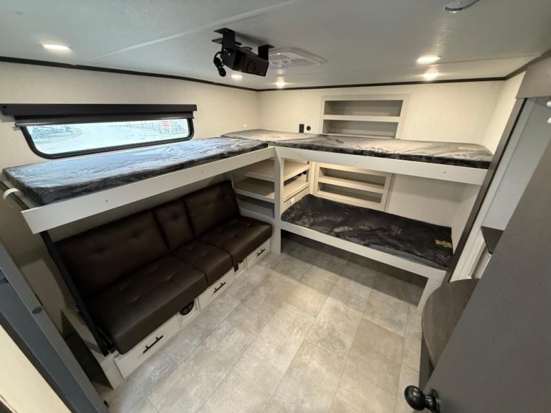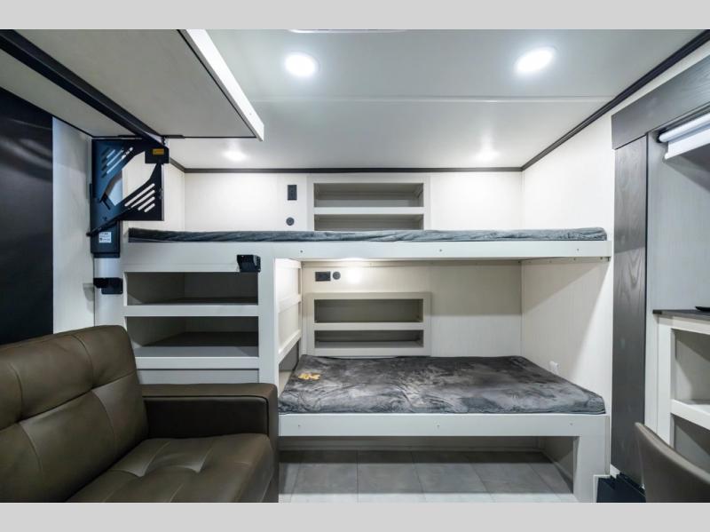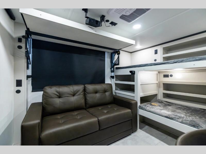 If you enjoy long trips with family and friends, this fifth wheel is sure to meet all of your needs! There is a private bedroom with a king bed slide-out for more space and comfort, plus a front wardrobe. And you will be amazed by the lovely full bathroom behind the barn door next to the bedroom with a double vanity for you and your partner! The living room is made spacious thanks to the dual opposing slides, and you'll find a sectional sleeper sofa here, as well as desk/dinette for meals and even work. And don't overlook the kitchen area with ample counter space, a four burner range, an accessory sink and a French door 12V refrigerator! If you thought it can´t get better, wait until you see the front room that will be the best place to relax and hang out, featuring a sleeper sofa, bunks above, and an entertainment center with a projector for a movie marathon.