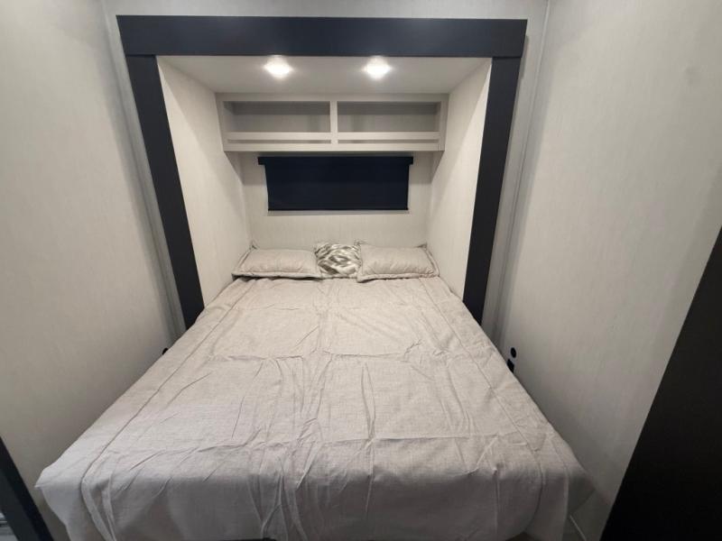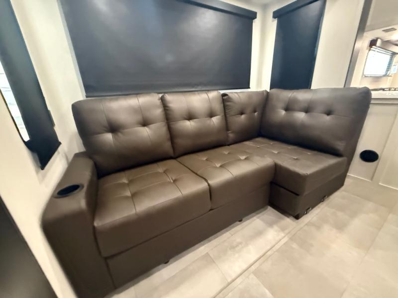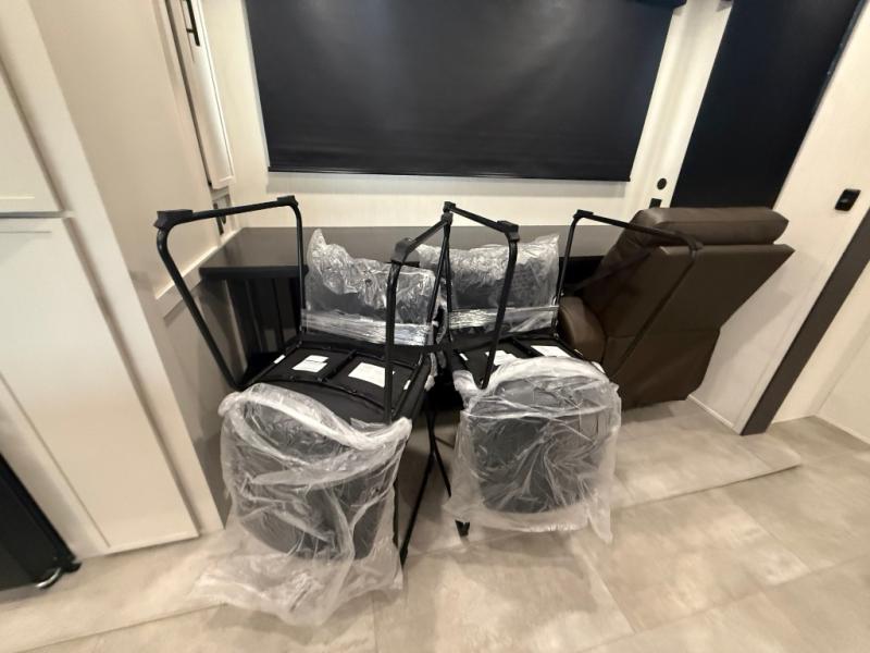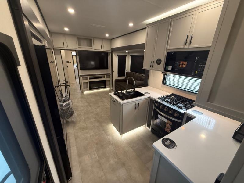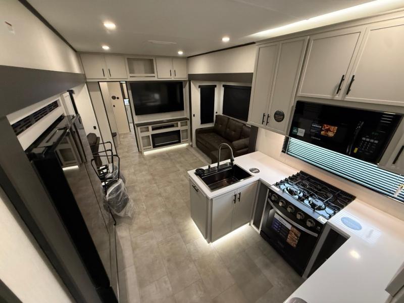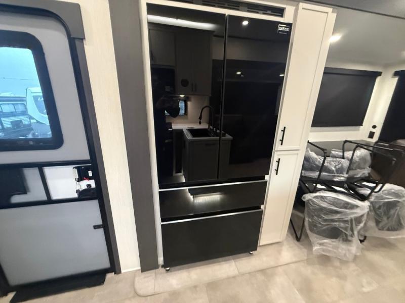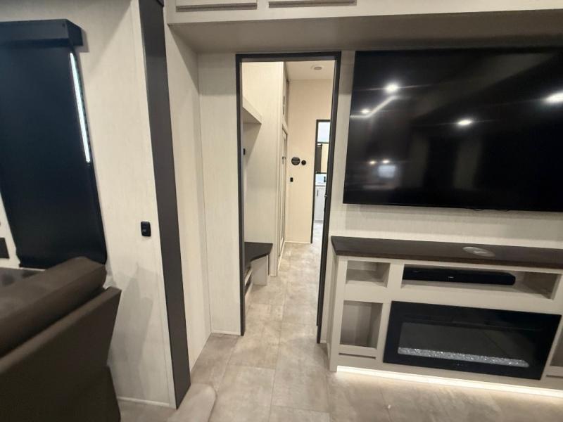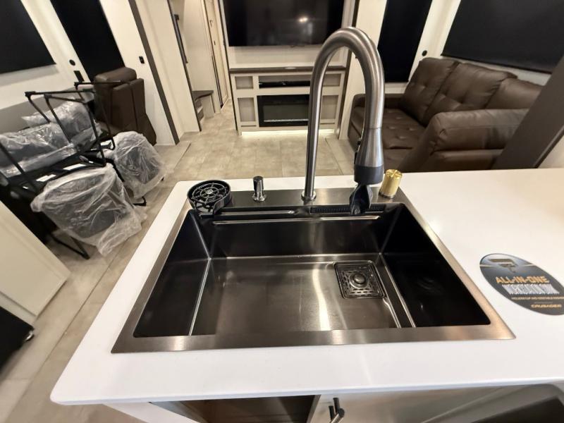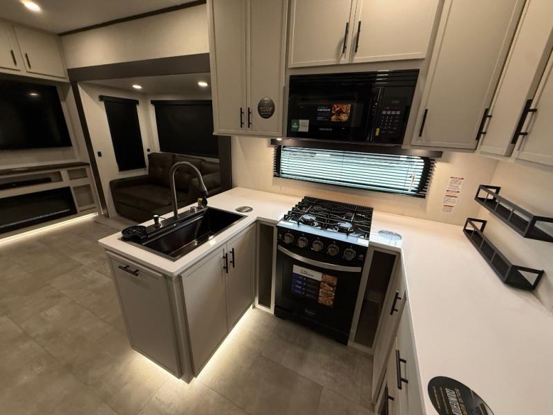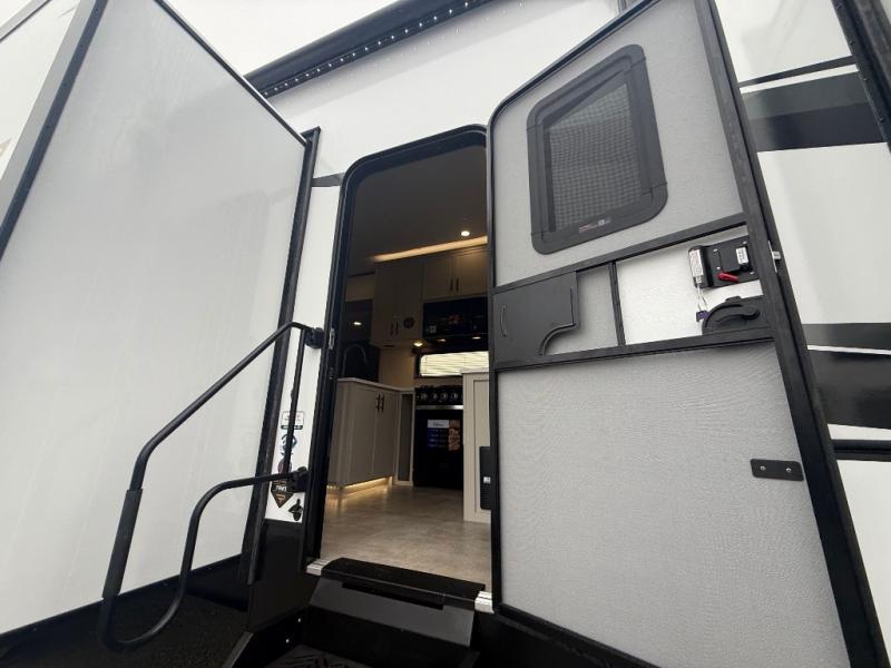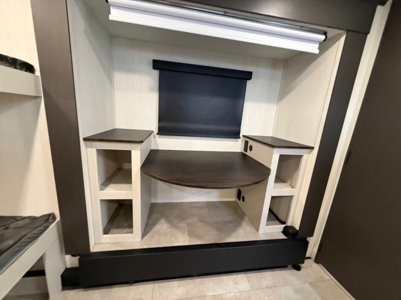 If you enjoy long trips with family and friends, this fifth wheel is sure to meet all of your needs! There is a private bedroom with a king bed slide-out for more space and comfort, plus a front wardrobe. And you will be amazed by the lovely full bathroom behind the barn door next to the bedroom with a double vanity for you and your partner! The living room is made spacious thanks to the dual opposing slides, and you'll find a sectional sleeper sofa here, as well as desk/dinette for meals and even work. And don't overlook the kitchen area with ample counter space, a four burner range, an accessory sink and a French door 12V refrigerator! If you thought it can´t get better, wait until you see the front room that will be the best place to relax and hang out, featuring a sleeper sofa, bunks above, and an entertainment center with a projector for a movie marathon.