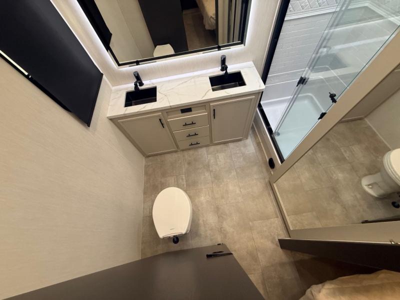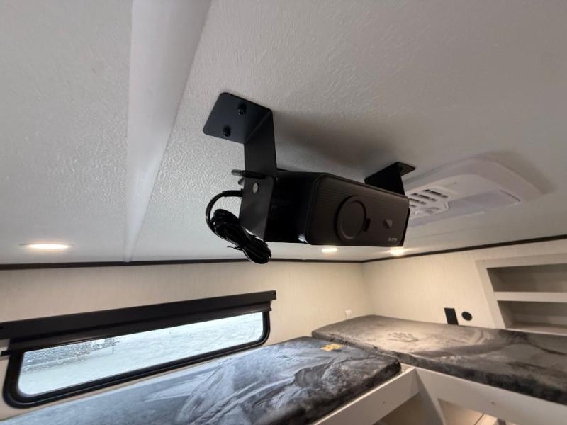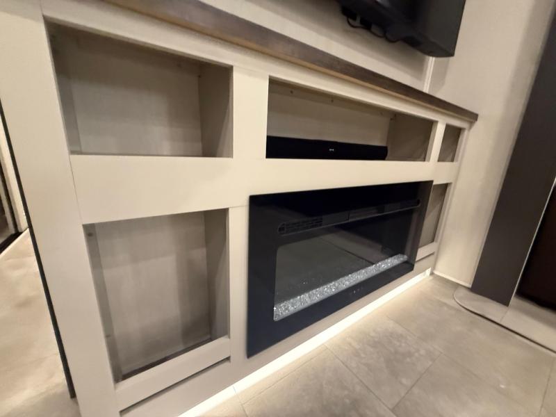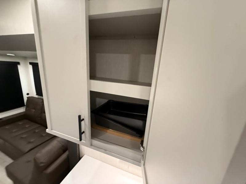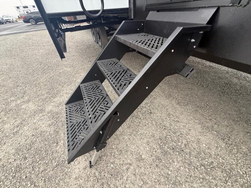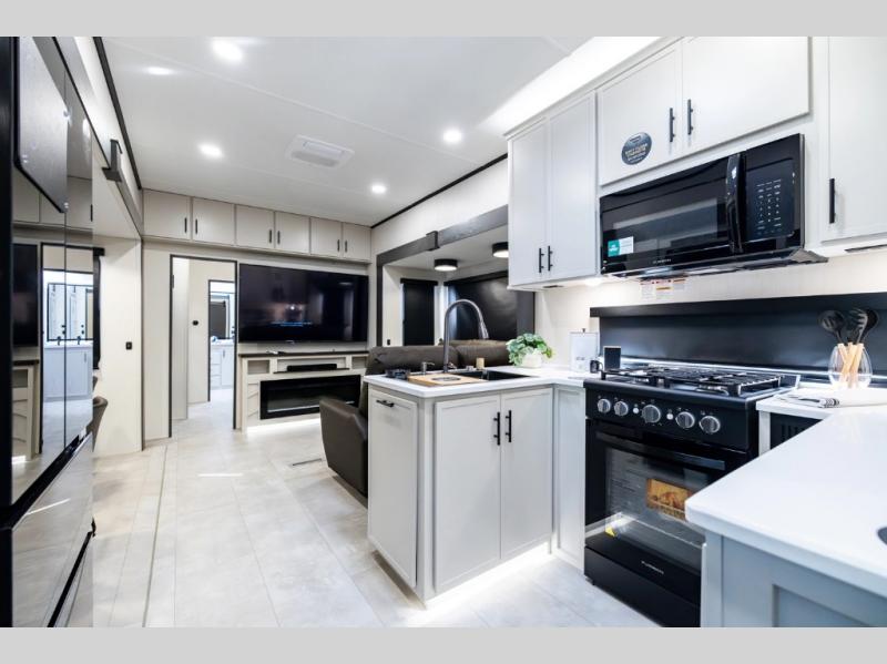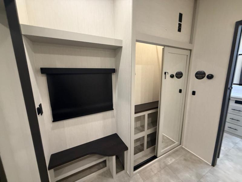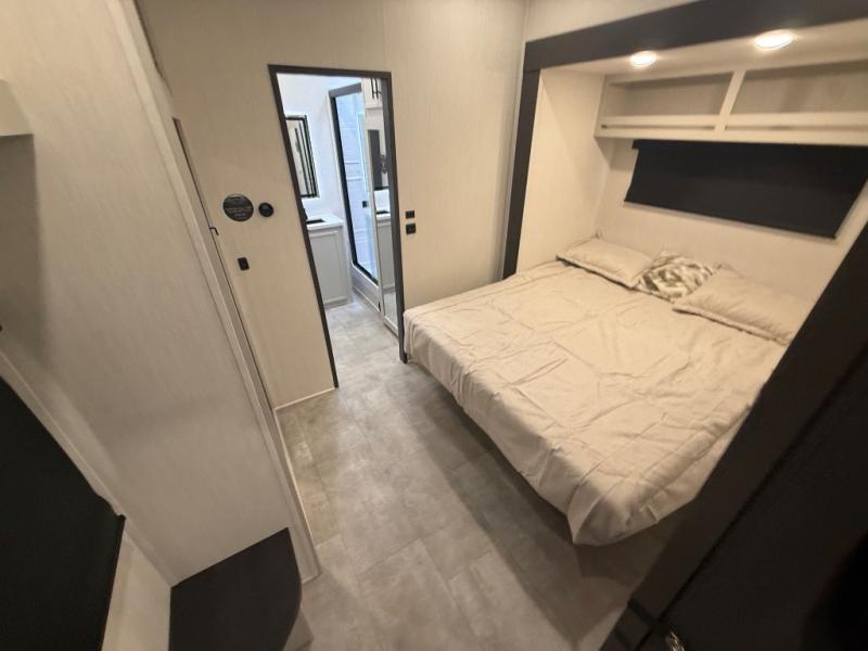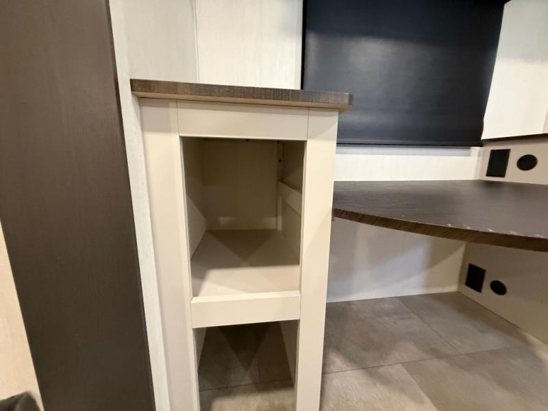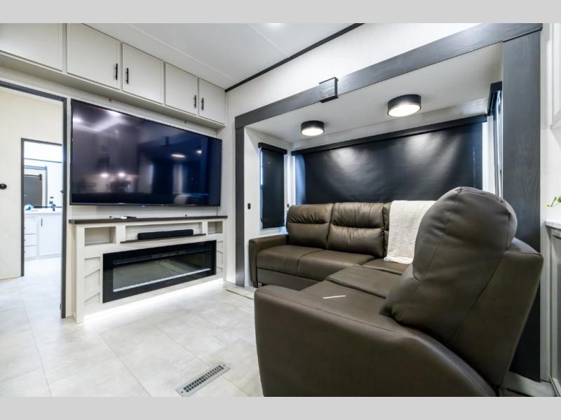 If you enjoy long trips with family and friends, this fifth wheel is sure to meet all of your needs! There is a private bedroom with a king bed slide-out for more space and comfort, plus a front wardrobe. And you will be amazed by the lovely full bathroom behind the barn door next to the bedroom with a double vanity for you and your partner! The living room is made spacious thanks to the dual opposing slides, and you'll find a sectional sleeper sofa here, as well as desk/dinette for meals and even work. And don't overlook the kitchen area with ample counter space, a four burner range, an accessory sink and a French door 12V refrigerator! If you thought it can´t get better, wait until you see the front room that will be the best place to relax and hang out, featuring a sleeper sofa, bunks above, and an entertainment center with a projector for a movie marathon.