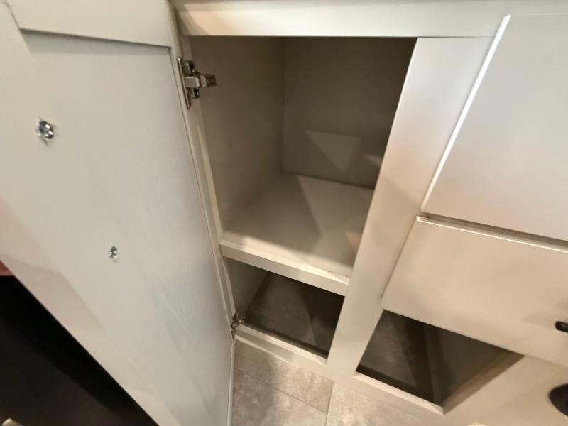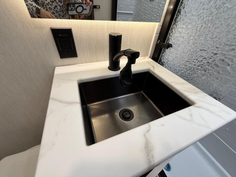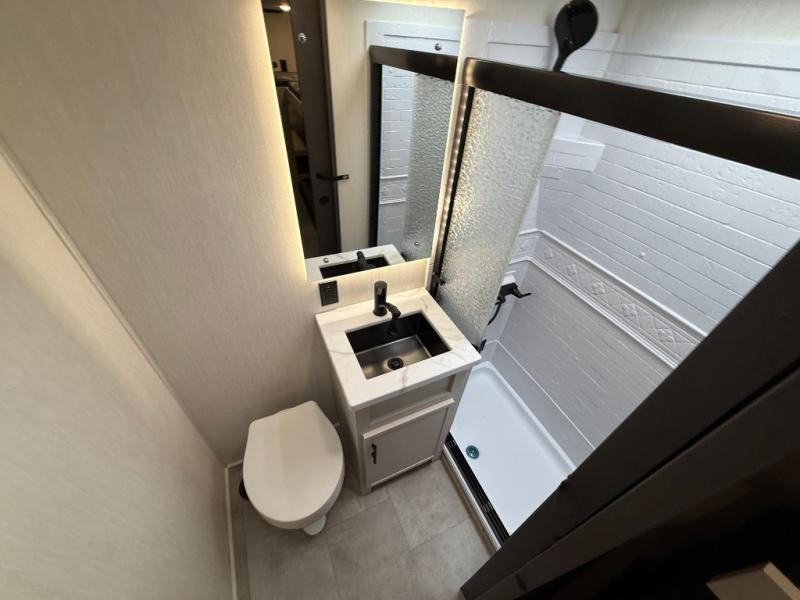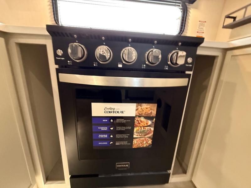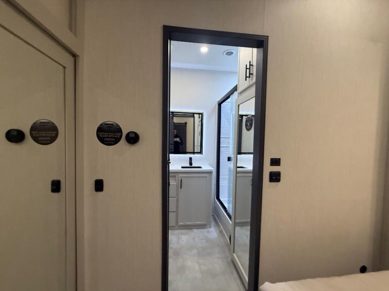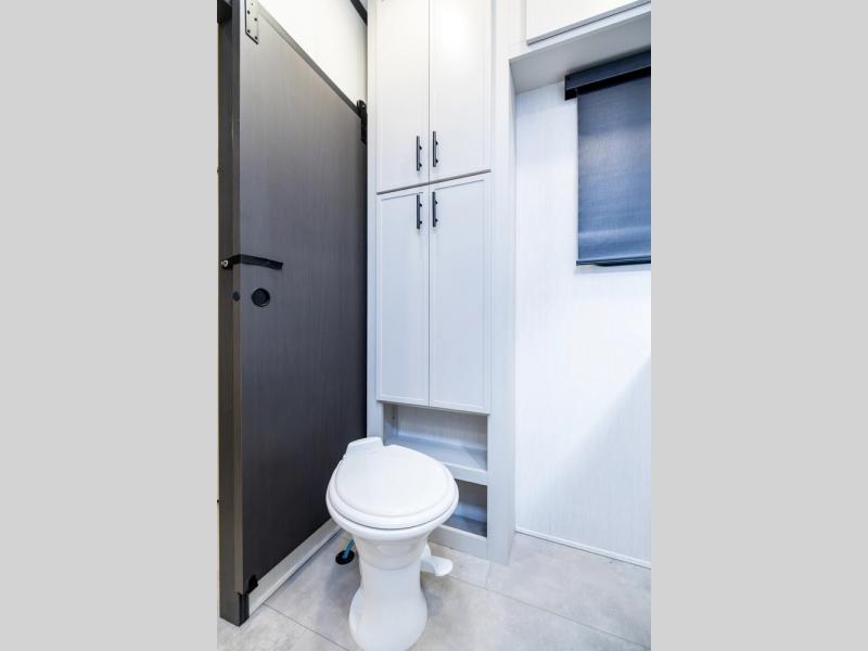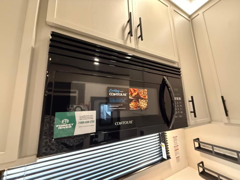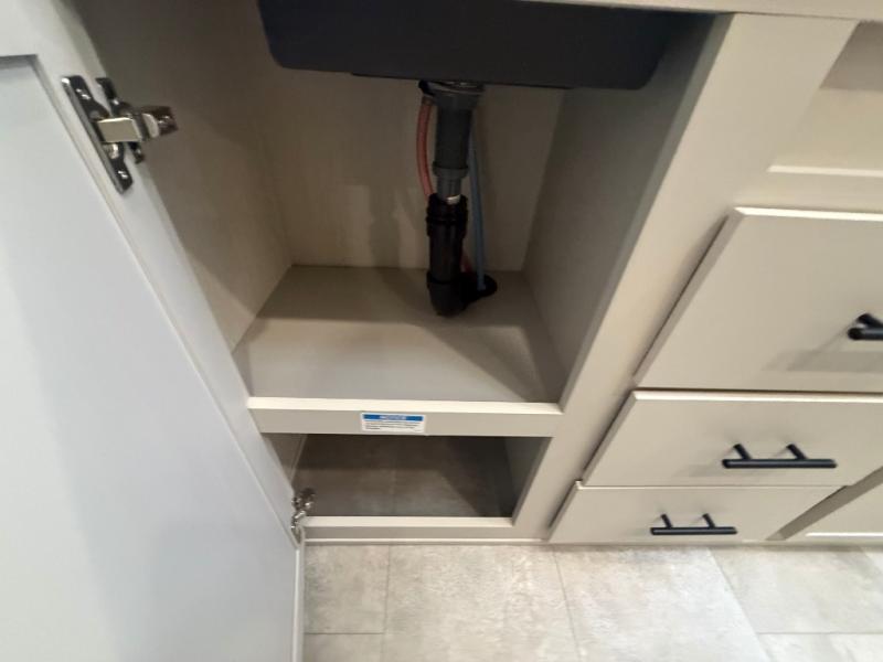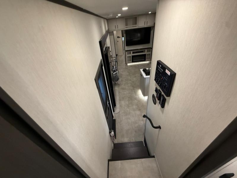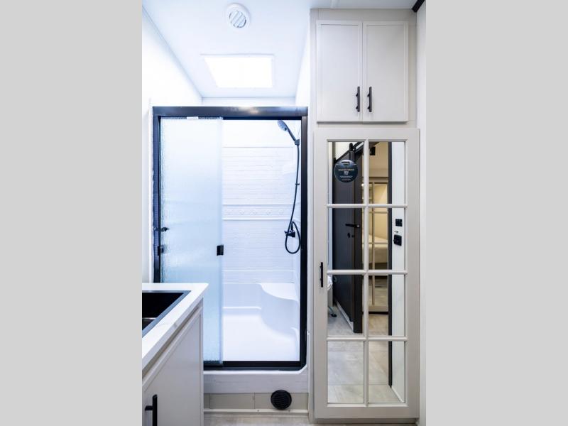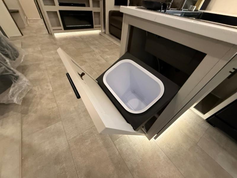 If you enjoy long trips with family and friends, this fifth wheel is sure to meet all of your needs! There is a private bedroom with a king bed slide-out for more space and comfort, plus a front wardrobe. And you will be amazed by the lovely full bathroom behind the barn door next to the bedroom with a double vanity for you and your partner! The living room is made spacious thanks to the dual opposing slides, and you'll find a sectional sleeper sofa here, as well as desk/dinette for meals and even work. And don't overlook the kitchen area with ample counter space, a four burner range, an accessory sink and a French door 12V refrigerator! If you thought it can´t get better, wait until you see the front room that will be the best place to relax and hang out, featuring a sleeper sofa, bunks above, and an entertainment center with a projector for a movie marathon.