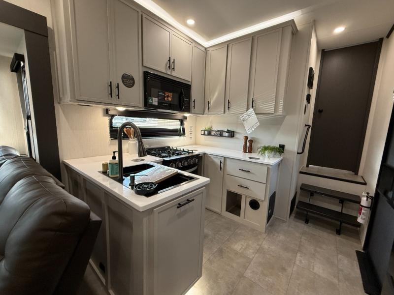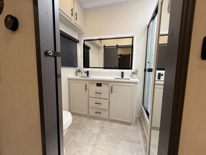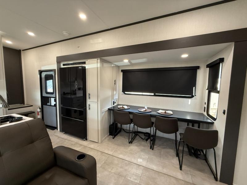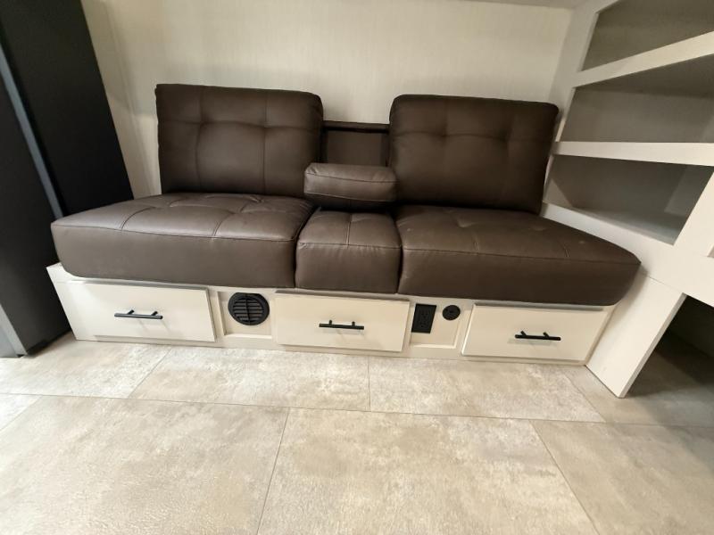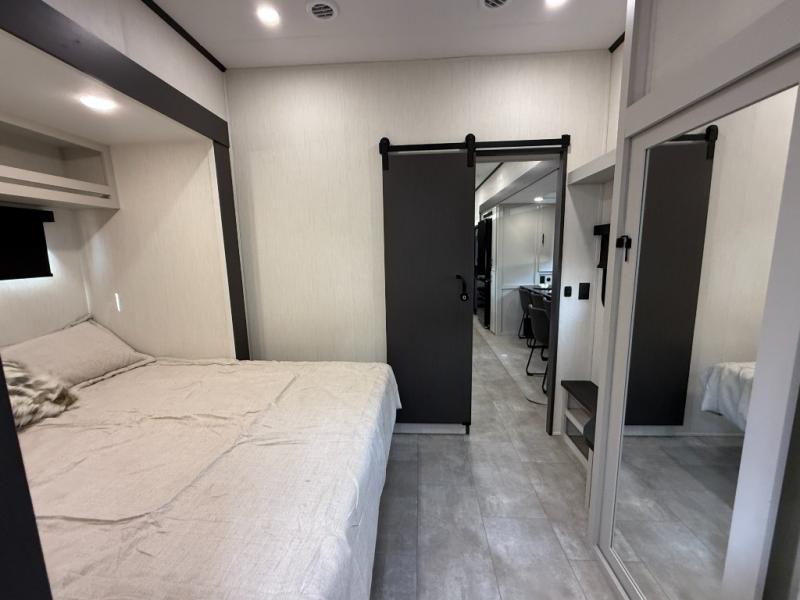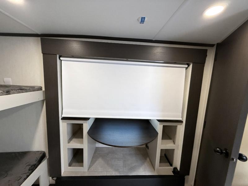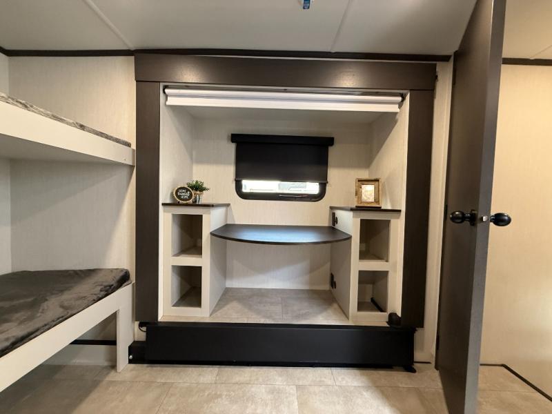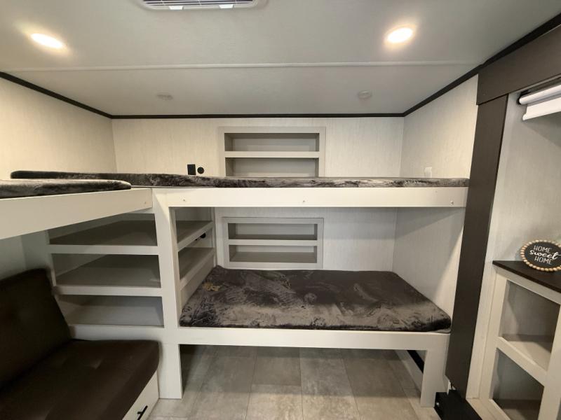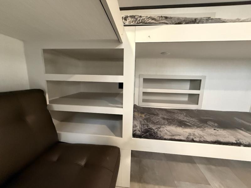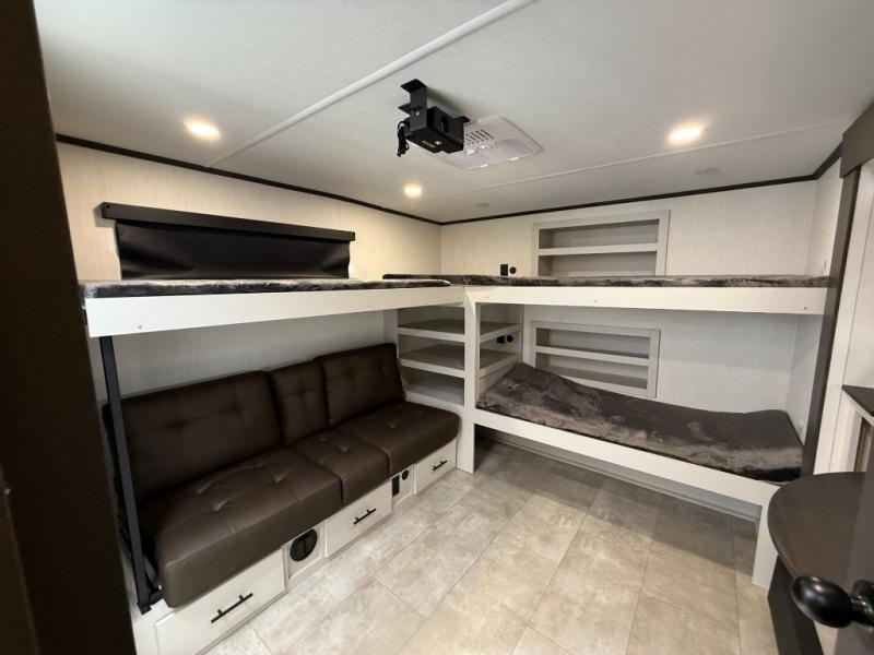 If you enjoy long trips with family and friends, this fifth wheel is sure to meet all of your needs! There is a private bedroom with a king bed slide-out for more space and comfort, plus a front wardrobe. And you will be amazed by the lovely full bathroom behind the barn door next to the bedroom with a double vanity for you and your partner! The living room is made spacious thanks to the dual opposing slides, and you'll find a sectional sleeper sofa here, as well as desk/dinette for meals and even work. And don't overlook the kitchen area with ample counter space, a four burner range, an accessory sink and a French door 12V refrigerator! If you thought it can´t get better, wait until you see the front room that will be the best place to relax and hang out, featuring a sleeper sofa, bunks above, and an entertainment center with a projector for a movie marathon.