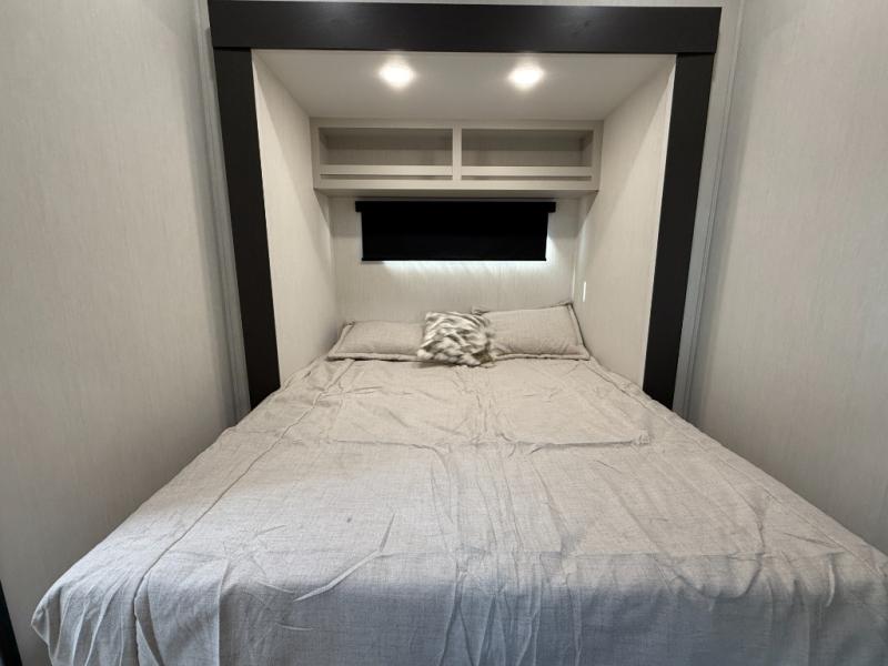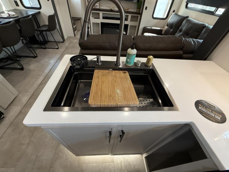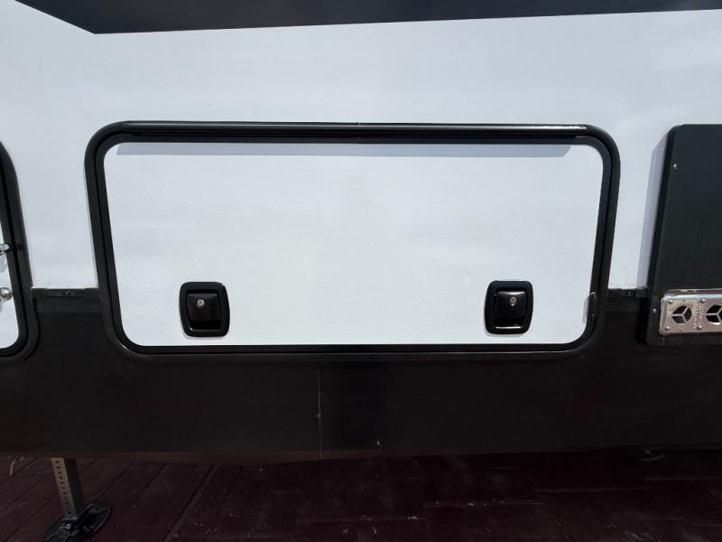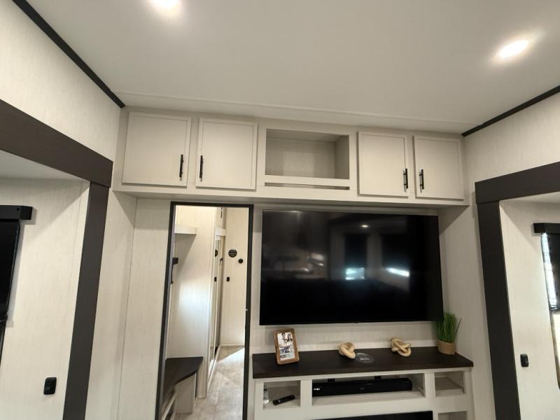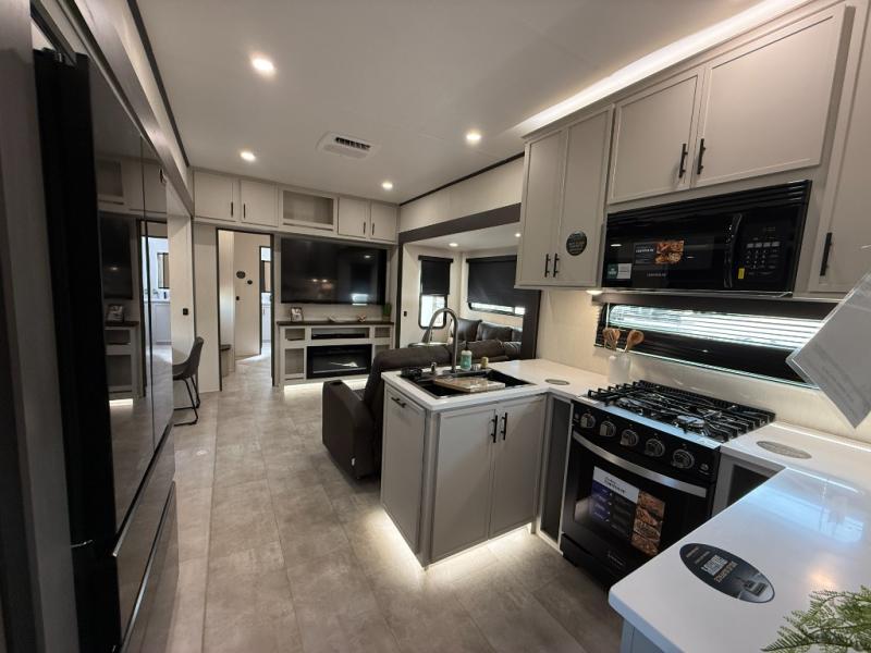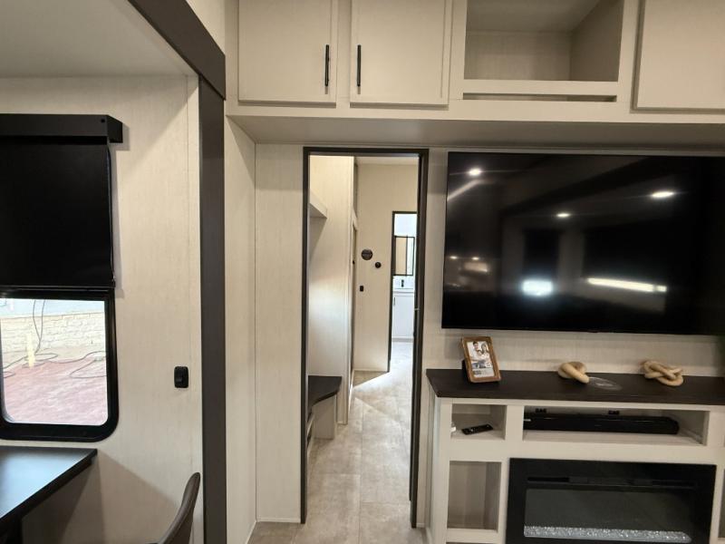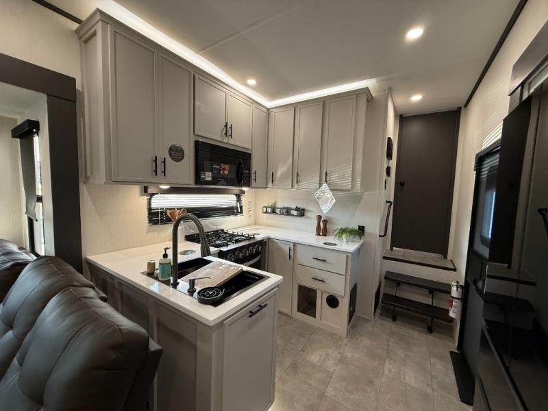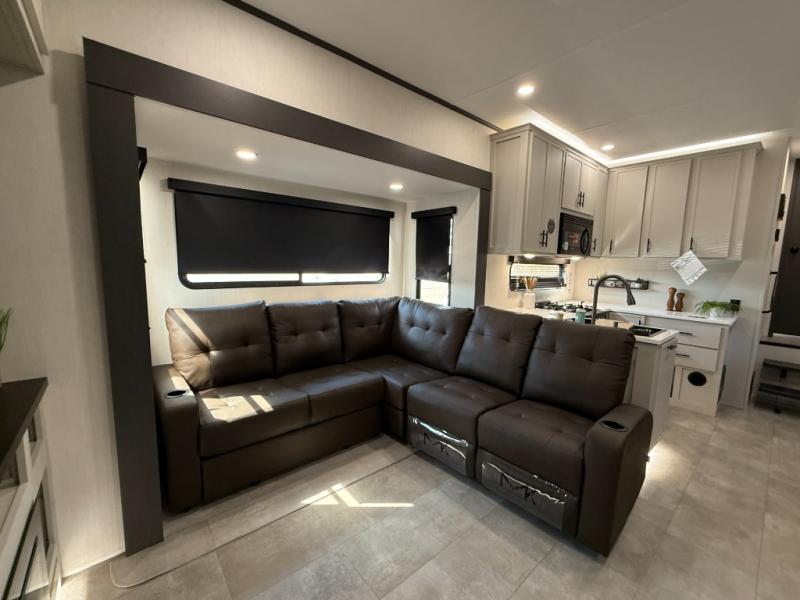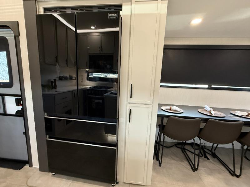 If you enjoy long trips with family and friends, this fifth wheel is sure to meet all of your needs! There is a private bedroom with a king bed slide-out for more space and comfort, plus a front wardrobe. And you will be amazed by the lovely full bathroom behind the barn door next to the bedroom with a double vanity for you and your partner! The living room is made spacious thanks to the dual opposing slides, and you'll find a sectional sleeper sofa here, as well as desk/dinette for meals and even work. And don't overlook the kitchen area with ample counter space, a four burner range, an accessory sink and a French door 12V refrigerator! If you thought it can´t get better, wait until you see the front room that will be the best place to relax and hang out, featuring a sleeper sofa, bunks above, and an entertainment center with a projector for a movie marathon.