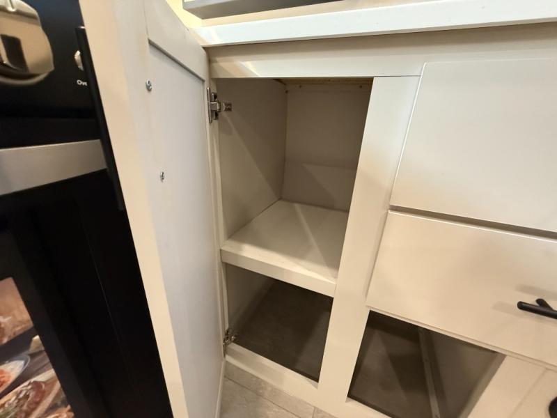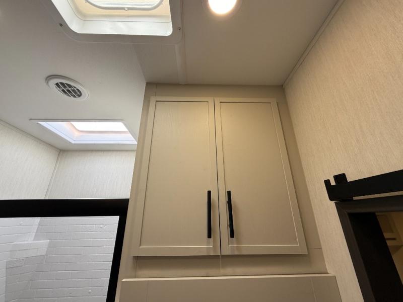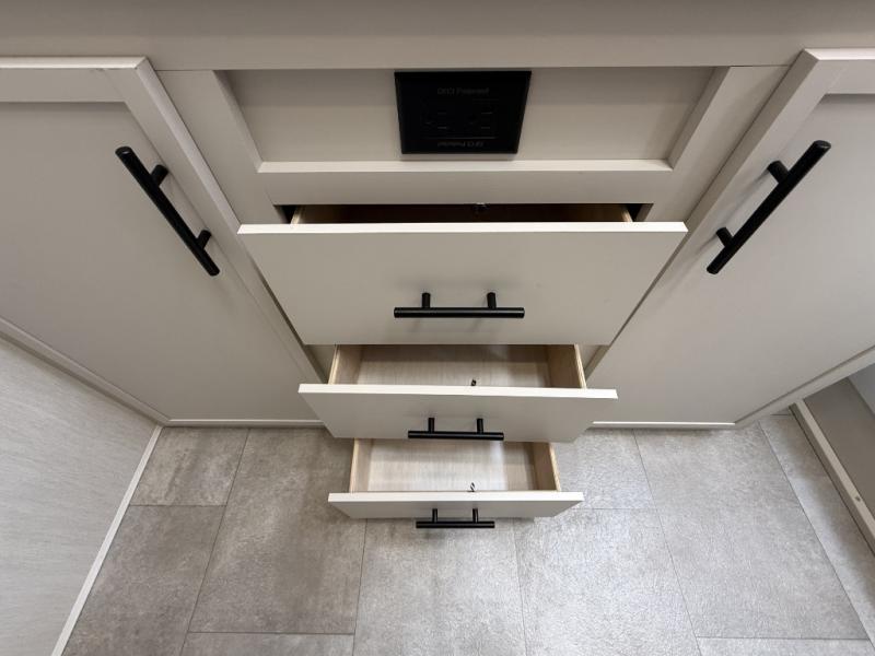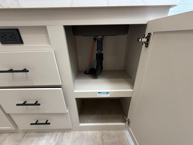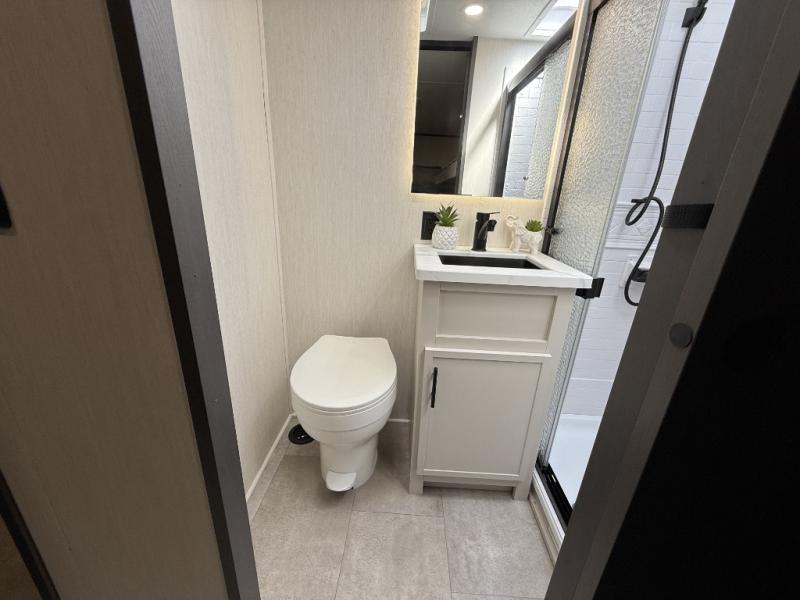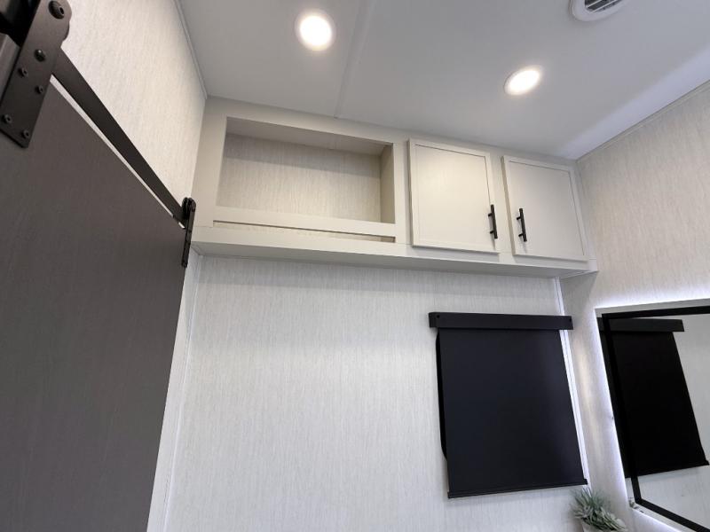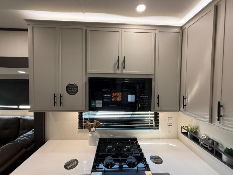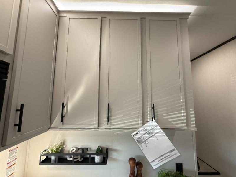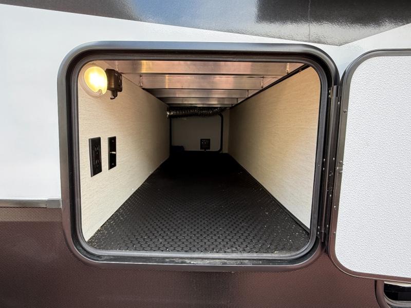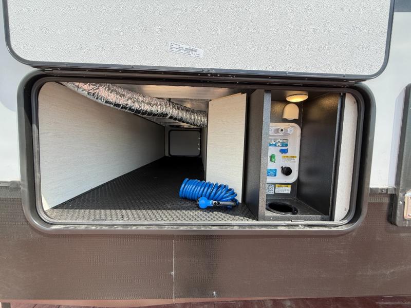 If you enjoy long trips with family and friends, this fifth wheel is sure to meet all of your needs! There is a private bedroom with a king bed slide-out for more space and comfort, plus a front wardrobe. And you will be amazed by the lovely full bathroom behind the barn door next to the bedroom with a double vanity for you and your partner! The living room is made spacious thanks to the dual opposing slides, and you'll find a sectional sleeper sofa here, as well as desk/dinette for meals and even work. And don't overlook the kitchen area with ample counter space, a four burner range, an accessory sink and a French door 12V refrigerator! If you thought it can´t get better, wait until you see the front room that will be the best place to relax and hang out, featuring a sleeper sofa, bunks above, and an entertainment center with a projector for a movie marathon.