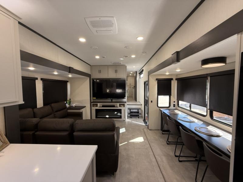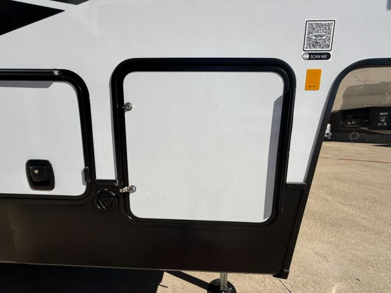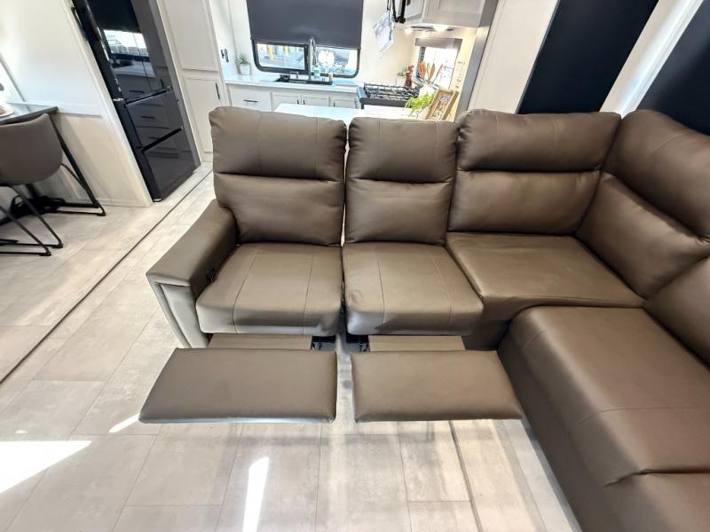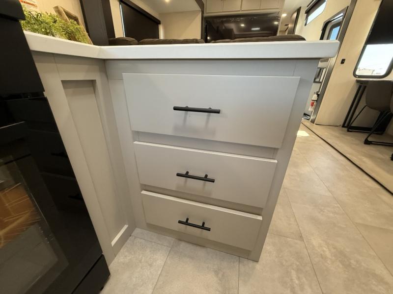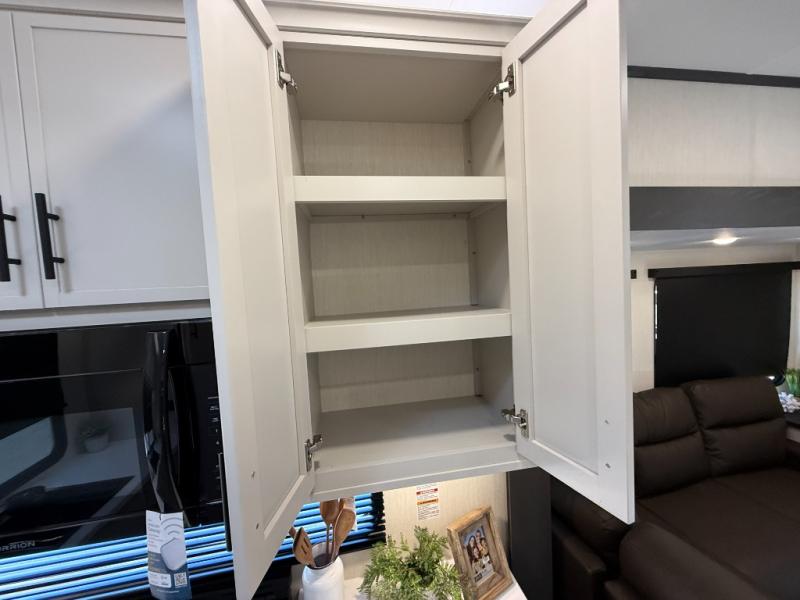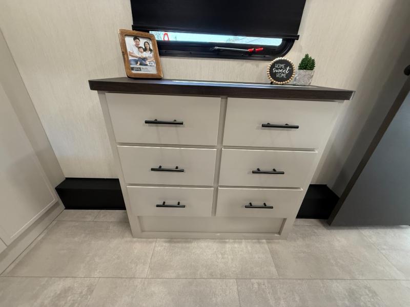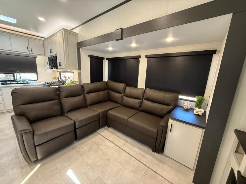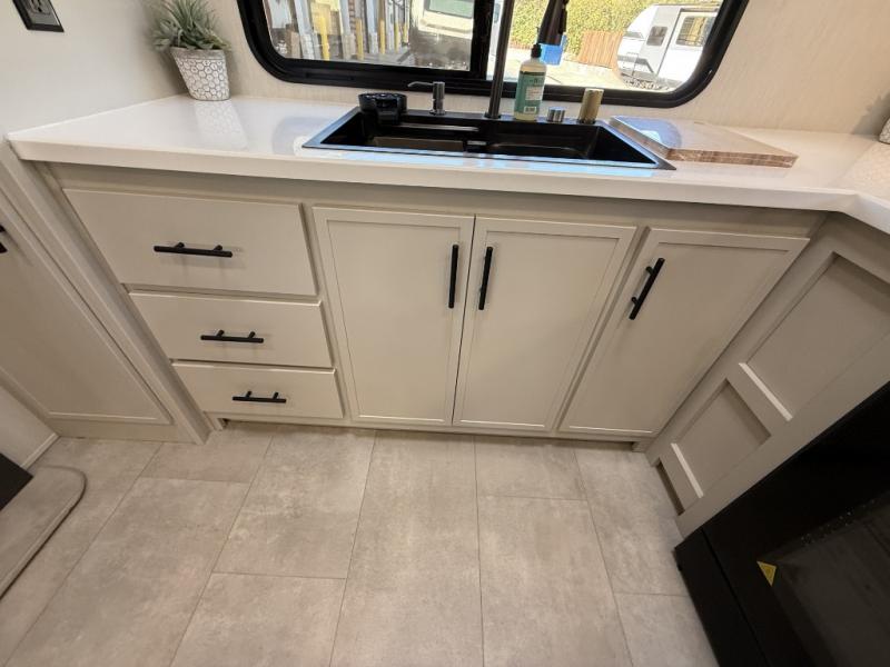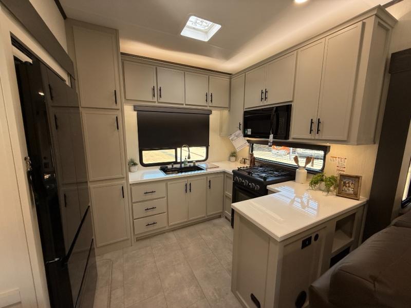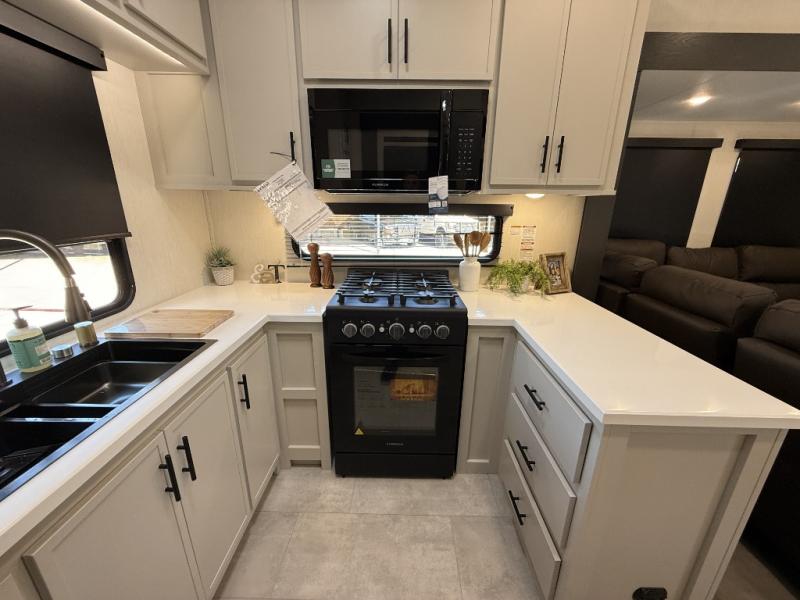If you enjoy camping with family or friends, this fifth wheel is sure to meet all of your needs! The front bedroom includes a King bed slide out for more space and comfort, plus a front wardrobe/washer and dryer prep. And the full bath is right next door for easy nighttime use. The living room is made spacious thanks to the dual opposing slides, and you'll find a sectional sleeper sofa here, as well as a hybrid desk/dinette, perfect for a quick meal and to catch up with some emails. And don't overlook the rear kitchen with ample counter space, a four burner range, an accessory sink and a French door 12V refrigerator!
