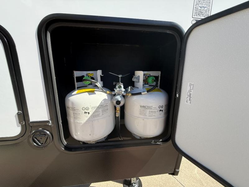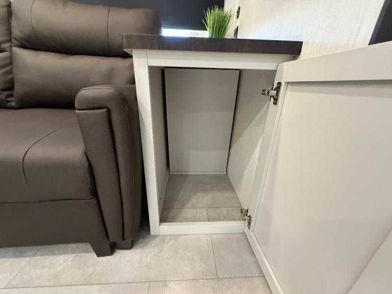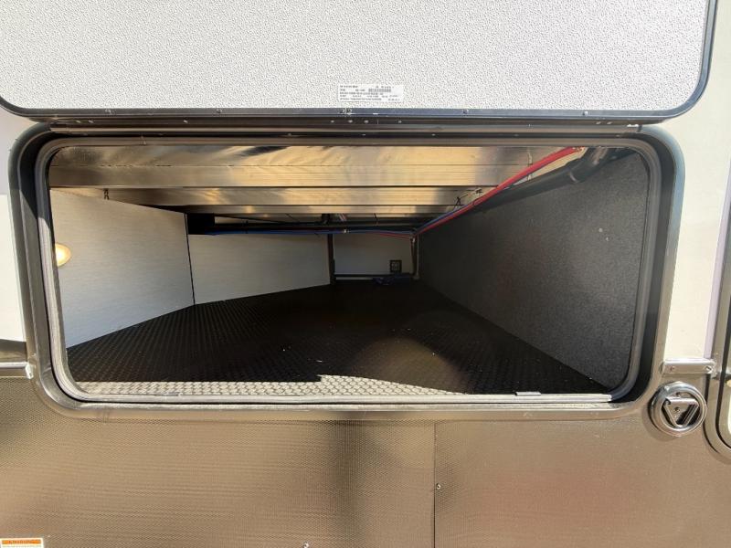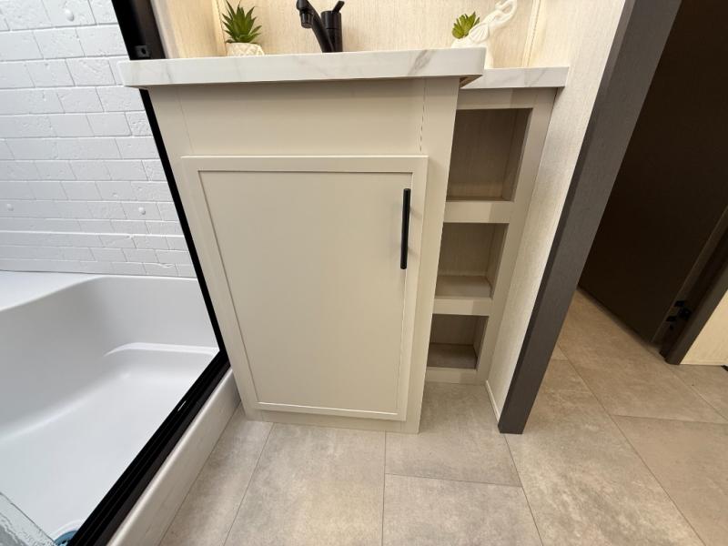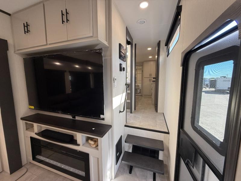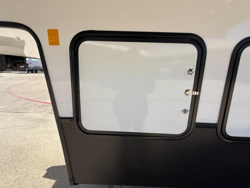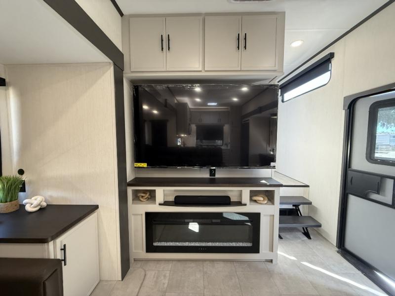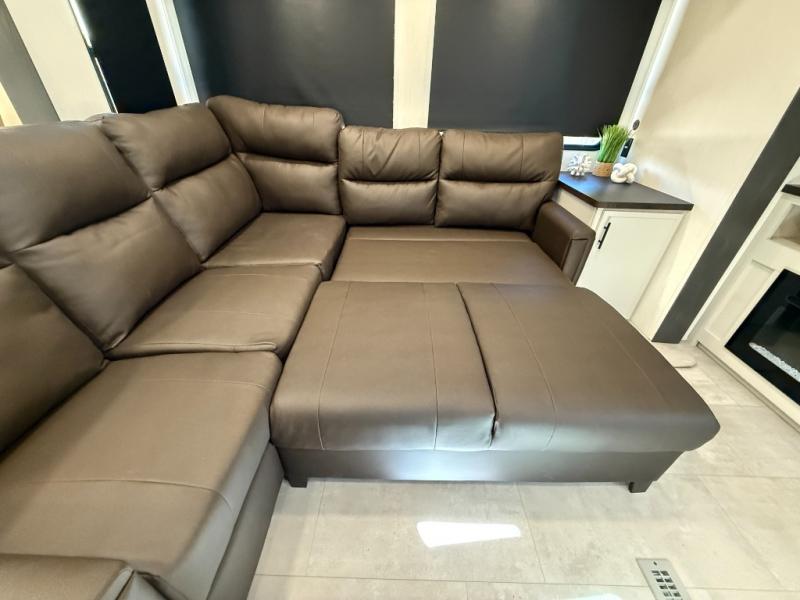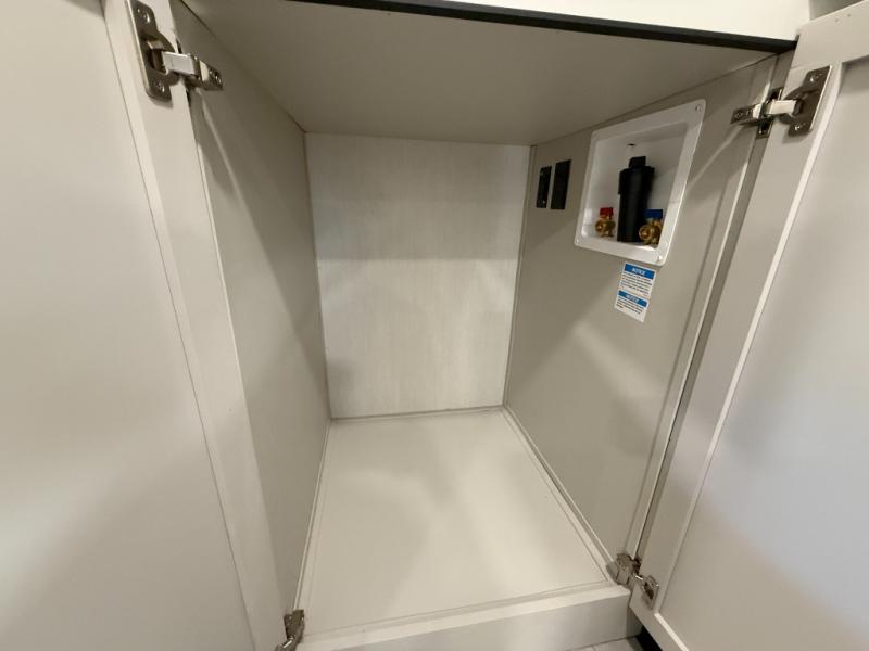If you enjoy camping with family or friends, this fifth wheel is sure to meet all of your needs! The front bedroom includes a King bed slide out for more space and comfort, plus a front wardrobe/washer and dryer prep. And the full bath is right next door for easy nighttime use. The living room is made spacious thanks to the dual opposing slides, and you'll find a sectional sleeper sofa here, as well as a hybrid desk/dinette, perfect for a quick meal and to catch up with some emails. And don't overlook the rear kitchen with ample counter space, a four burner range, an accessory sink and a French door 12V refrigerator!