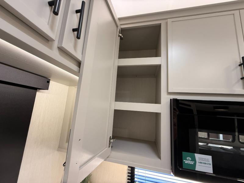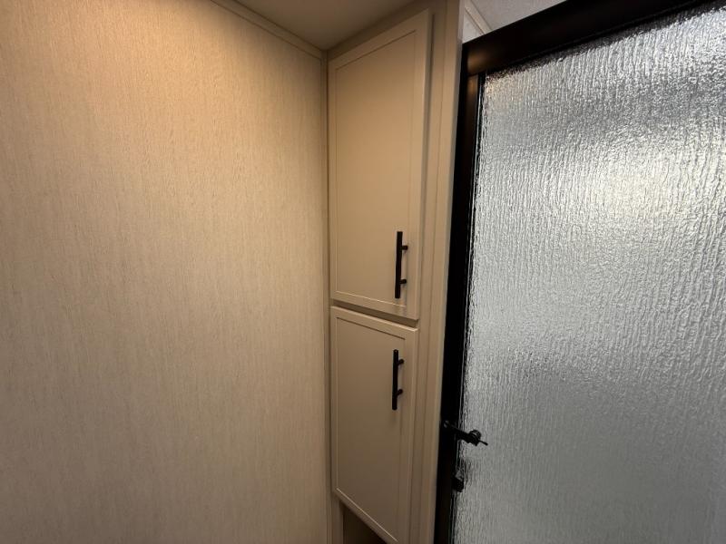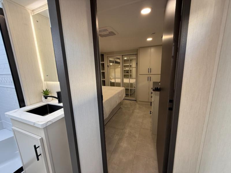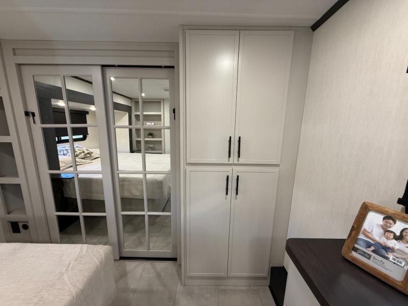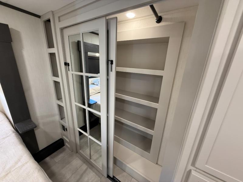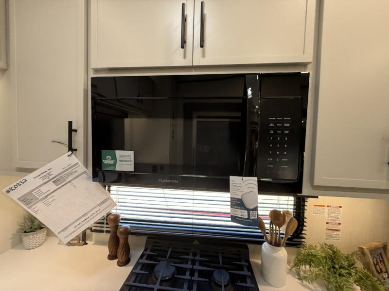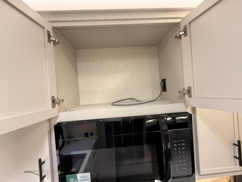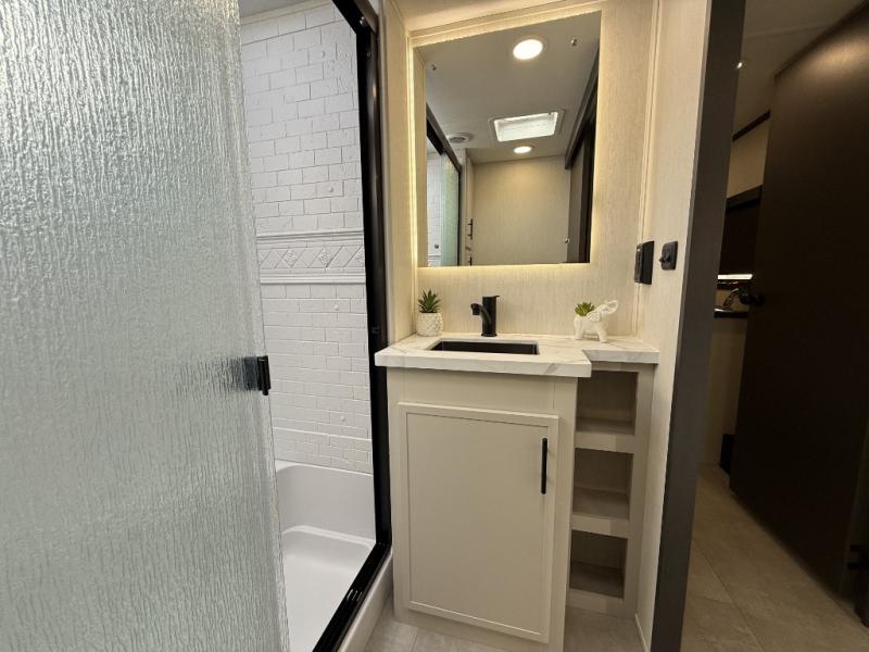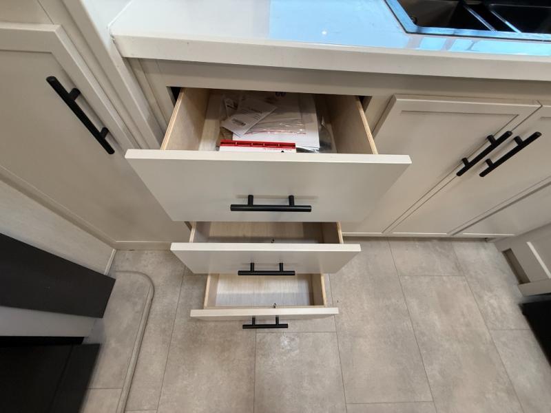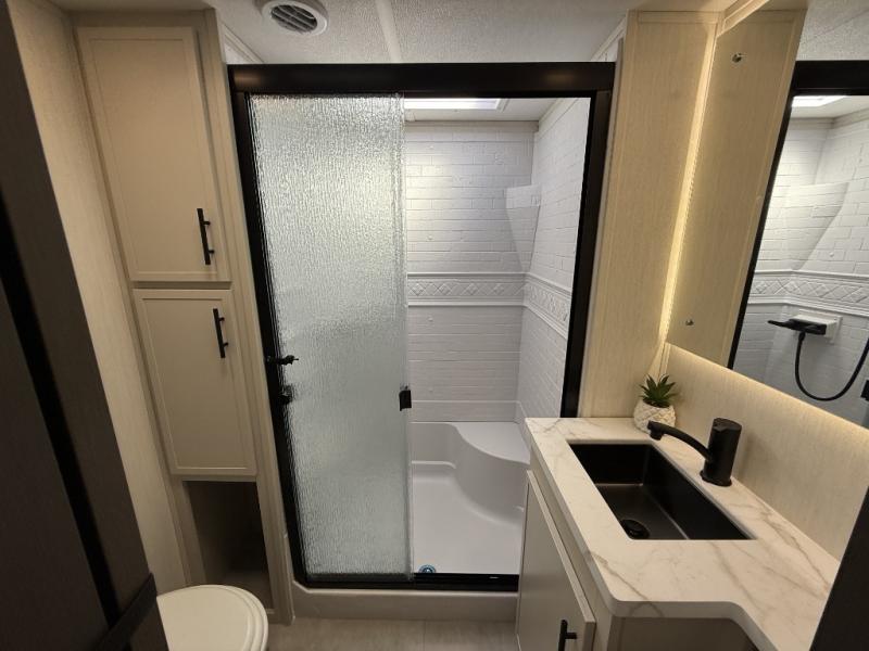 If you enjoy camping with family or friends, this fifth wheel is sure to meet all of your needs! The front bedroom includes a King bed slide out for more space and comfort, plus a front wardrobe/washer and dryer prep. And the full bath is right next door for easy nighttime use. The living room is made spacious thanks to the dual opposing slides, and you'll find a sectional sleeper sofa here, as well as a hybrid desk/dinette, perfect for a quick meal and to catch up with some emails. And don't overlook the rear kitchen with ample counter space, a four burner range, an accessory sink and a French door 12V refrigerator!