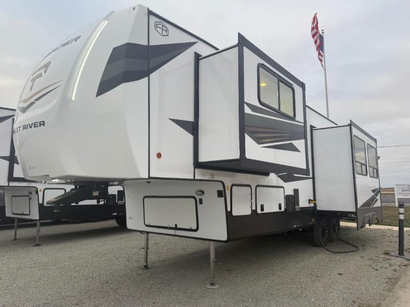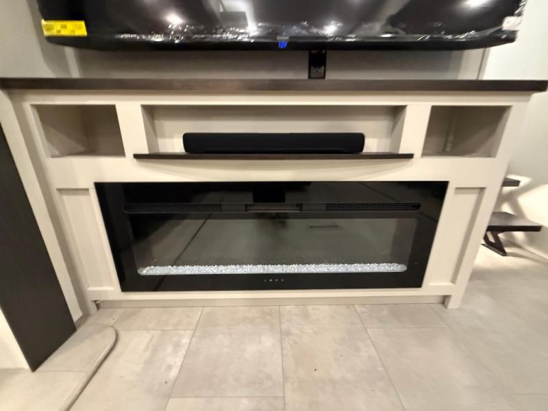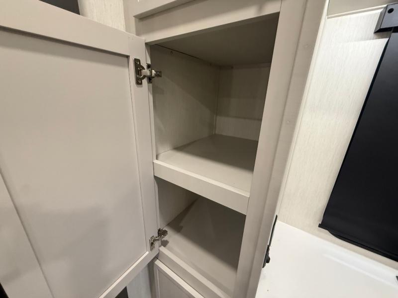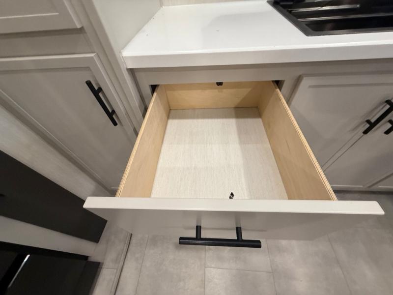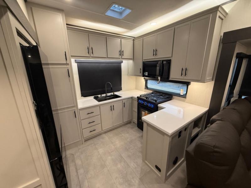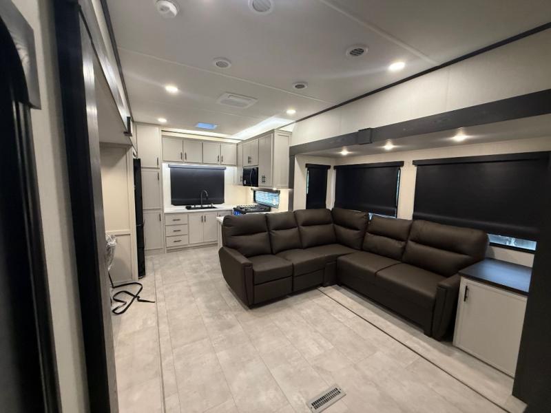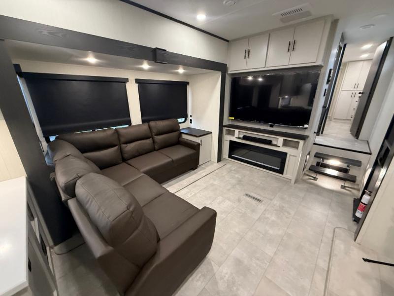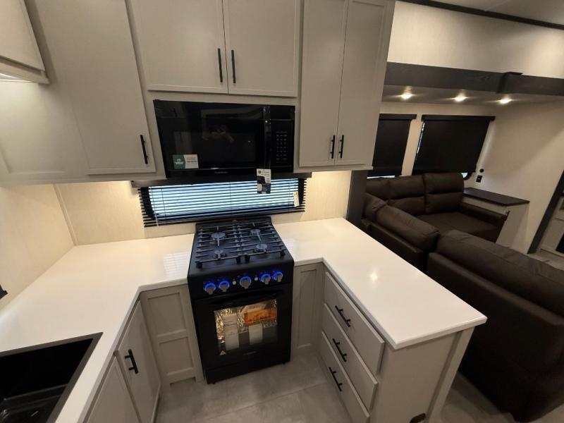 If you enjoy camping with family or friends, this fifth wheel is sure to meet all of your needs! The front bedroom includes a King bed slide out for more space and comfort, plus a front wardrobe/washer and dryer prep. And the full bath is right next door for easy nighttime use. The living room is made spacious thanks to the dual opposing slides, and you'll find a sectional sleeper sofa here, as well as a hybrid desk/dinette, perfect for a quick meal and to catch up with some emails. And don't overlook the rear kitchen with ample counter space, a four burner range, an accessory sink and a French door 12V refrigerator!