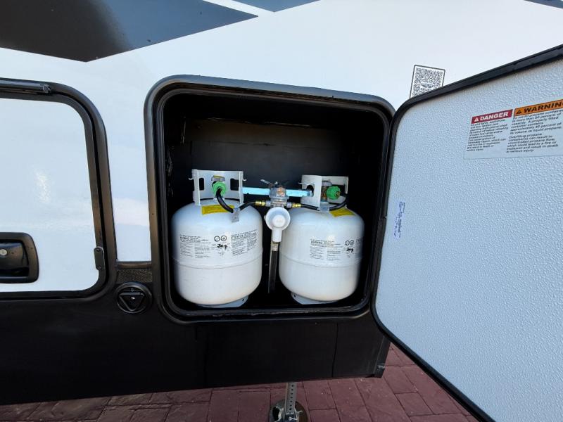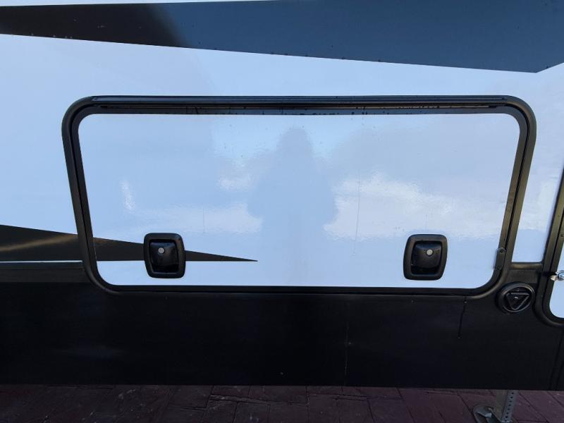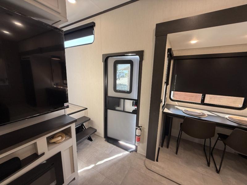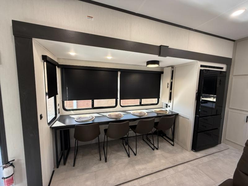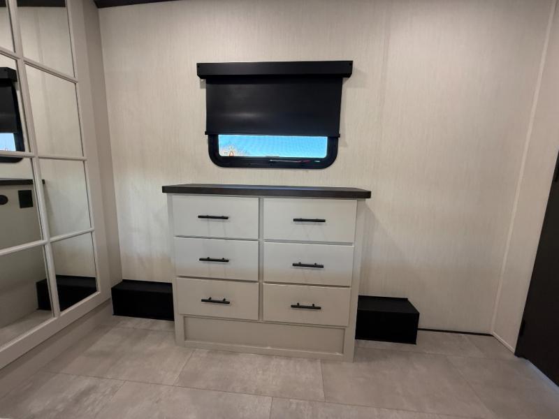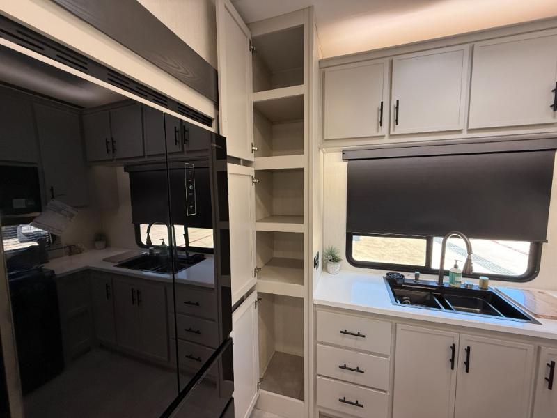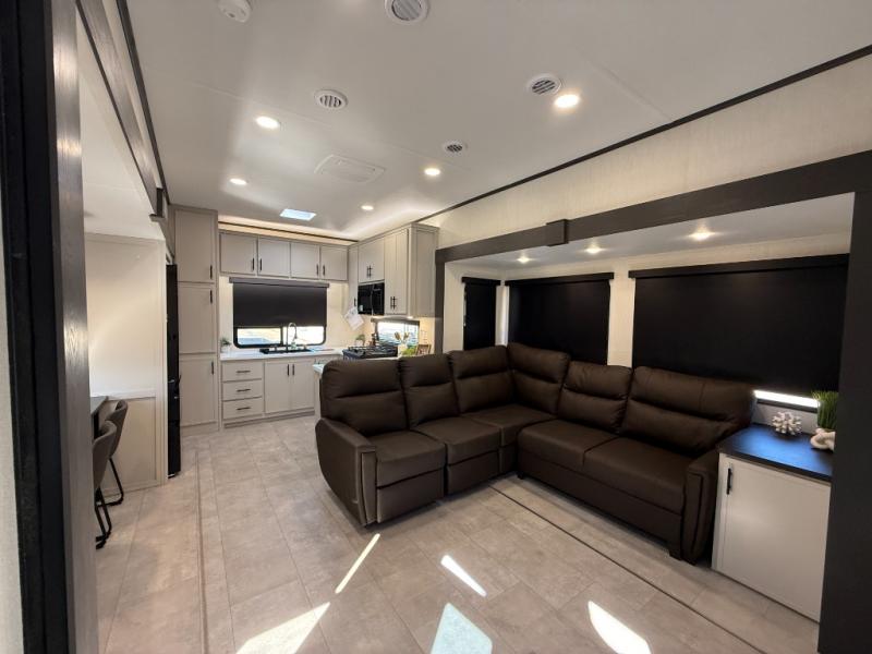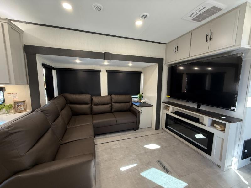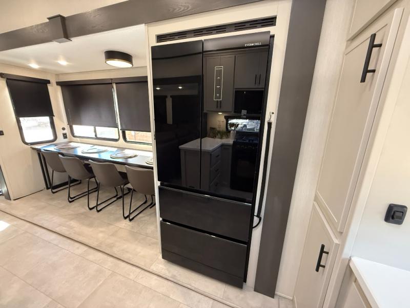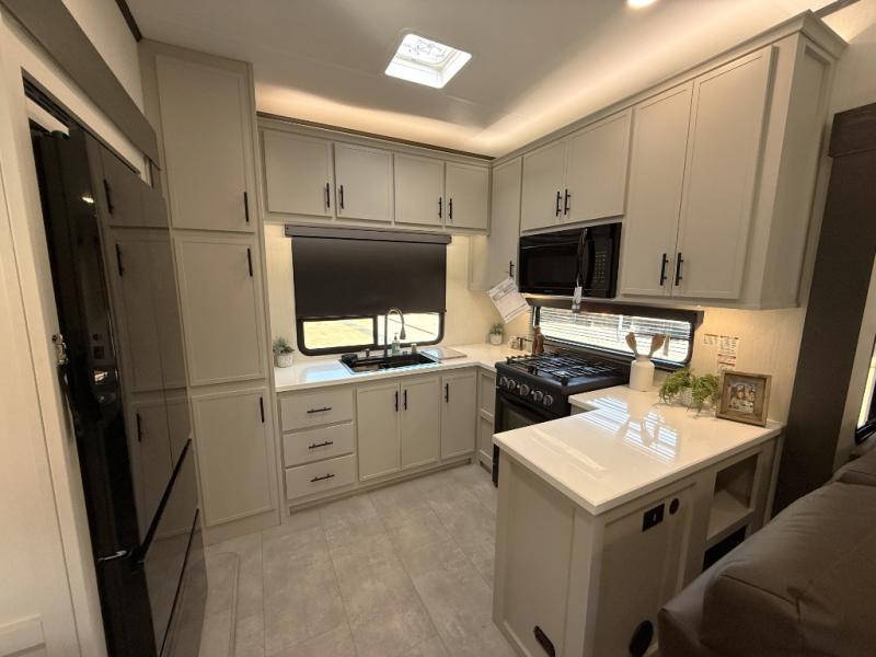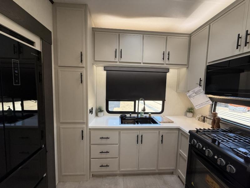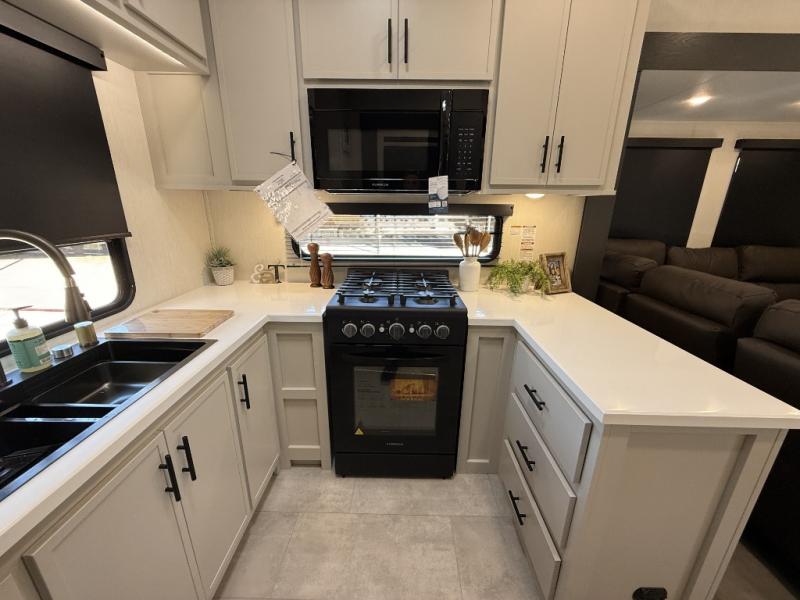 If you enjoy camping with family or friends, this fifth wheel is sure to meet all of your needs! The front bedroom includes a King bed slide out for more space and comfort, plus a front wardrobe/washer and dryer prep. And the full bath is right next door for easy nighttime use. The living room is made spacious thanks to the dual opposing slides, and you'll find a sectional sleeper sofa here, as well as a hybrid desk/dinette, perfect for a quick meal and to catch up with some emails. And don't overlook the rear kitchen with ample counter space, a four burner range, an accessory sink and a French door 12V refrigerator!