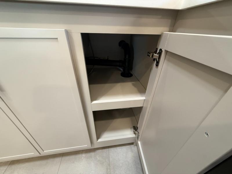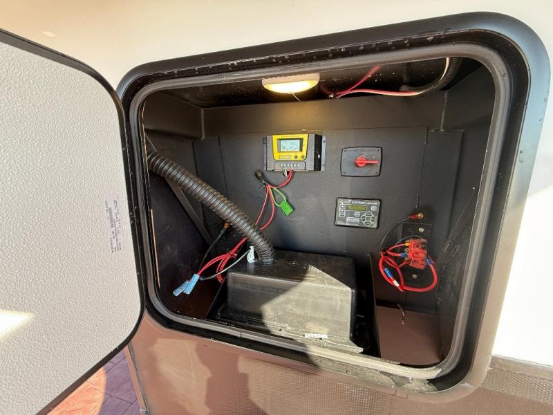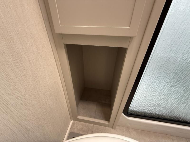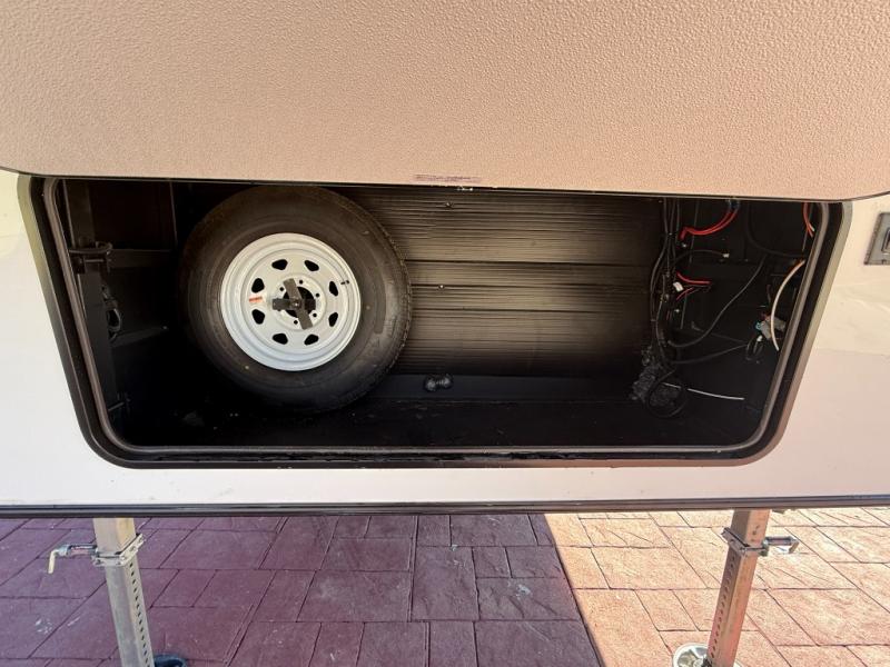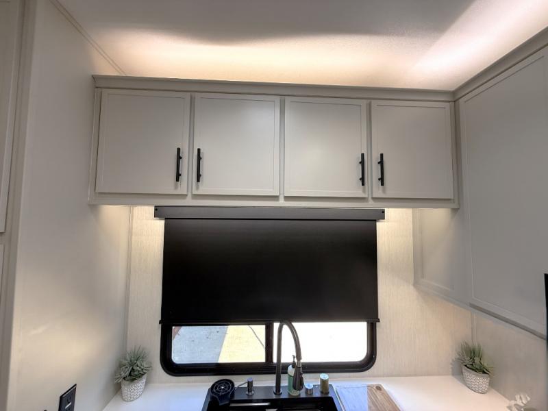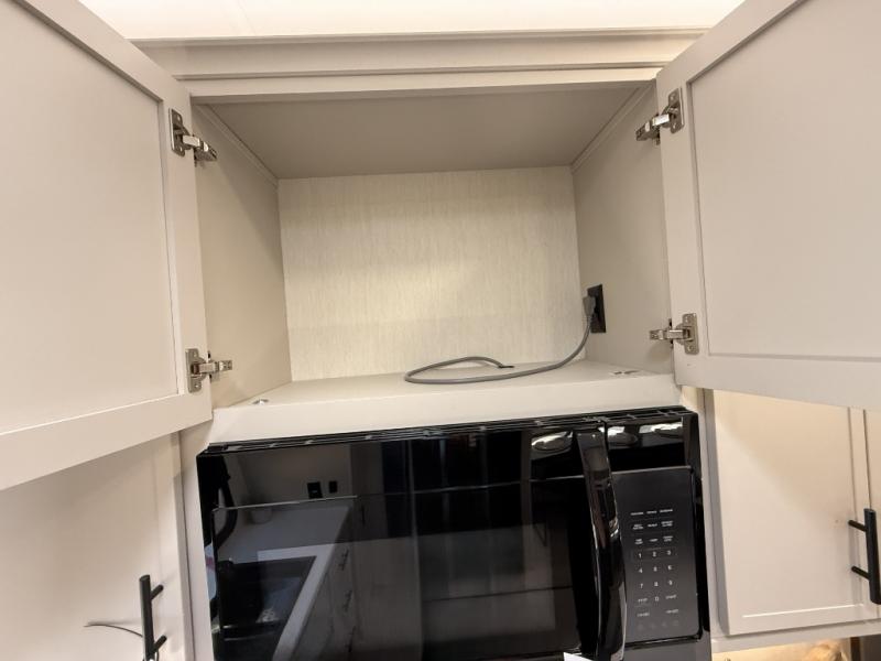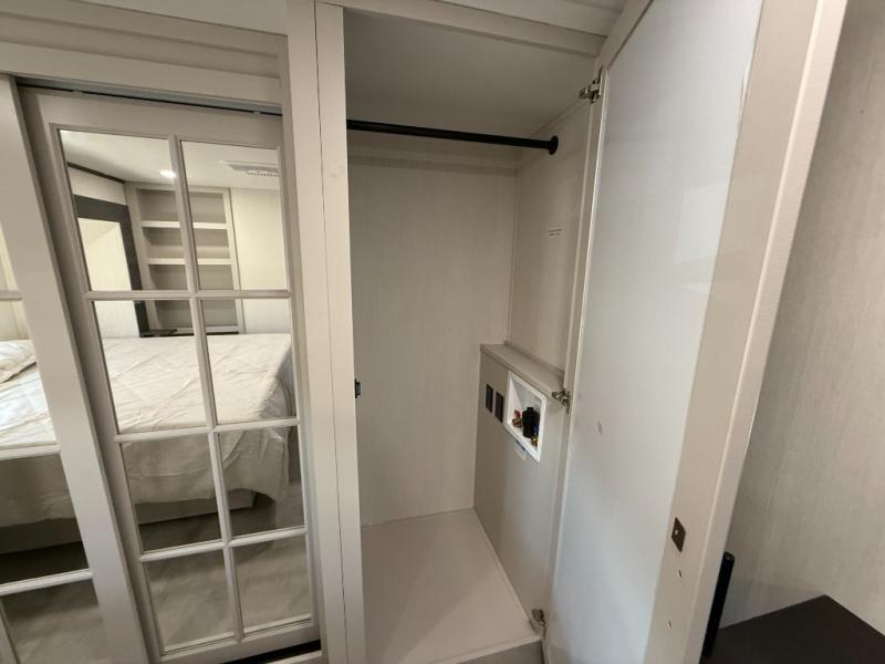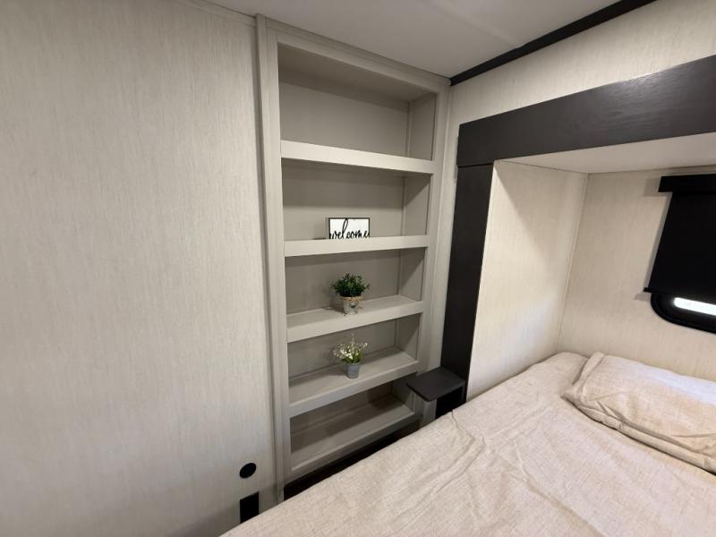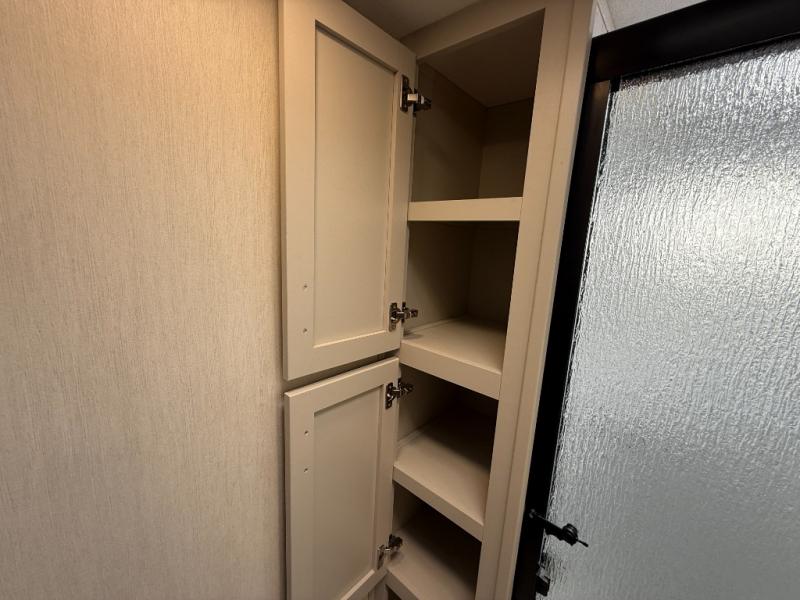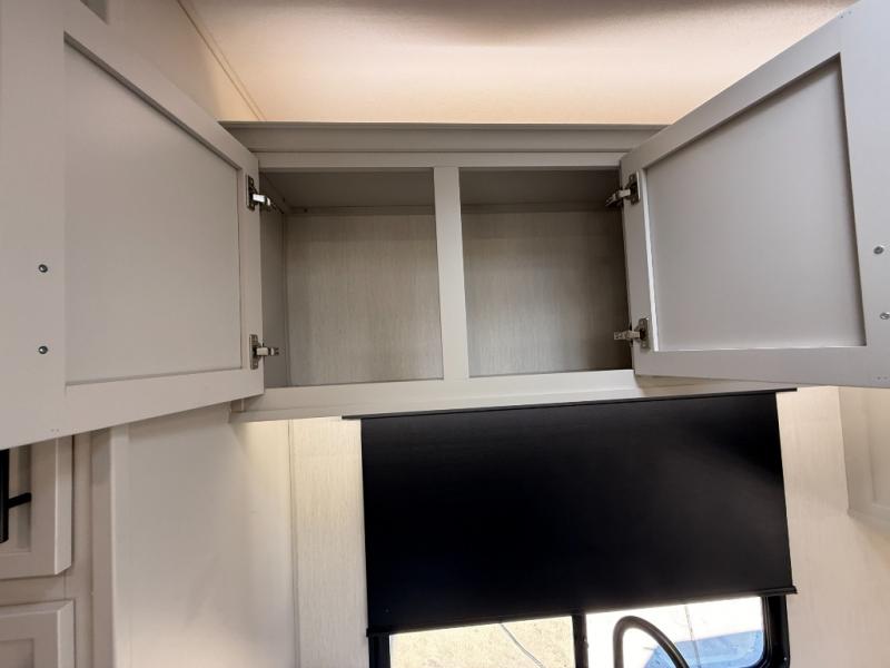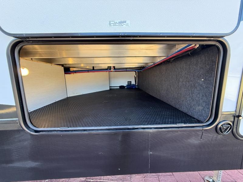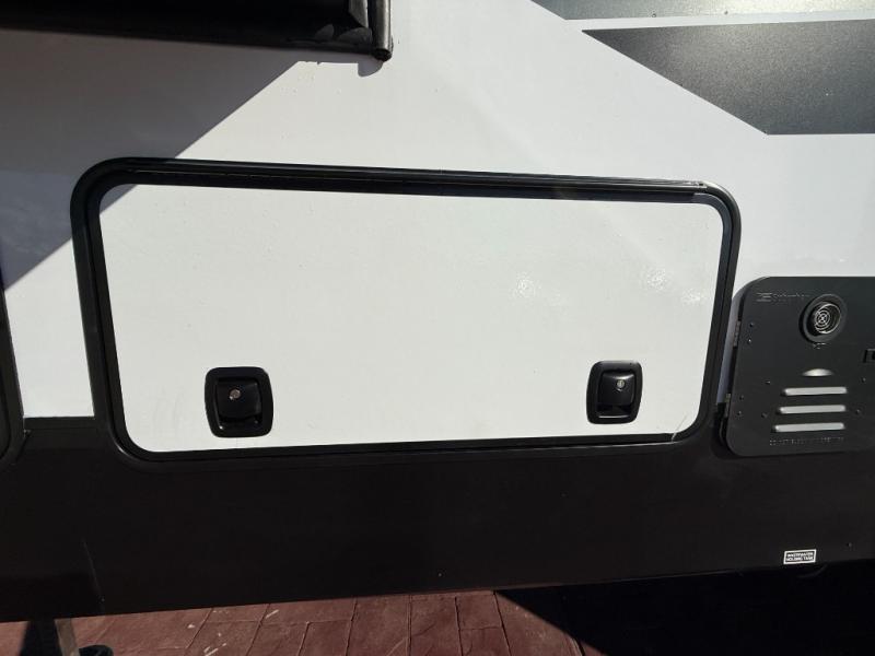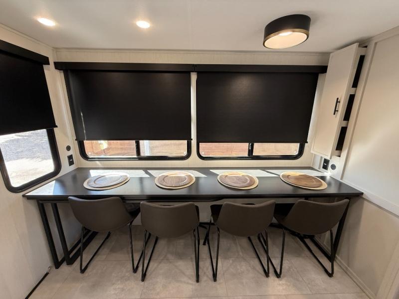 If you enjoy camping with family or friends, this fifth wheel is sure to meet all of your needs! The front bedroom includes a King bed slide out for more space and comfort, plus a front wardrobe/washer and dryer prep. And the full bath is right next door for easy nighttime use. The living room is made spacious thanks to the dual opposing slides, and you'll find a sectional sleeper sofa here, as well as a hybrid desk/dinette, perfect for a quick meal and to catch up with some emails. And don't overlook the rear kitchen with ample counter space, a four burner range, an accessory sink and a French door 12V refrigerator!