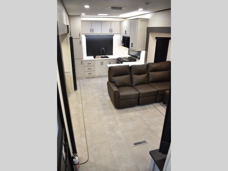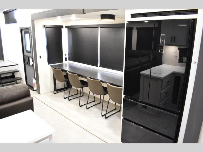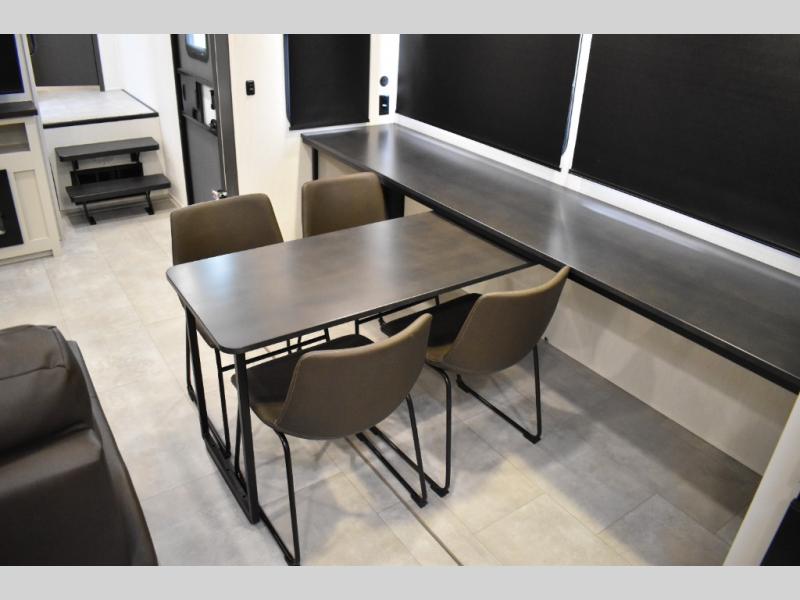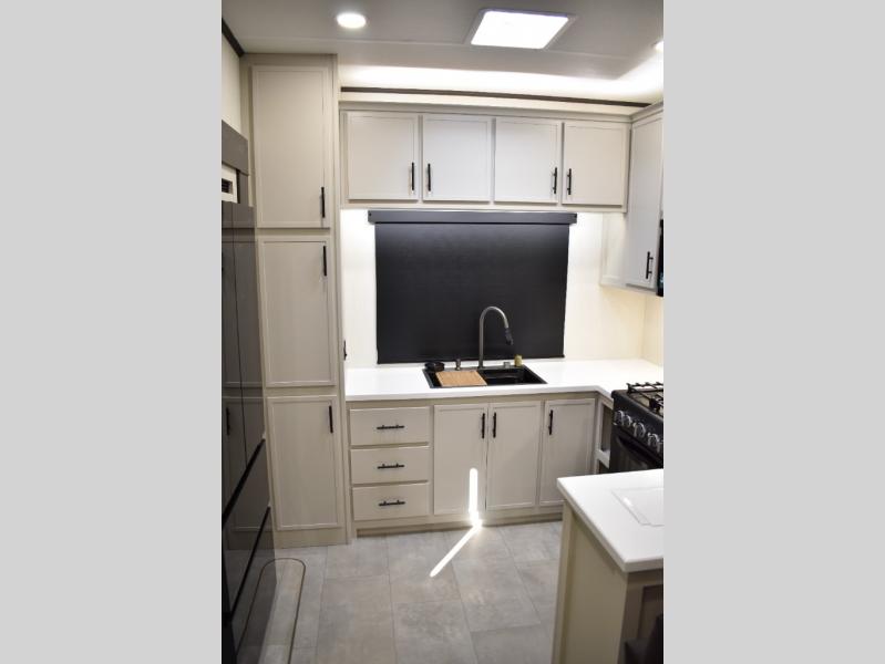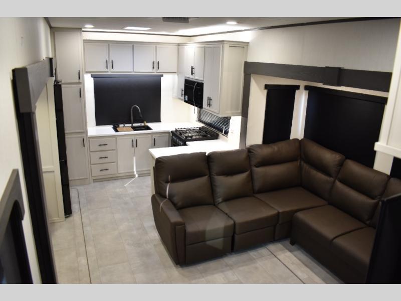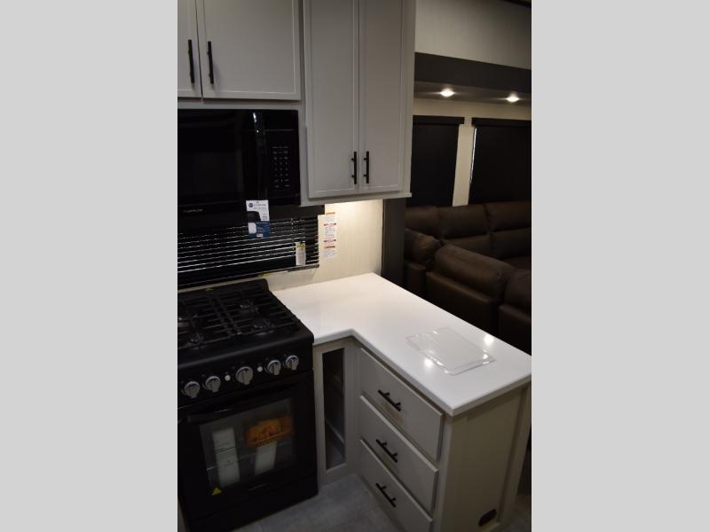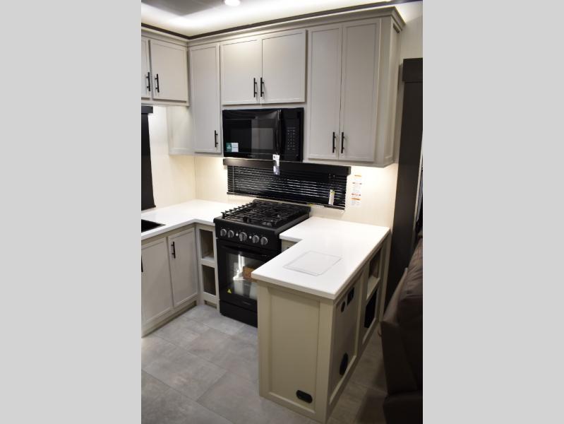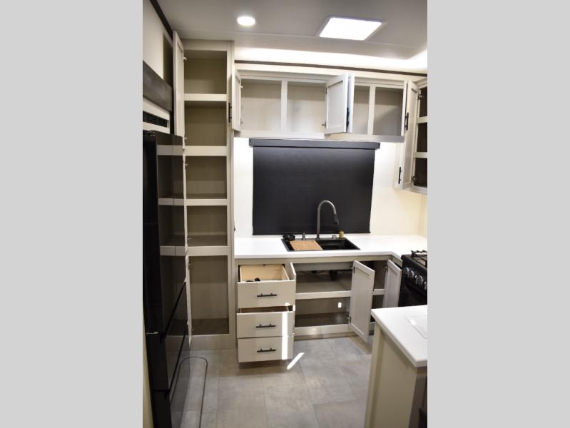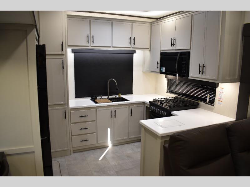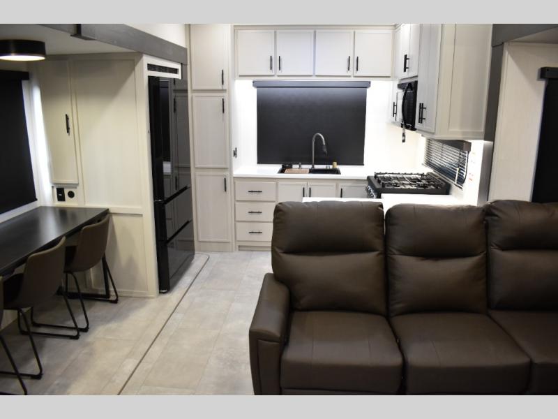 If you enjoy camping with family or friends, this fifth wheel is sure to meet all of your needs! The front bedroom includes a King bed slide out for more space and comfort, plus a front wardrobe/washer and dryer prep. And the full bath is right next door for easy nighttime use. The living room is made spacious thanks to the dual opposing slides, and you'll find a sectional sleeper sofa here, as well as a hybrid desk/dinette, perfect for a quick meal and to catch up with some emails. And don't overlook the rear kitchen with ample counter space, a four burner range, an accessory sink and a French door 12V refrigerator!
