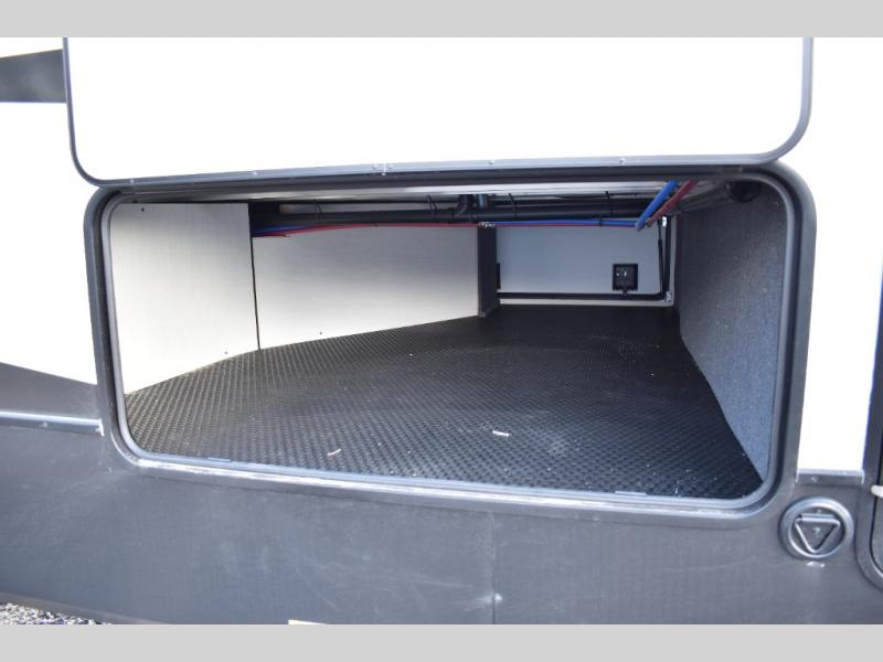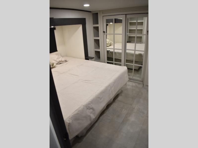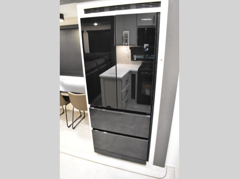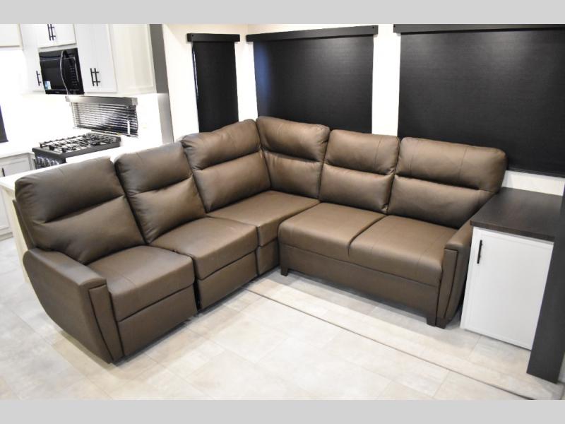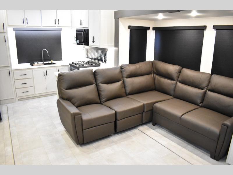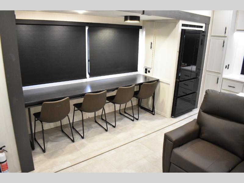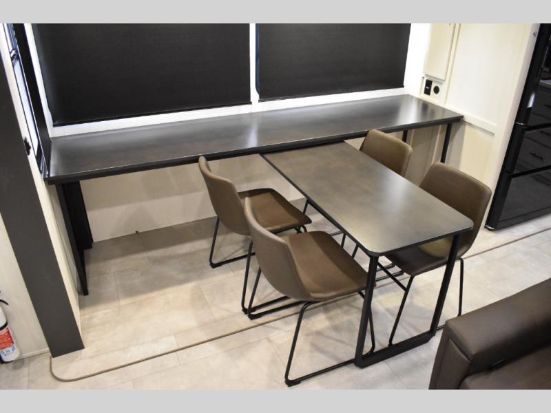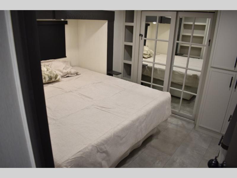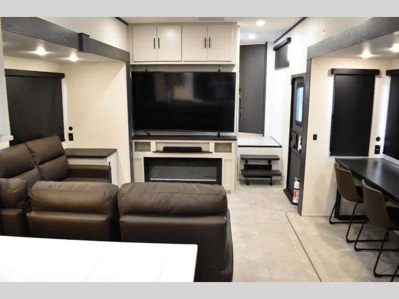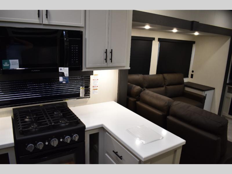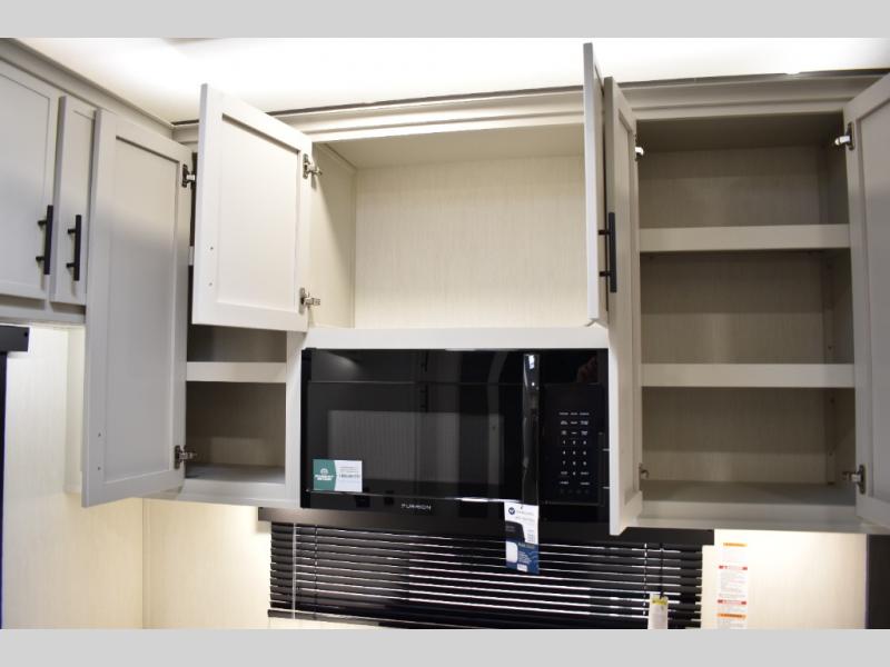 If you enjoy camping with family or friends, this fifth wheel is sure to meet all of your needs! The front bedroom includes a King bed slide out for more space and comfort, plus a front wardrobe/washer and dryer prep. And the full bath is right next door for easy nighttime use. The living room is made spacious thanks to the dual opposing slides, and you'll find a sectional sleeper sofa here, as well as a hybrid desk/dinette, perfect for a quick meal and to catch up with some emails. And don't overlook the rear kitchen with ample counter space, a four burner range, an accessory sink and a French door 12V refrigerator!
