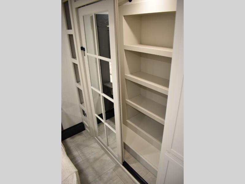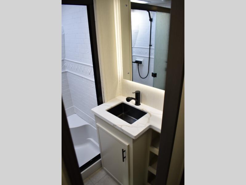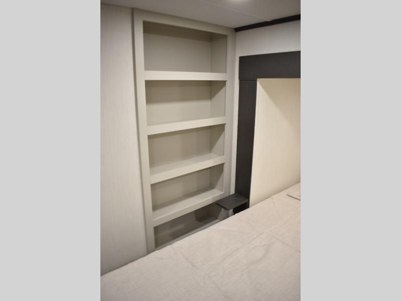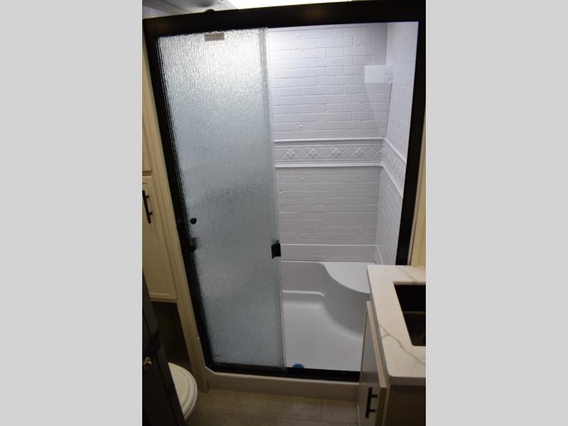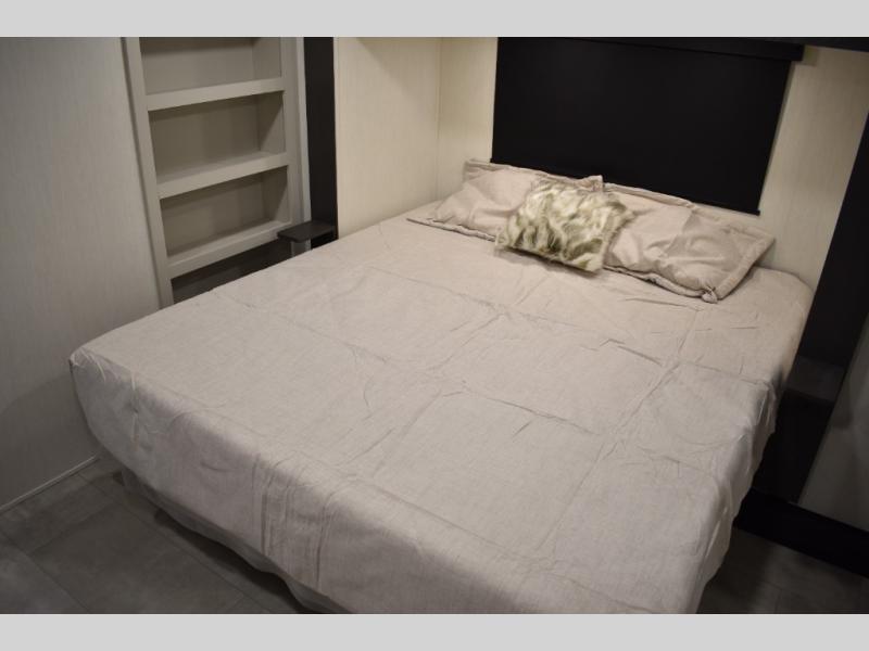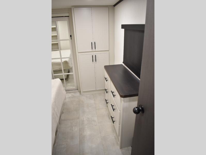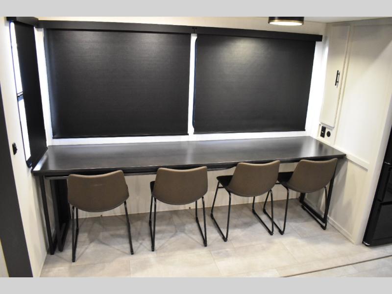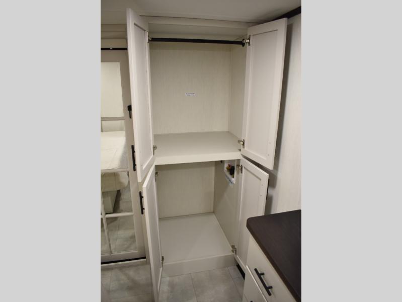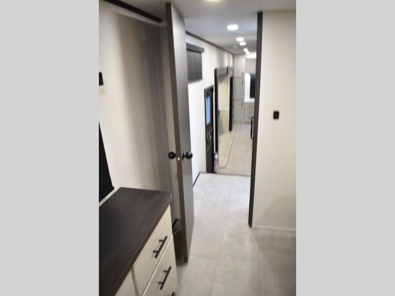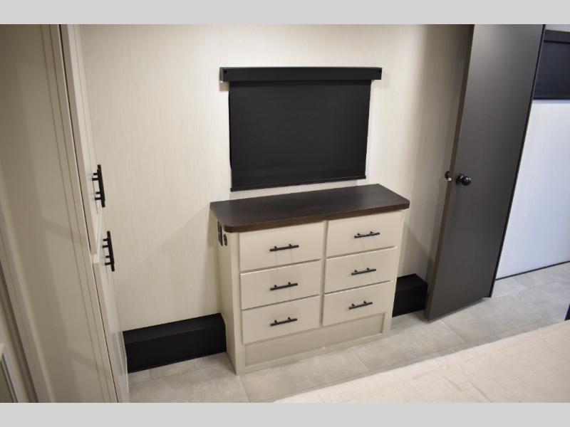 If you enjoy camping with family or friends, this fifth wheel is sure to meet all of your needs! The front bedroom includes a King bed slide out for more space and comfort, plus a front wardrobe/washer and dryer prep. And the full bath is right next door for easy nighttime use. The living room is made spacious thanks to the dual opposing slides, and you'll find a sectional sleeper sofa here, as well as a hybrid desk/dinette, perfect for a quick meal and to catch up with some emails. And don't overlook the rear kitchen with ample counter space, a four burner range, an accessory sink and a French door 12V refrigerator!