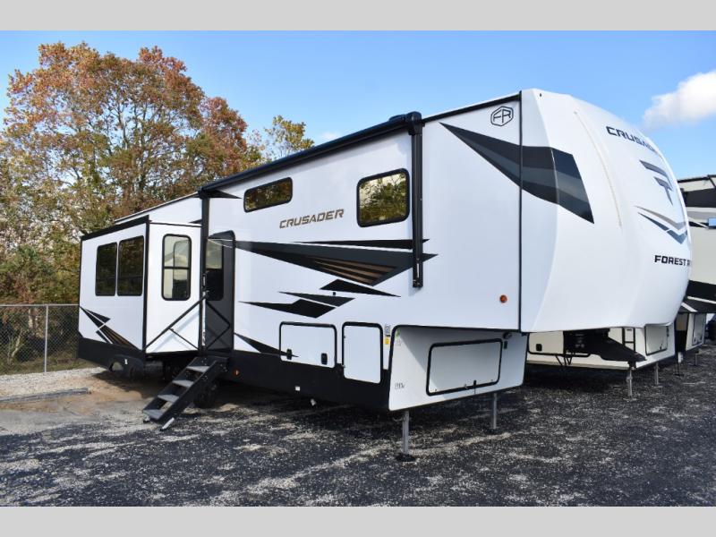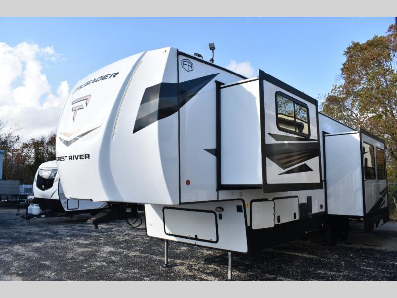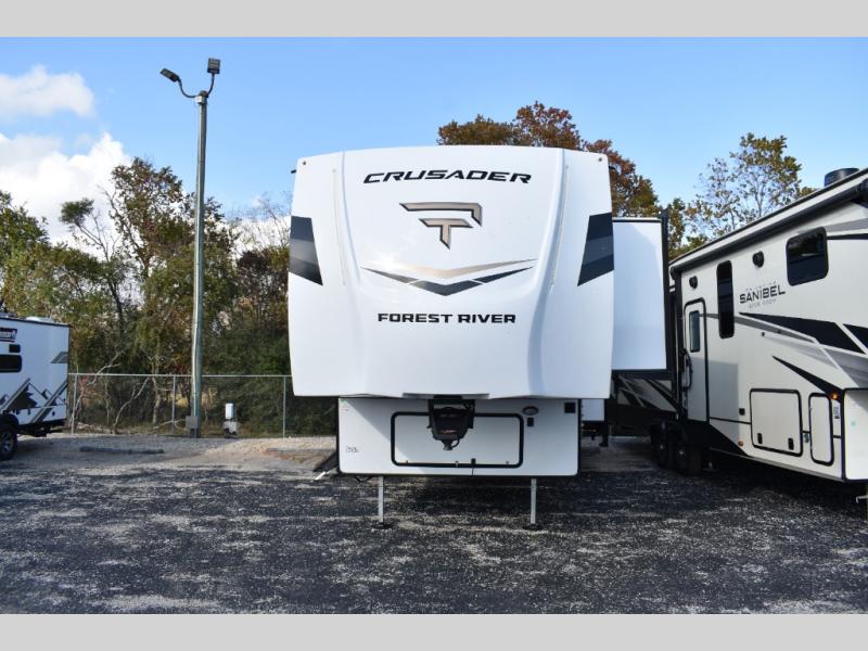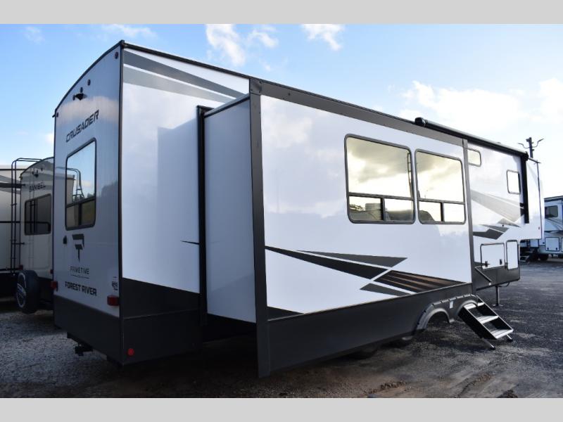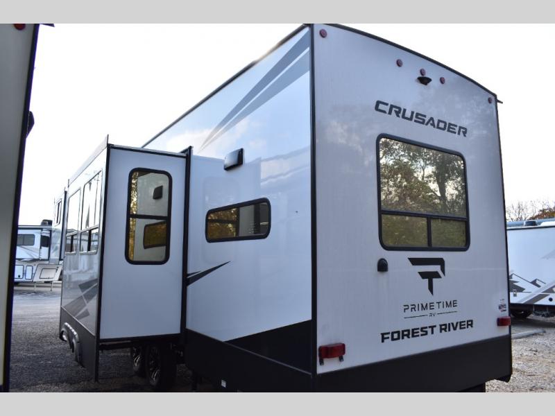 With any Crusader fifth wheel by Prime Time, you will enjoy outstanding quality and premium features! The Dexter E-Z Flex rubberized suspension equalizer will help make towing smoother than ever, and the high gloss gel coated exterior fiberglass is sure to be eye-catching. There are also thick insulated pass-through storage baggage doors outside, along with a 102" wide body, and hassle-free one-touch auto leveling. Inside, you'll find real wood cabinet doors, carpet-less slide rooms, blackout roller shades, and stain resistant, easy clean furniture. The Crusader fifth wheels are built with Eternabond construction, a one-piece PVC roof membrane, radiant foil insulation, plus rack and pinion slide systems.
